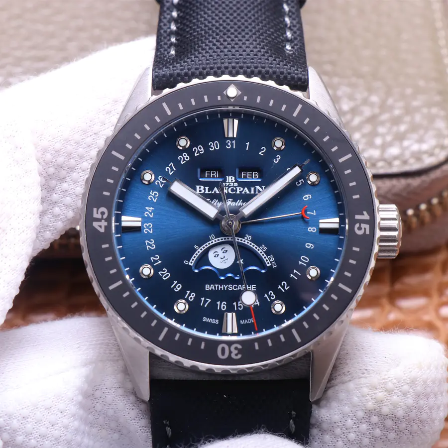 TW最新力作 宝.铂五十寻系列,5054-1110-B52A。压轴巨献,大三针夜光设计,直径43毫米,厚度13.3毫米!搭载6654.P自动机械机芯,具备星期显示,日期显示。月份显示,年份显示,月相显示,壳身轮廓分明,线条清晰决绝。优雅、律动之下隐藏着刚毅成熟的美。满足运动,商务,多功能性佩戴。定让君能依芯所向!TW诚意之作 值得你拥有!
