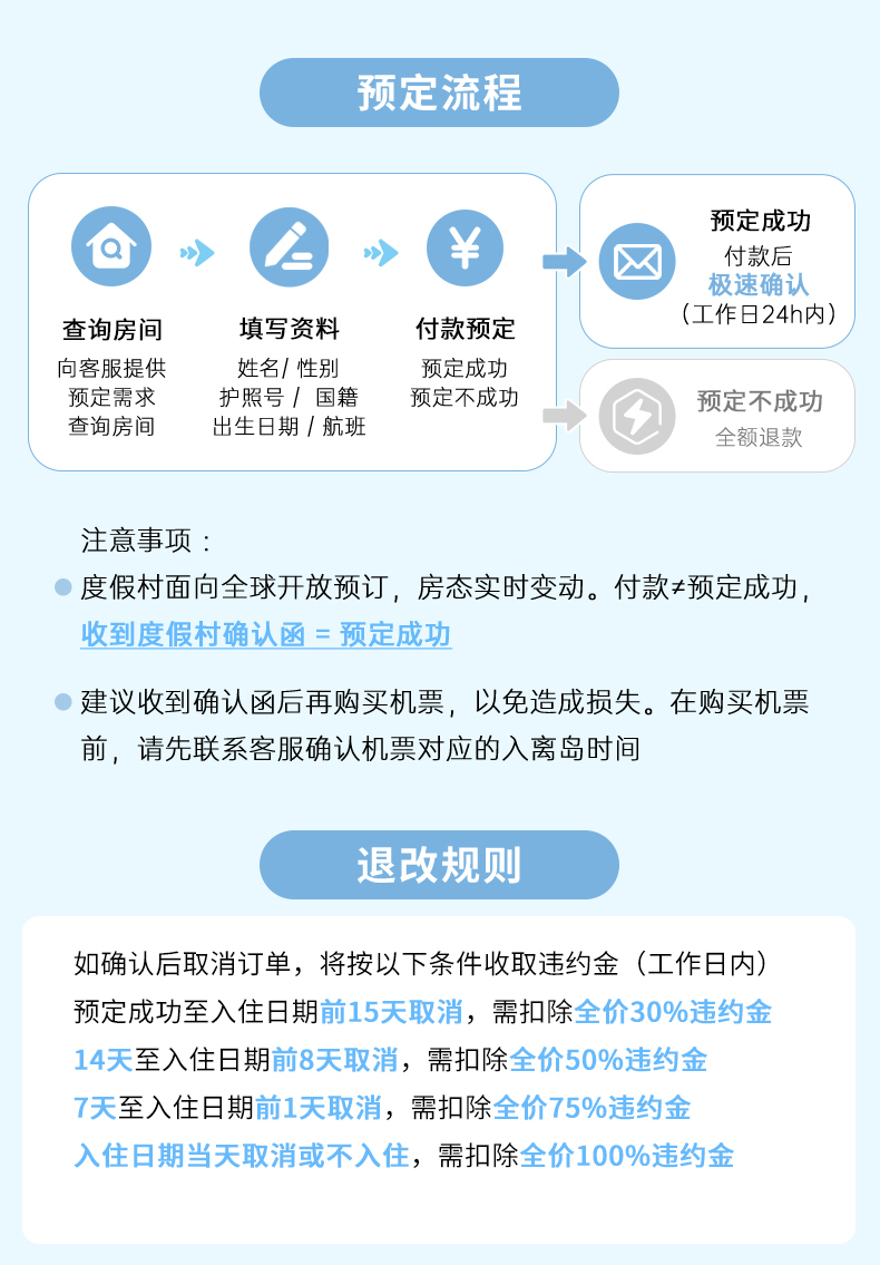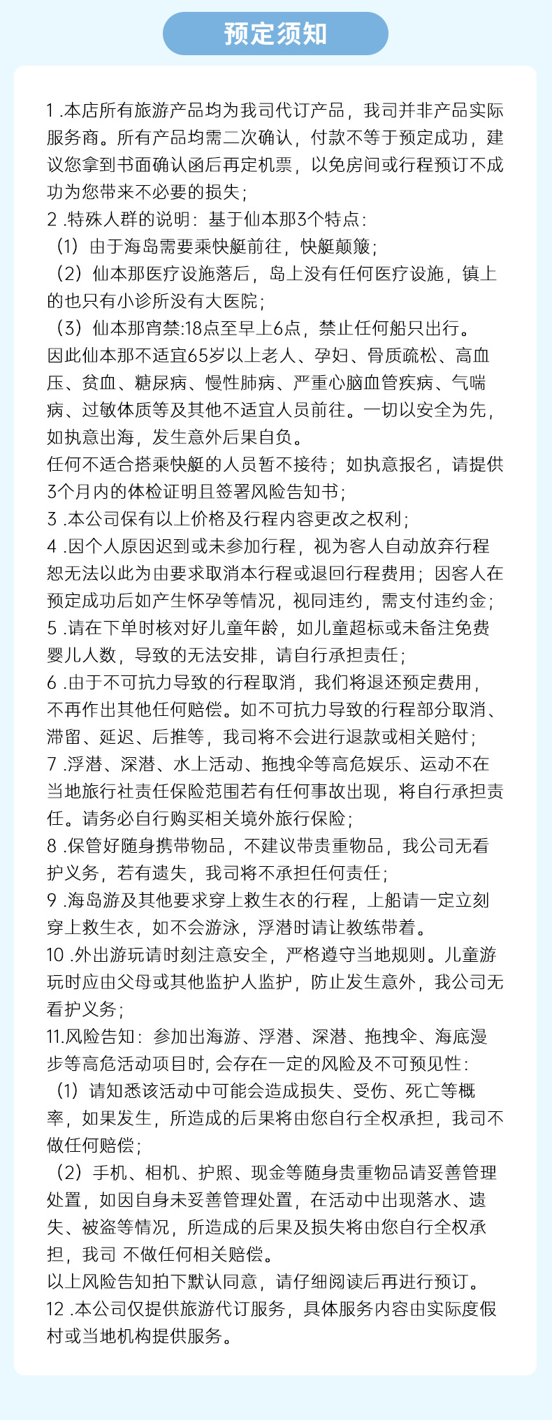 12. 本公司仅提供旅游代订服务,具体服务内容由实际度假村或当地机构提供服务