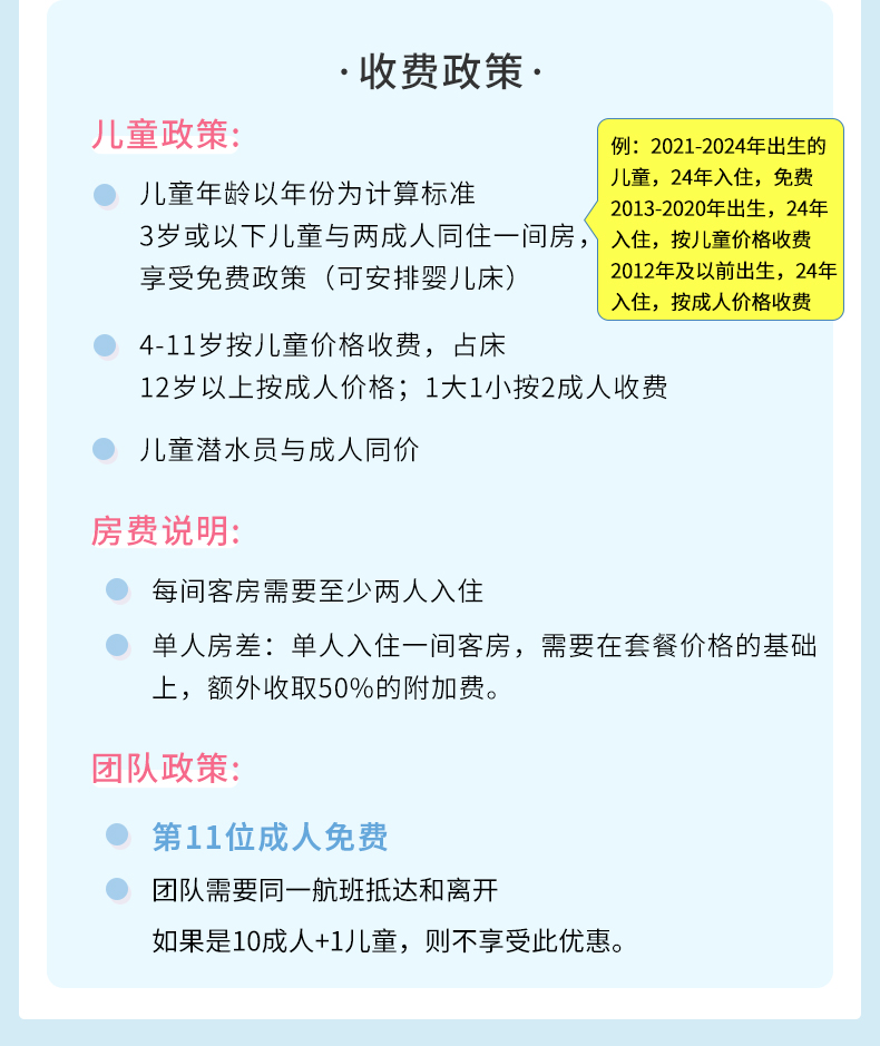 5. 请在下单时核对好儿童年龄,如儿童超标或未备注免费婴儿人数,导致的无法安排,请自行承担责任;