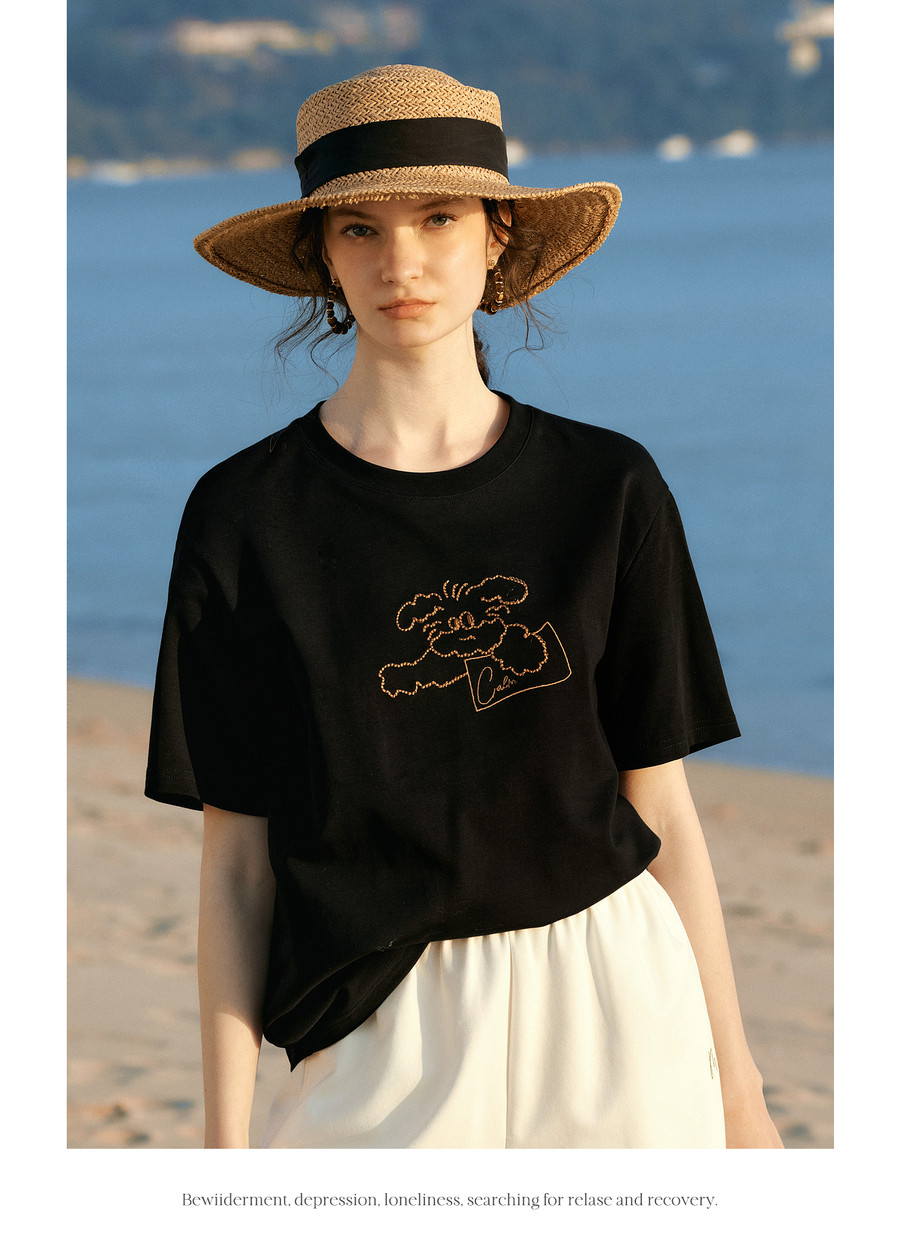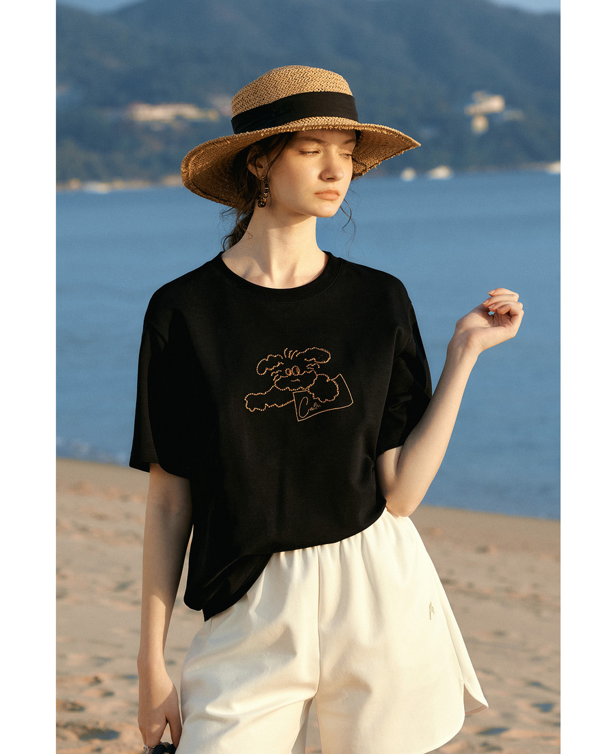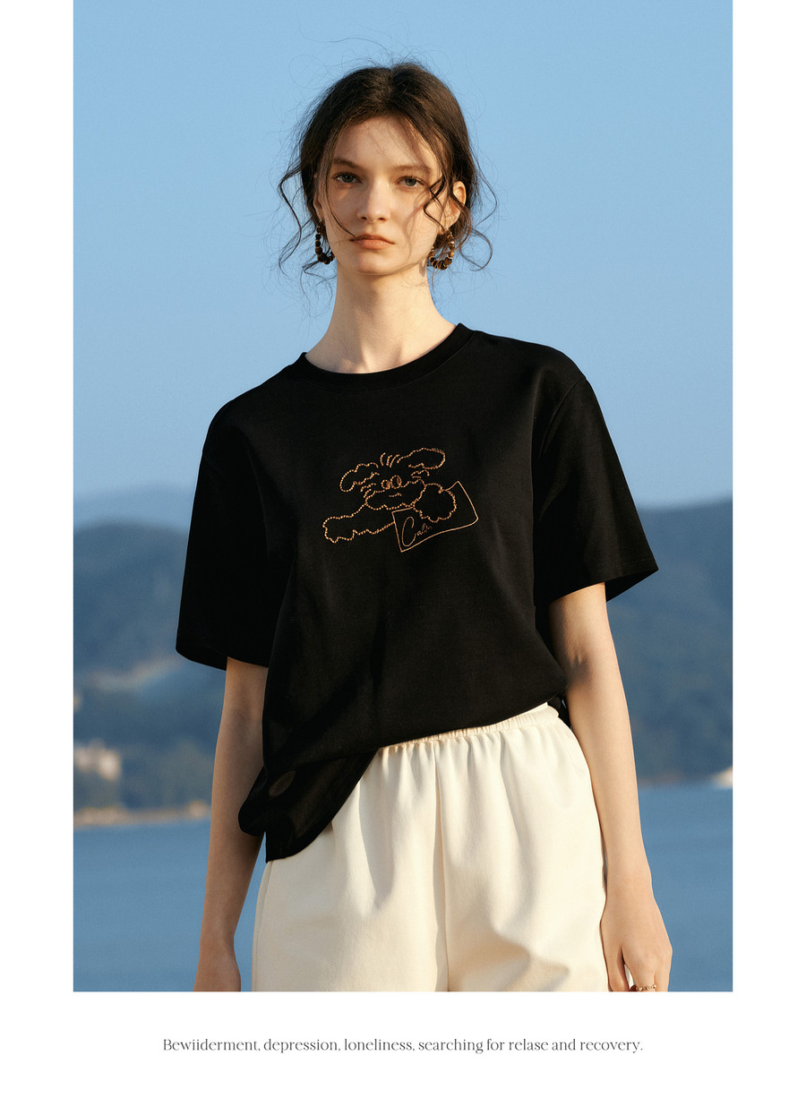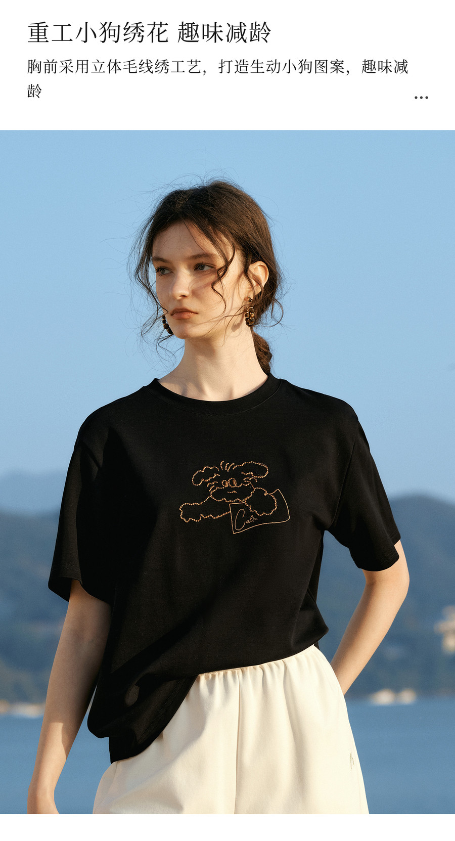 欧芮儿2026年新款夏季女黑色休闲小狗刺绣设计感圆领宽松短袖T恤
