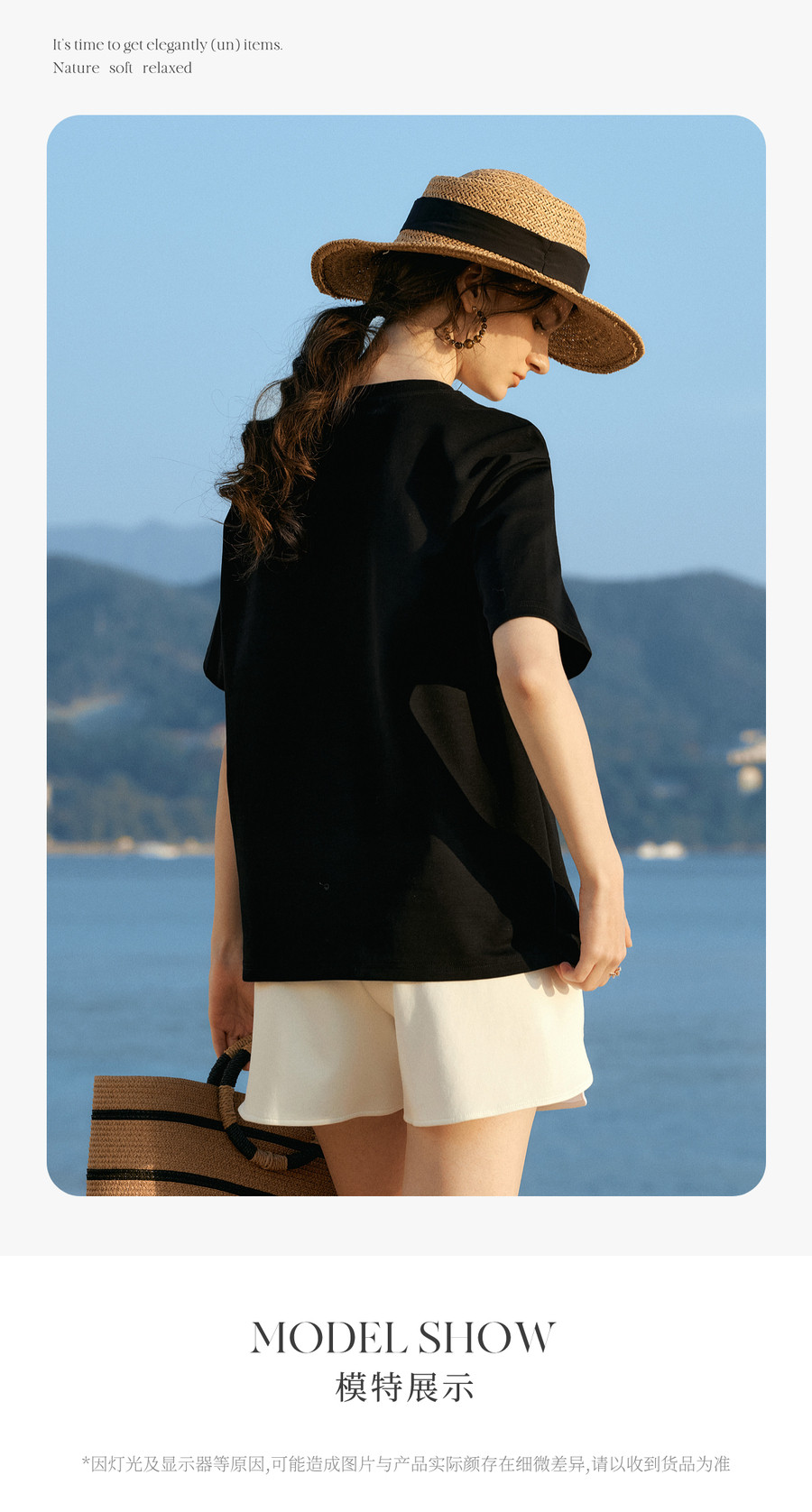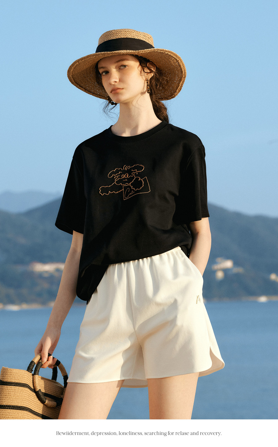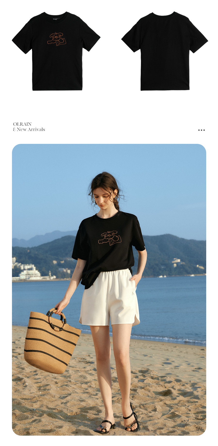 欧芮儿2026年新款夏季女黑色休闲小狗刺绣设计感圆领宽松短袖T恤