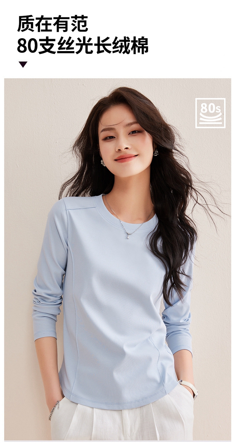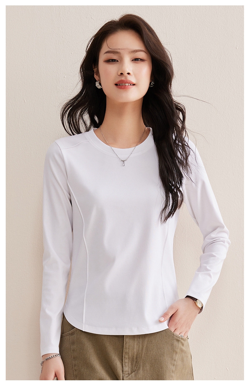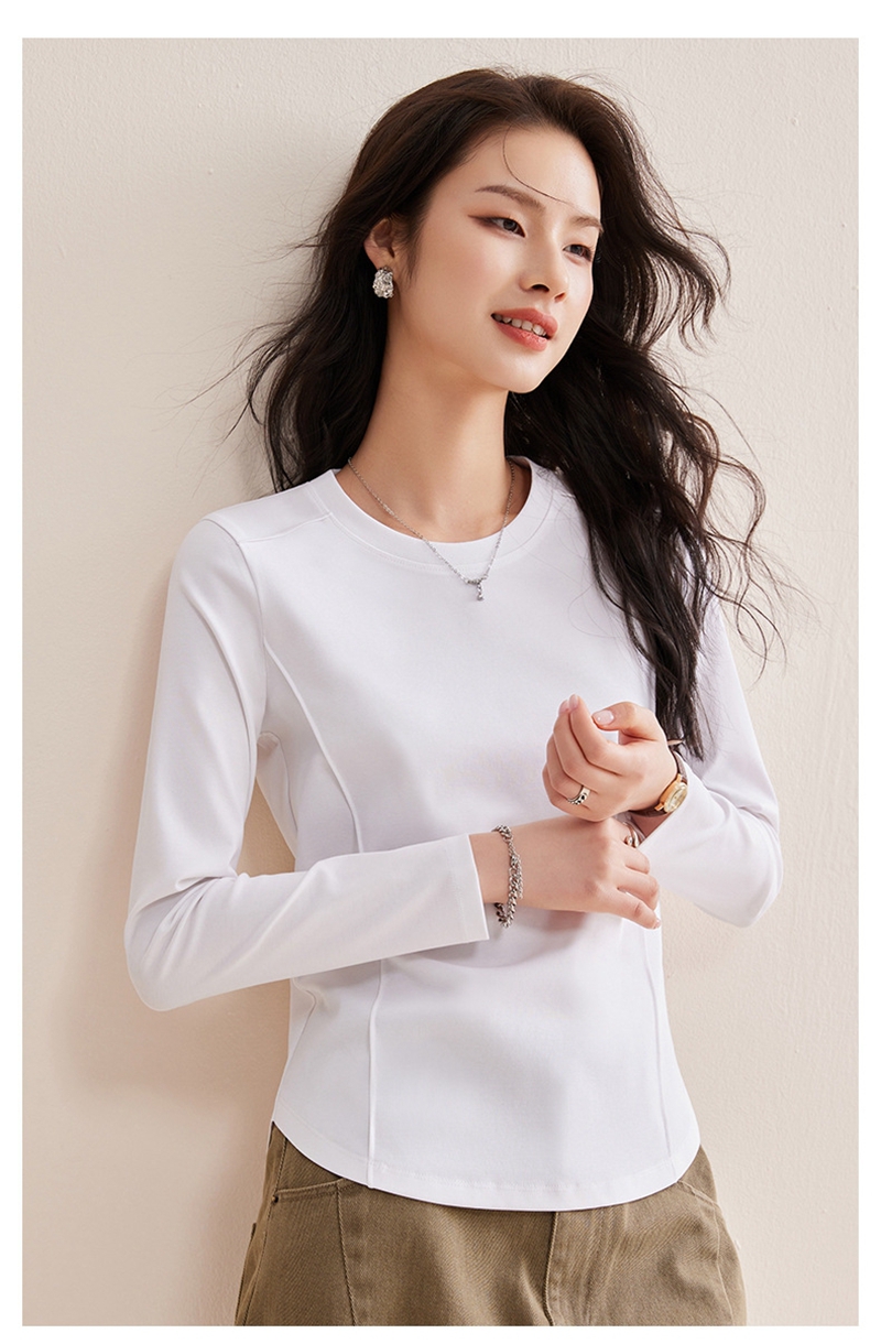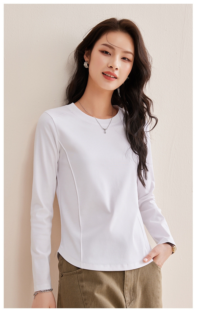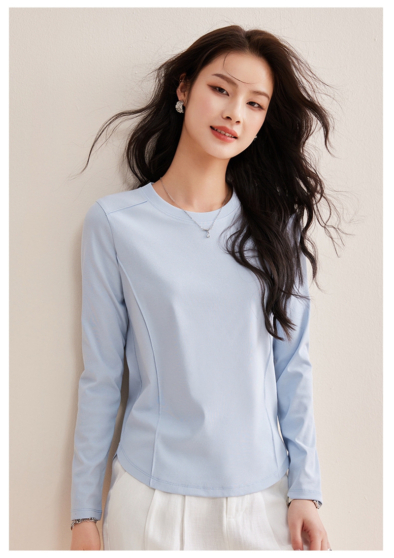 时尚圆领长袖鱼骨分割圆弧下摆T恤