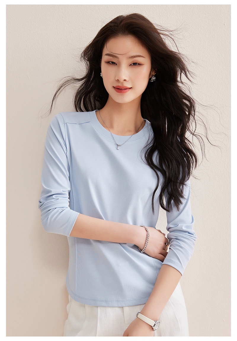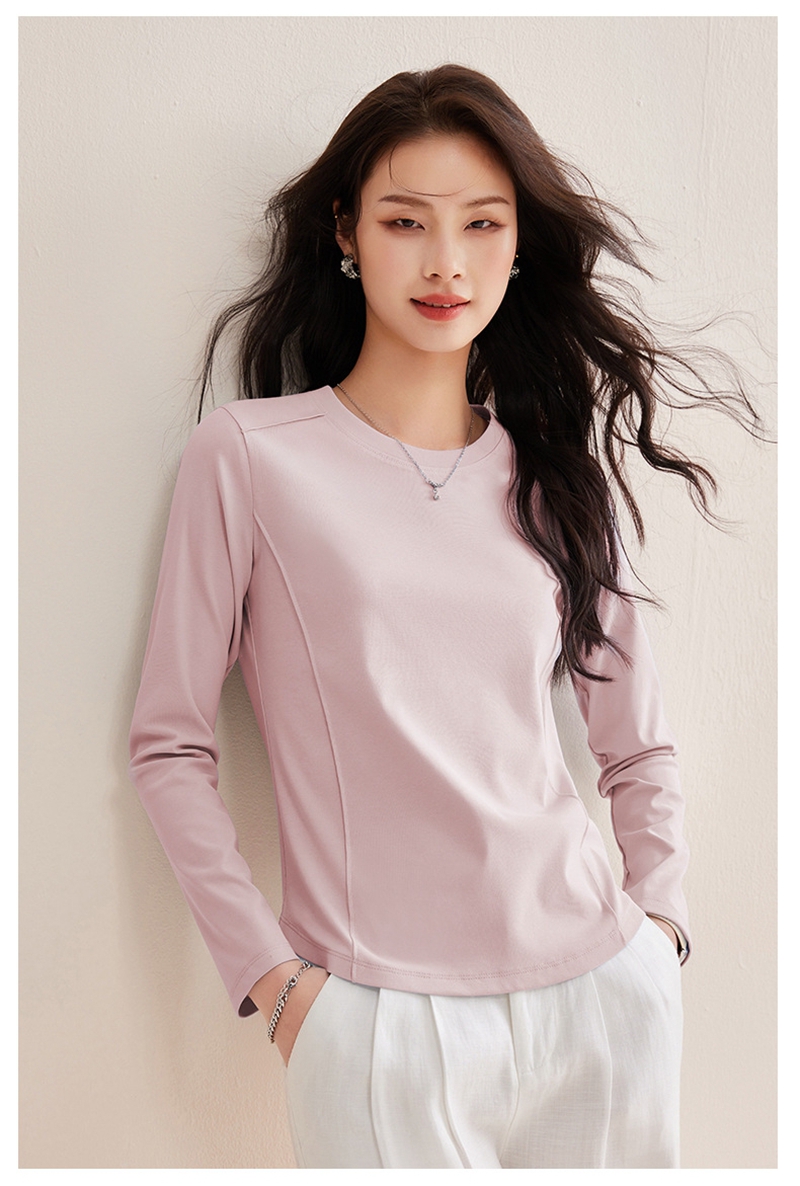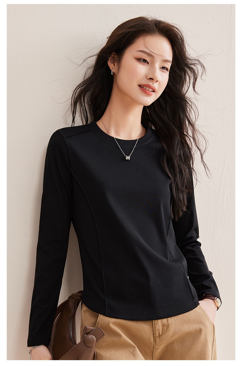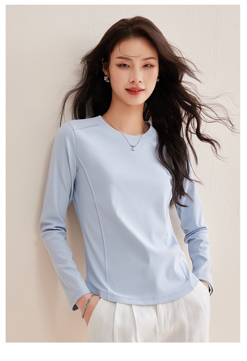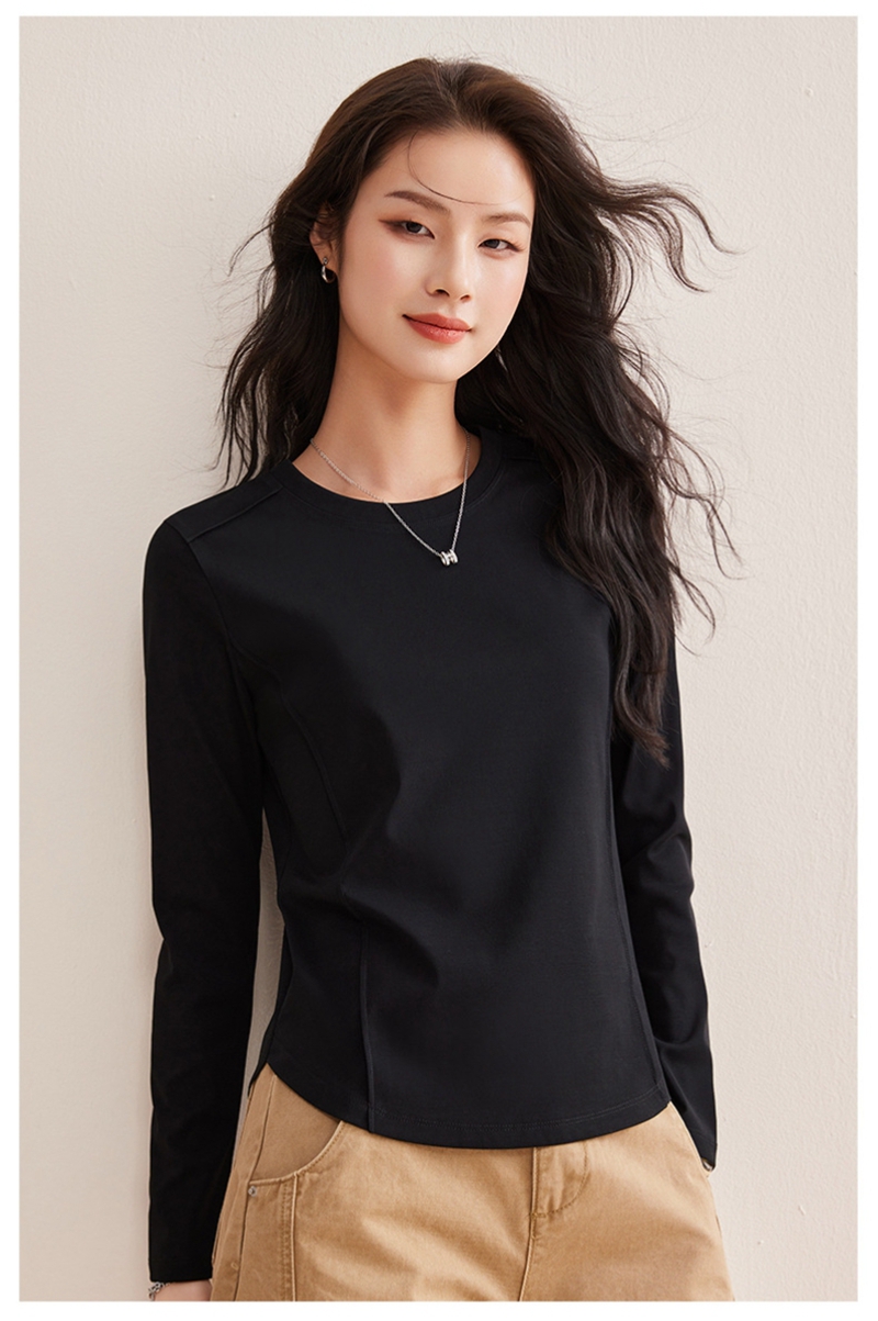 时尚圆领长袖鱼骨分割圆弧下摆T恤