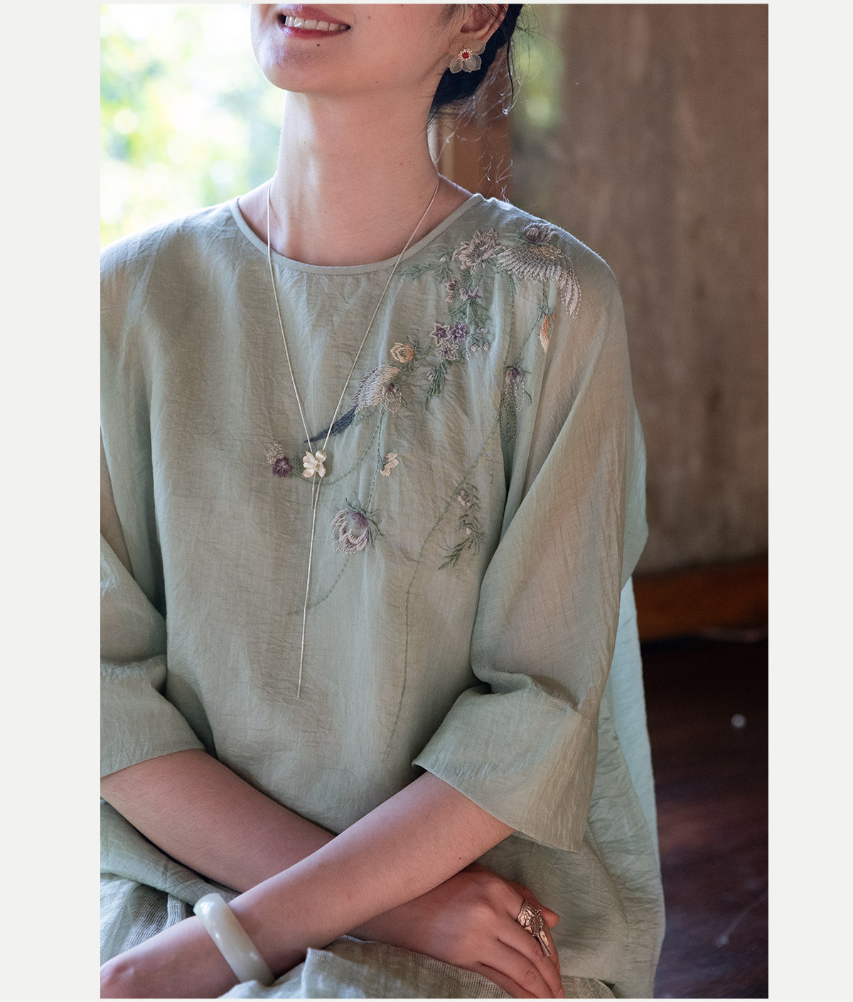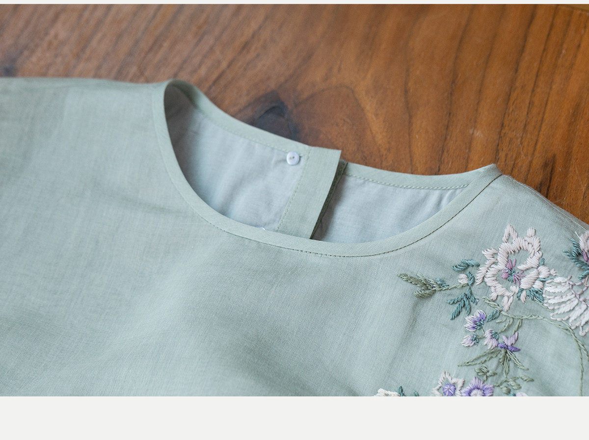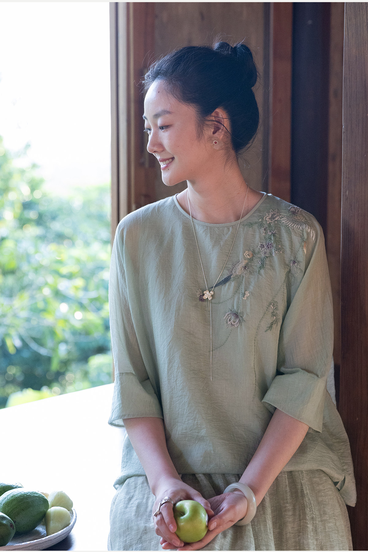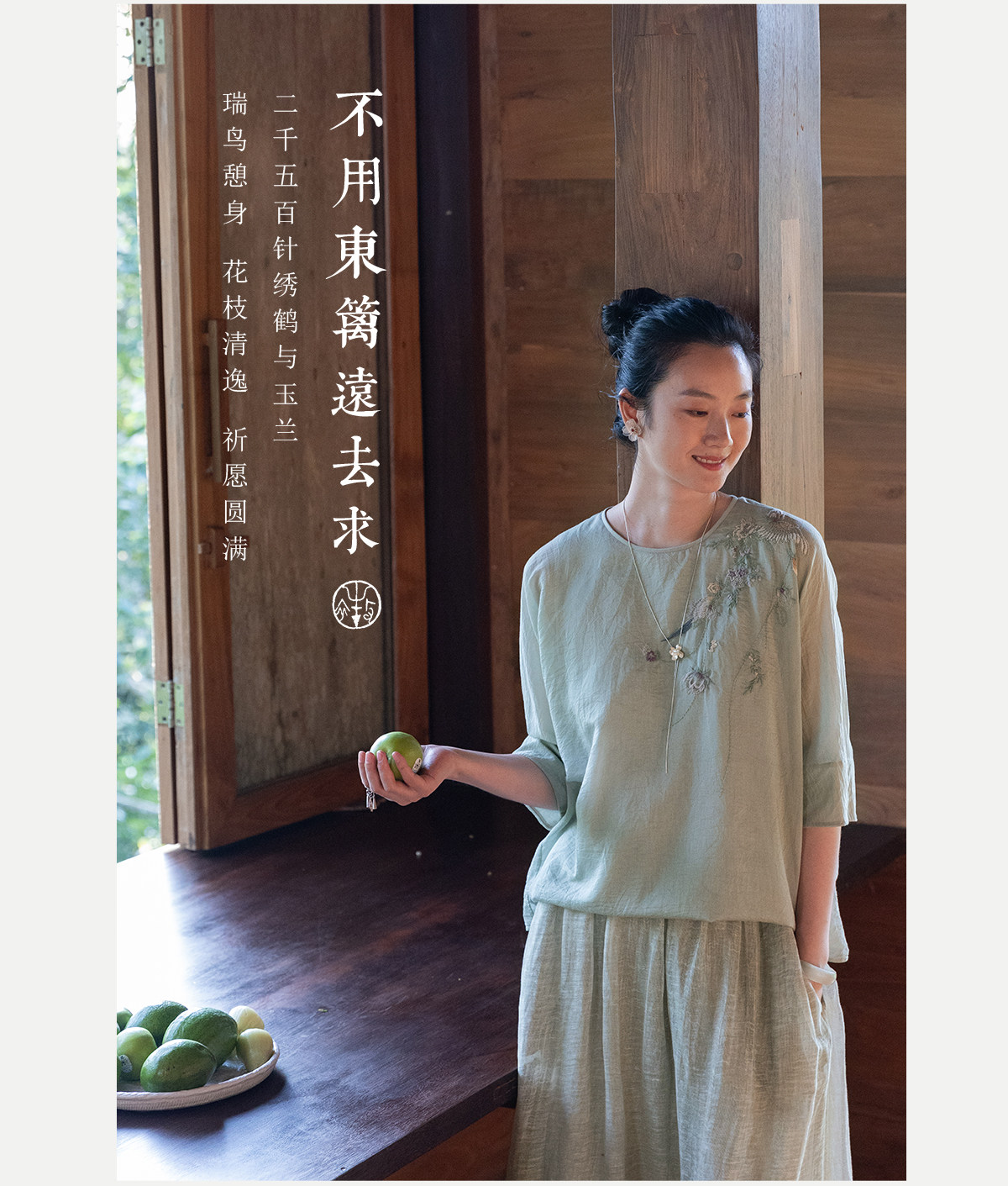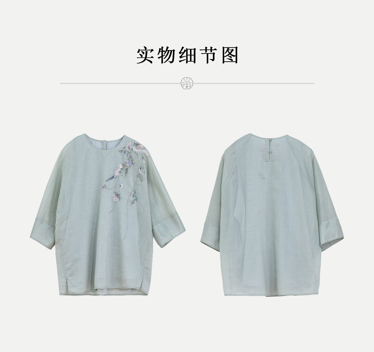 牧衣游原创 丝棉手工刺绣小衫女新款古朴禅意七分袖圆领上衣 素笺