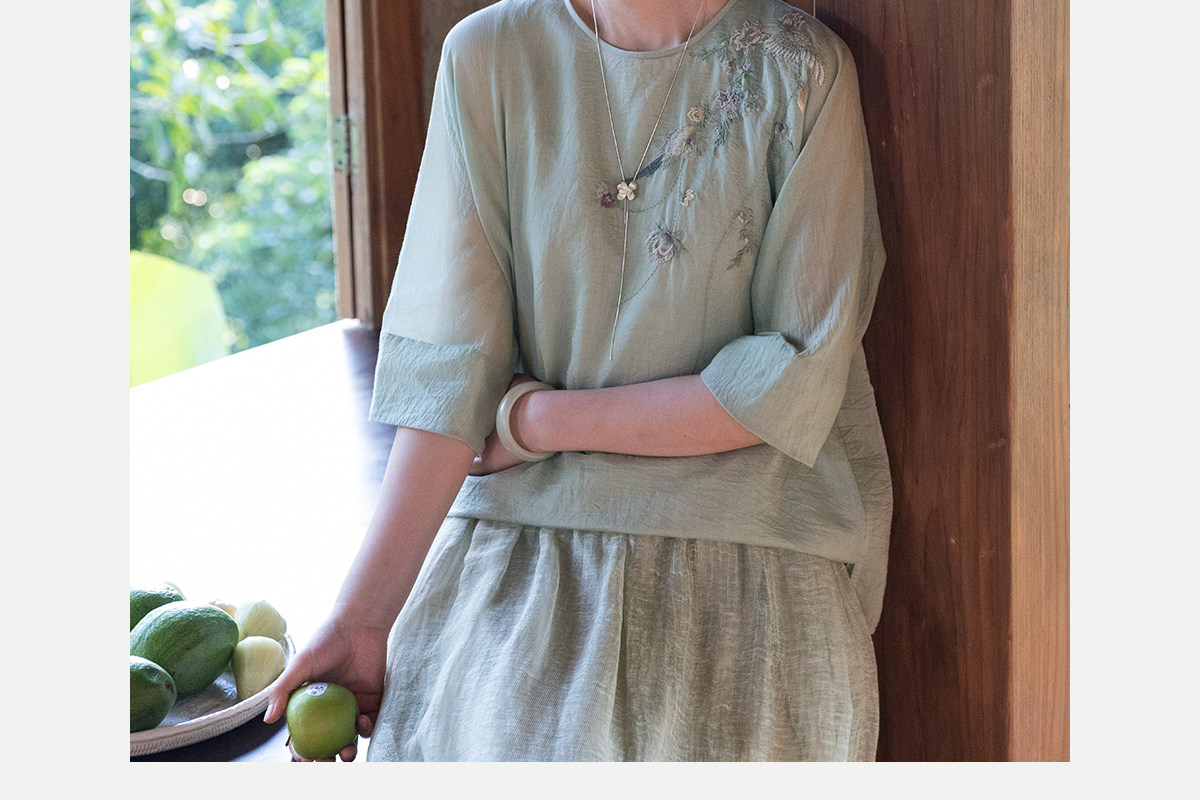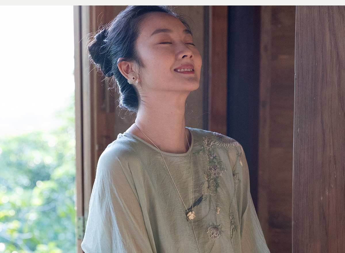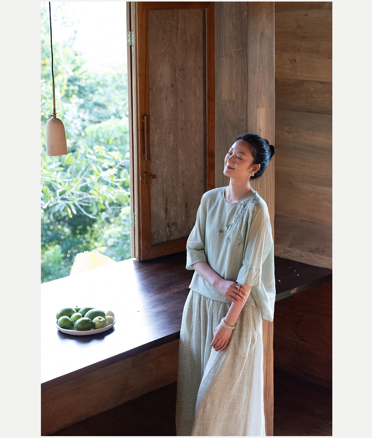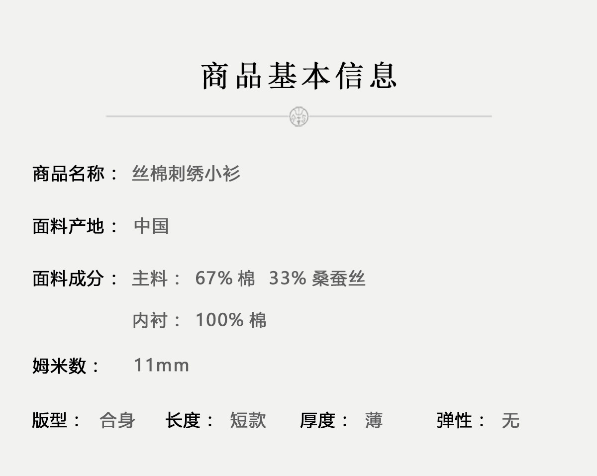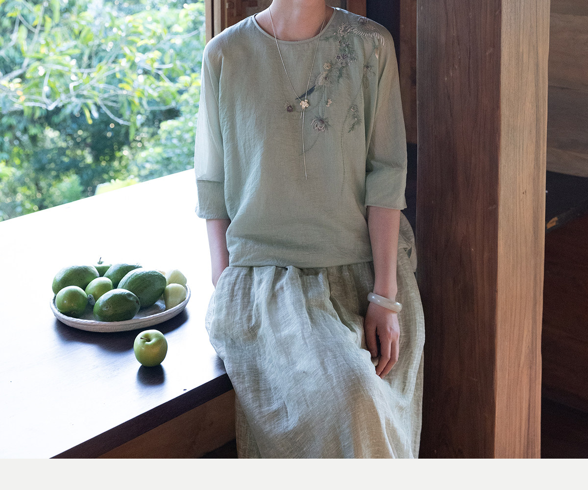 牧衣游原创 丝棉手工刺绣小衫女新款古朴禅意七分袖圆领上衣 素笺