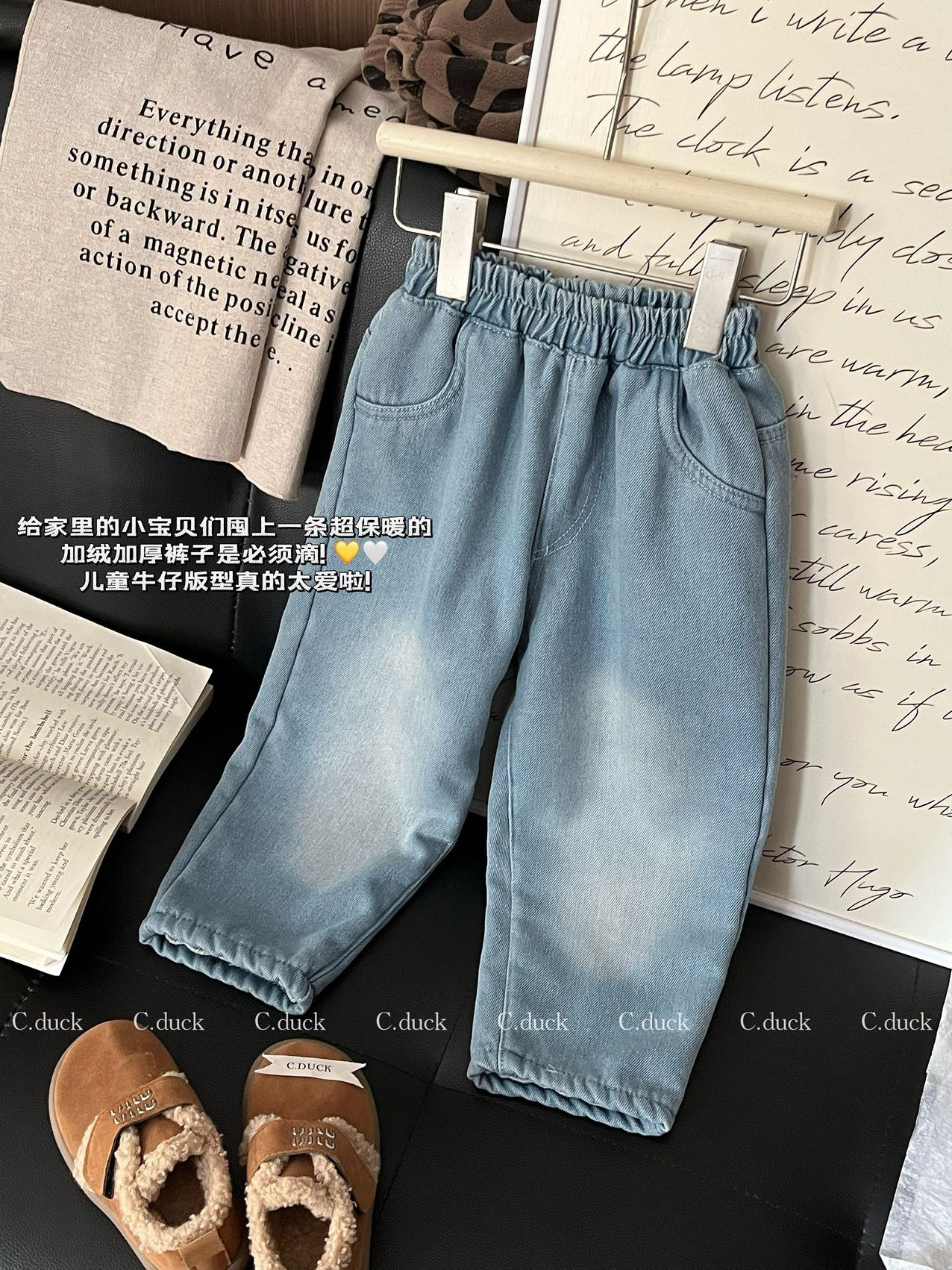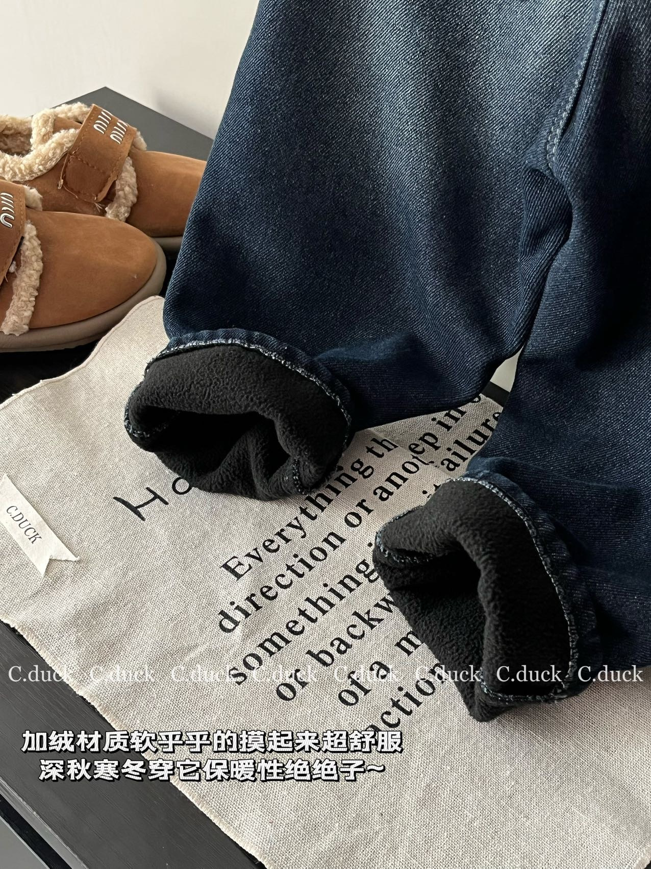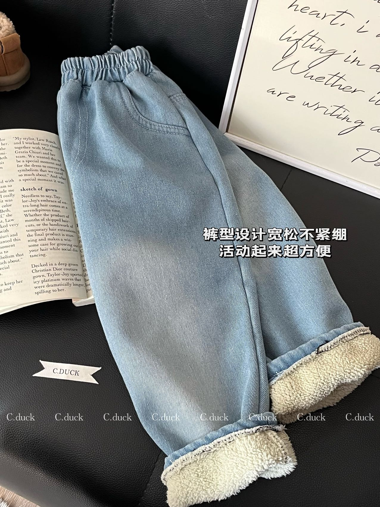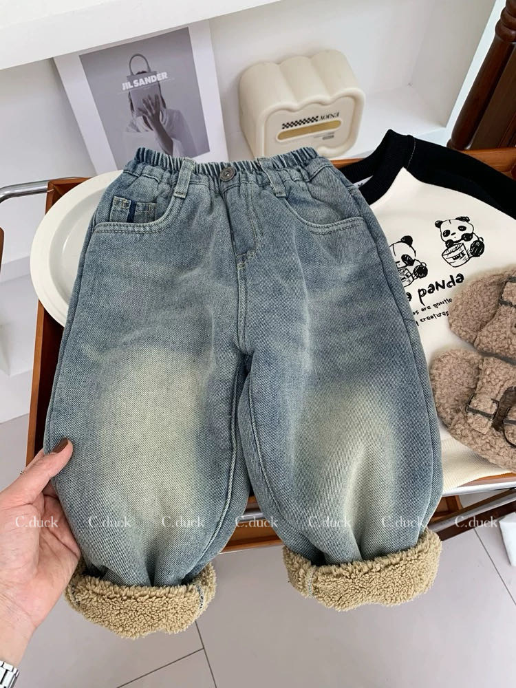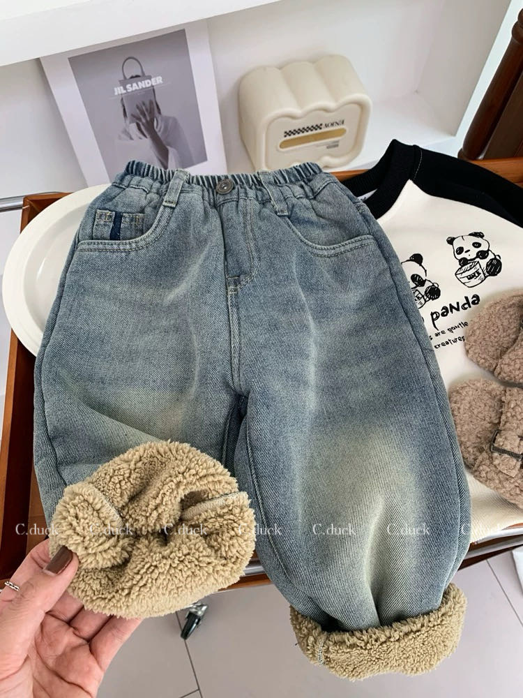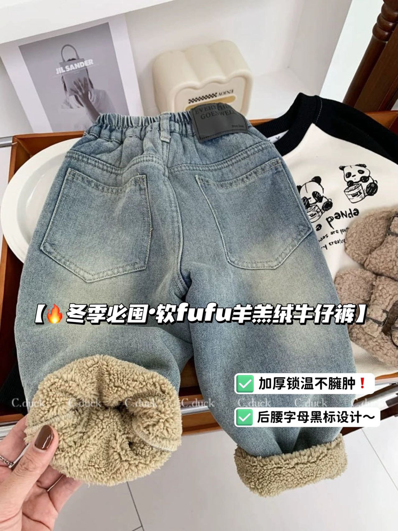 【🔥冬季必囤·软fufu羊羔绒牛仔裤】90-140尺码💥超高颜值又暖到犯规!❄️ 宝妈必看!这款儿童加绒牛仔裤真的绝了✨ 内里一体加厚羊羔绒,像裹着云朵般柔软☁️ 宝宝穿上就不肯脱! 👉加厚锁温不臃肿,上身暖呼呼💨 👉微宽松版型超能藏肉,跑跳无束缚 👉后腰字母黑标设计,潮宝出街必备 🎯幼儿园穿搭TOP1!从初冬穿到深冬超省心~ 💥限时团价超惊喜!给娃抢一条“会呼吸的保暖裤”