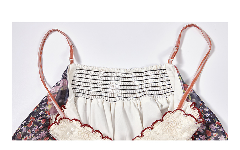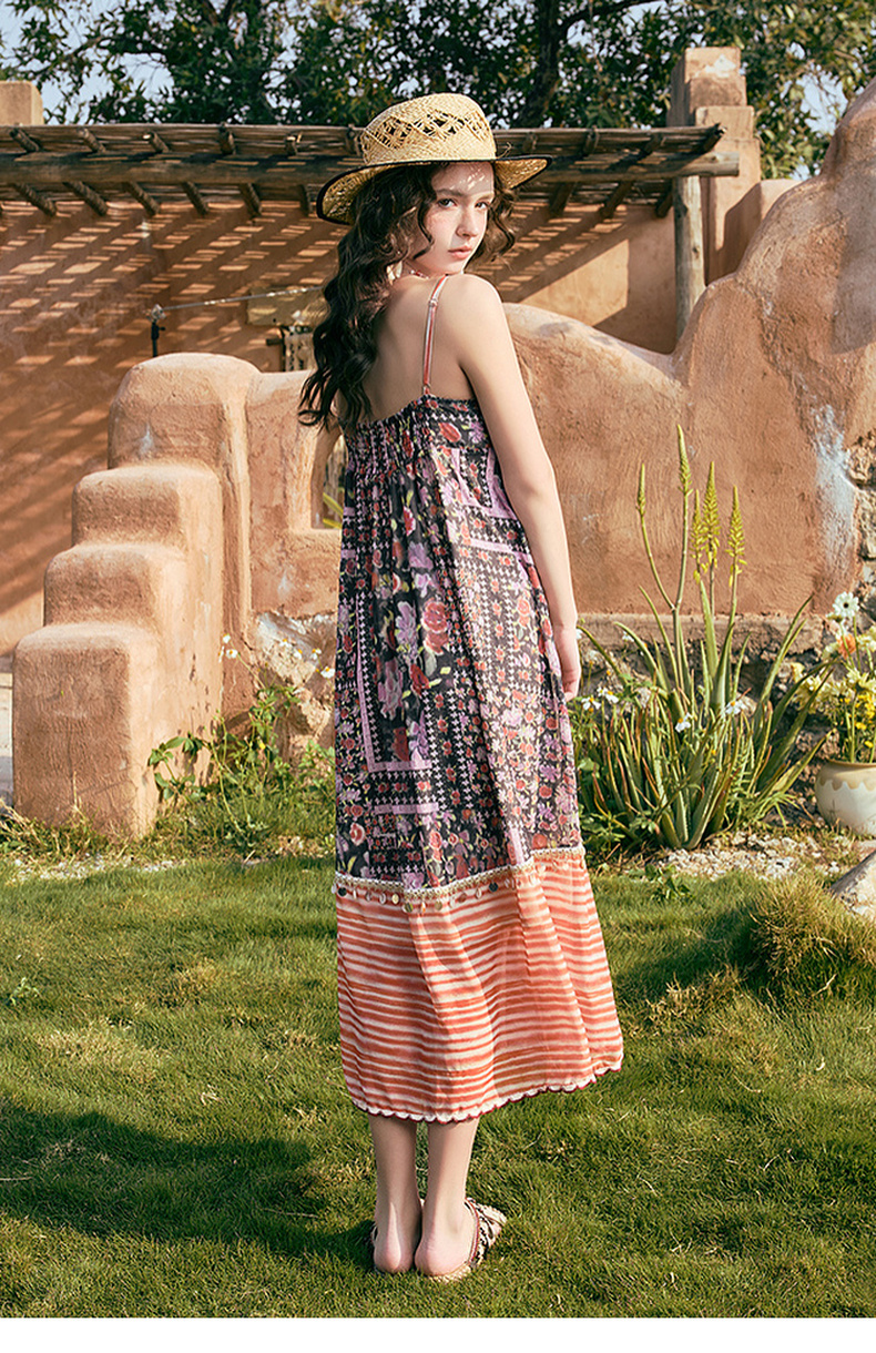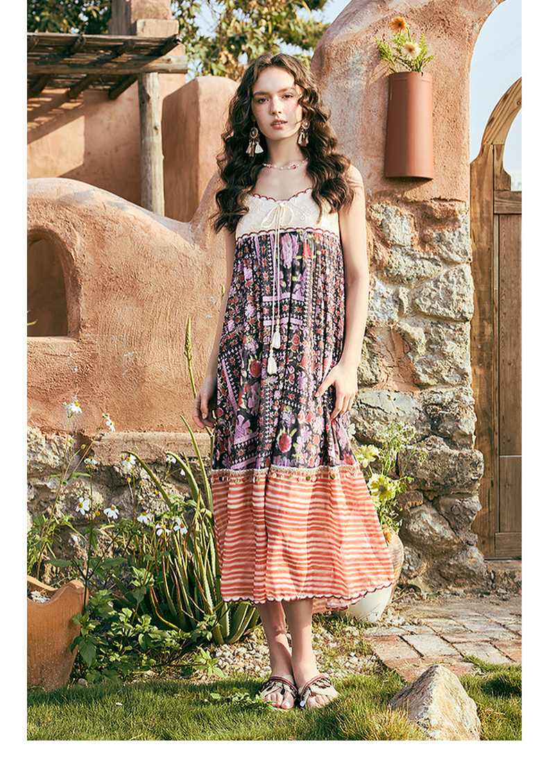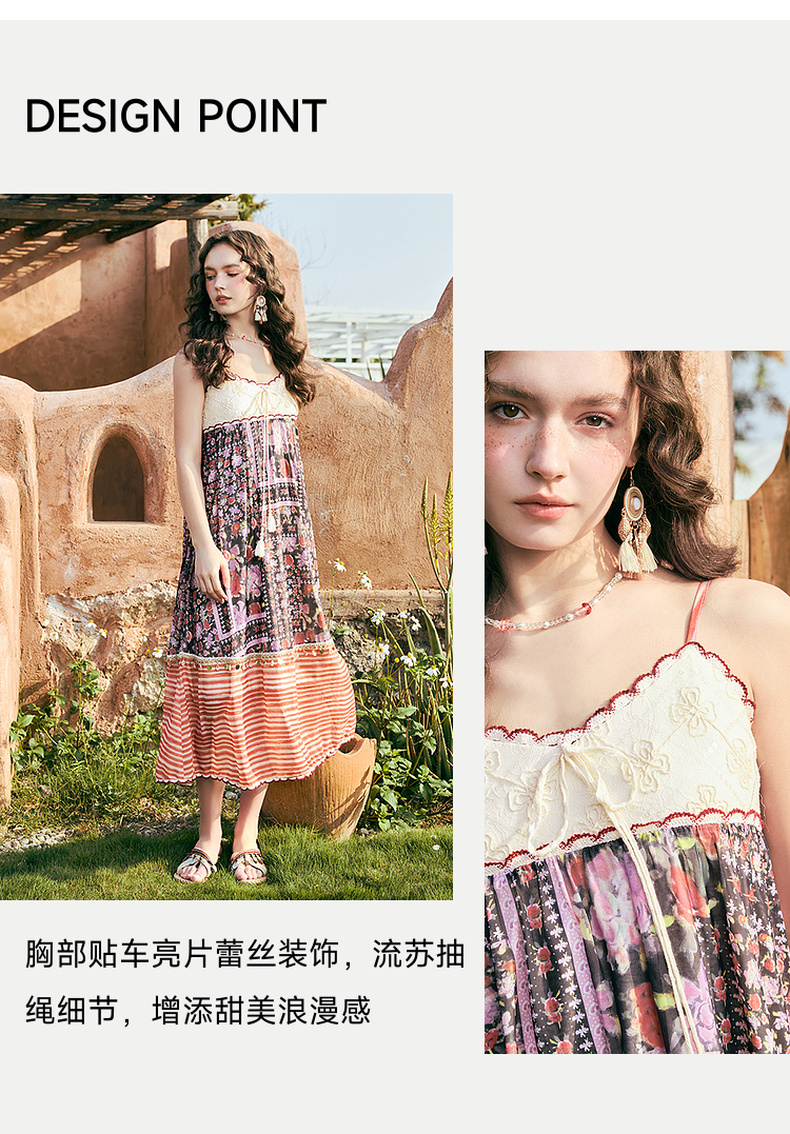 两三事碎蔷悬夏2025夏季新款波西米亚风亮片装饰印花吊带裙连衣裙