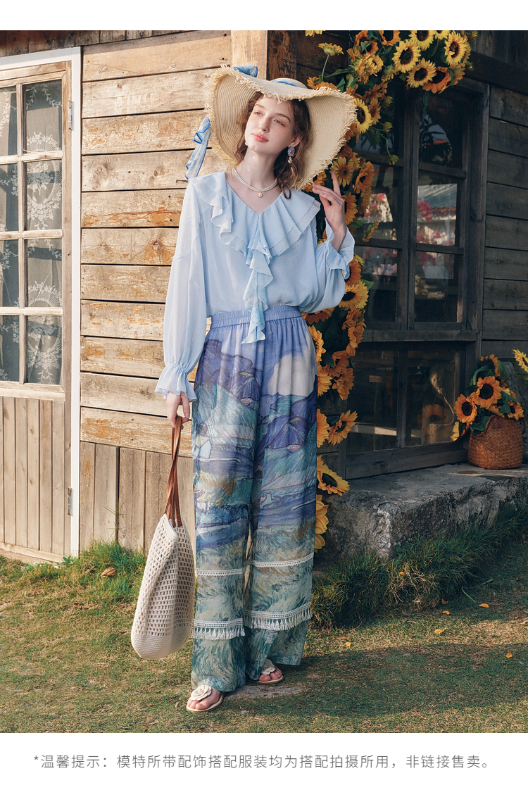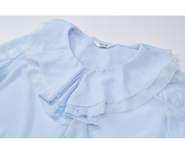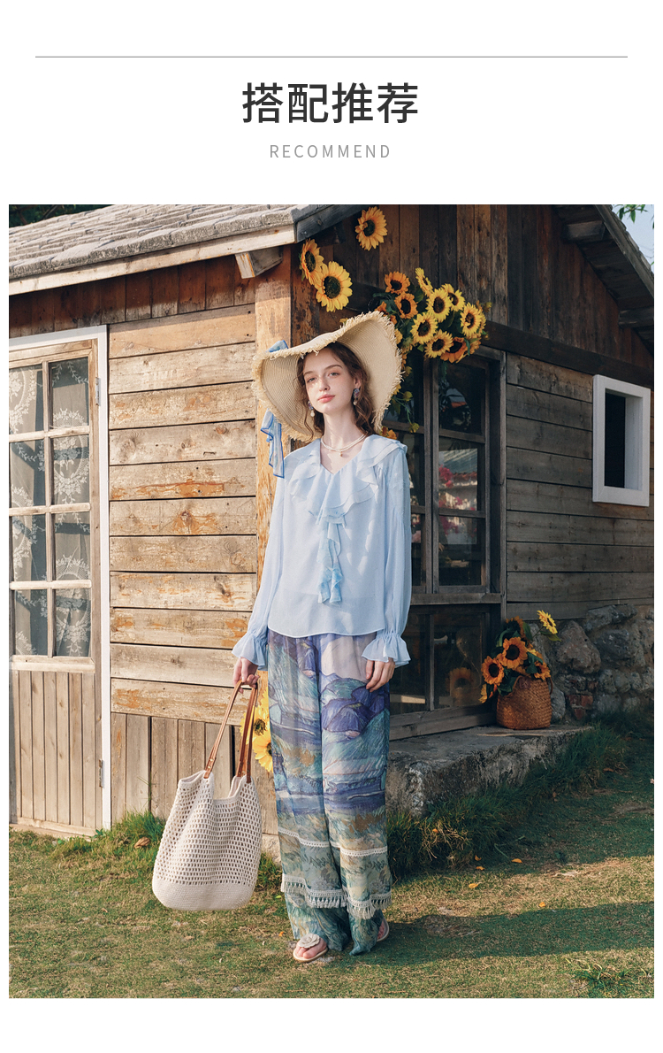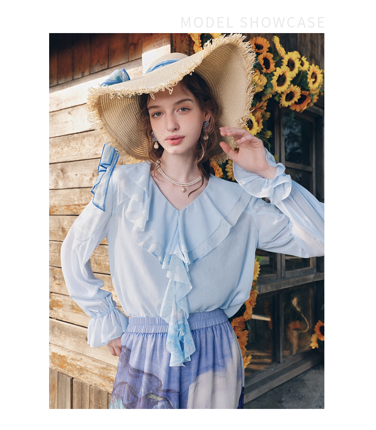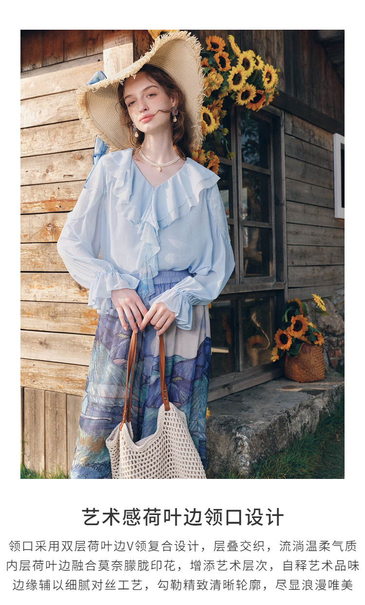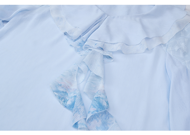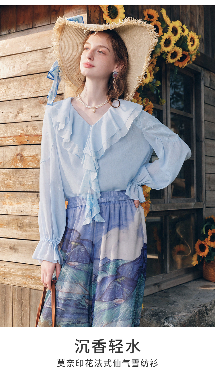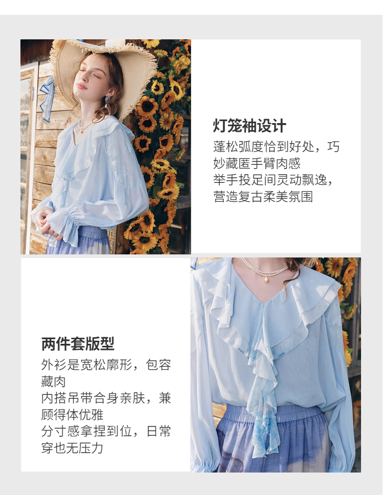 两三事沉香轻水2026春季新款荷叶边v领提花拼接袖两件套雪纺衫女