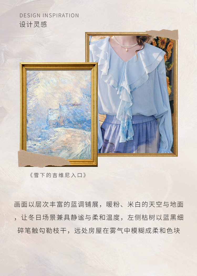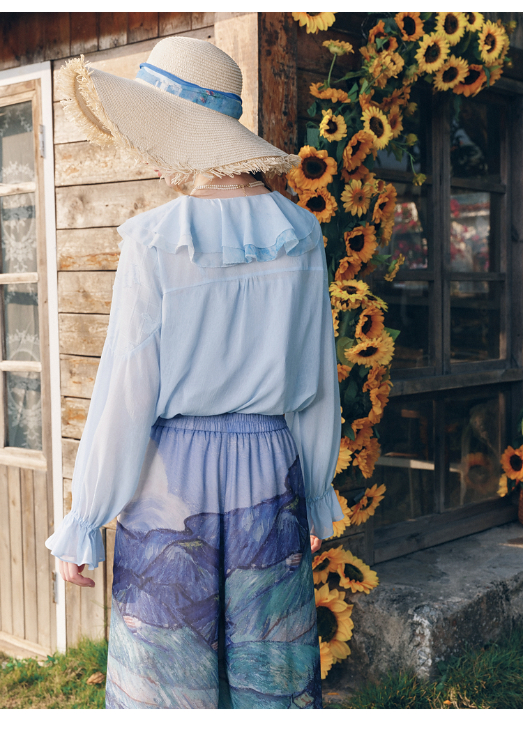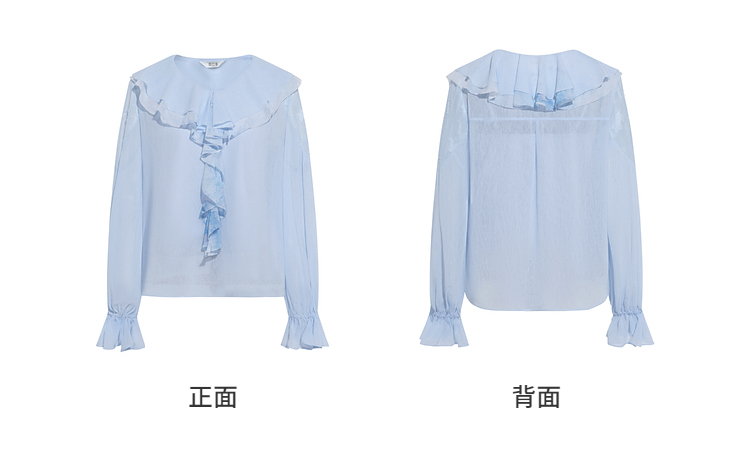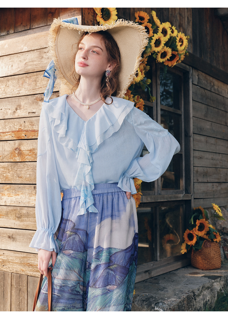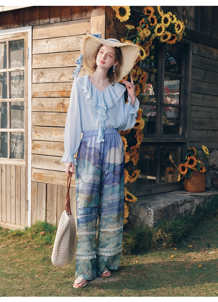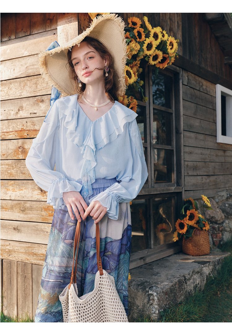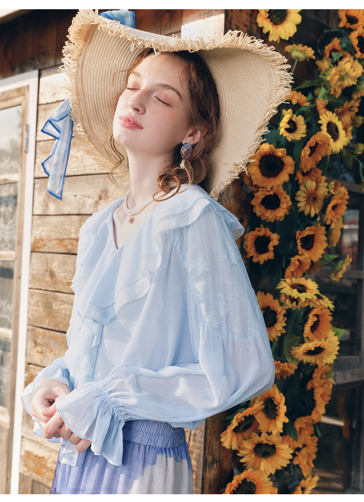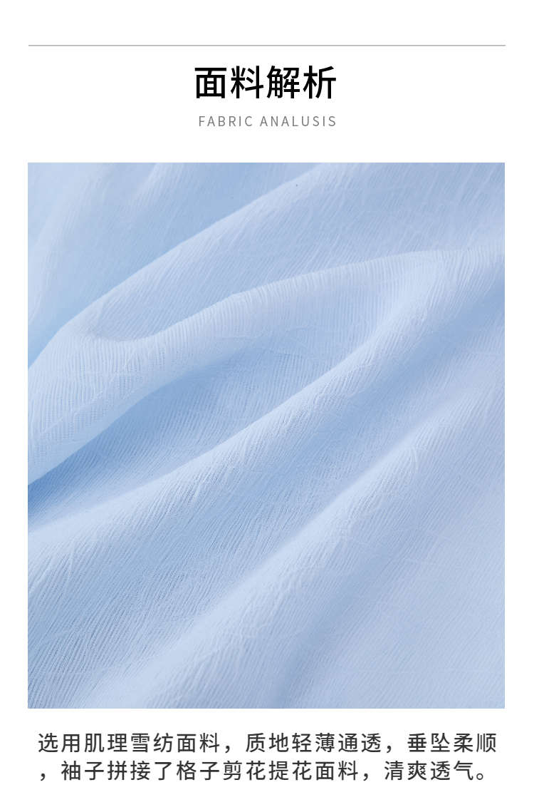 两三事沉香轻水2026春季新款荷叶边v领提花拼接袖两件套雪纺衫女