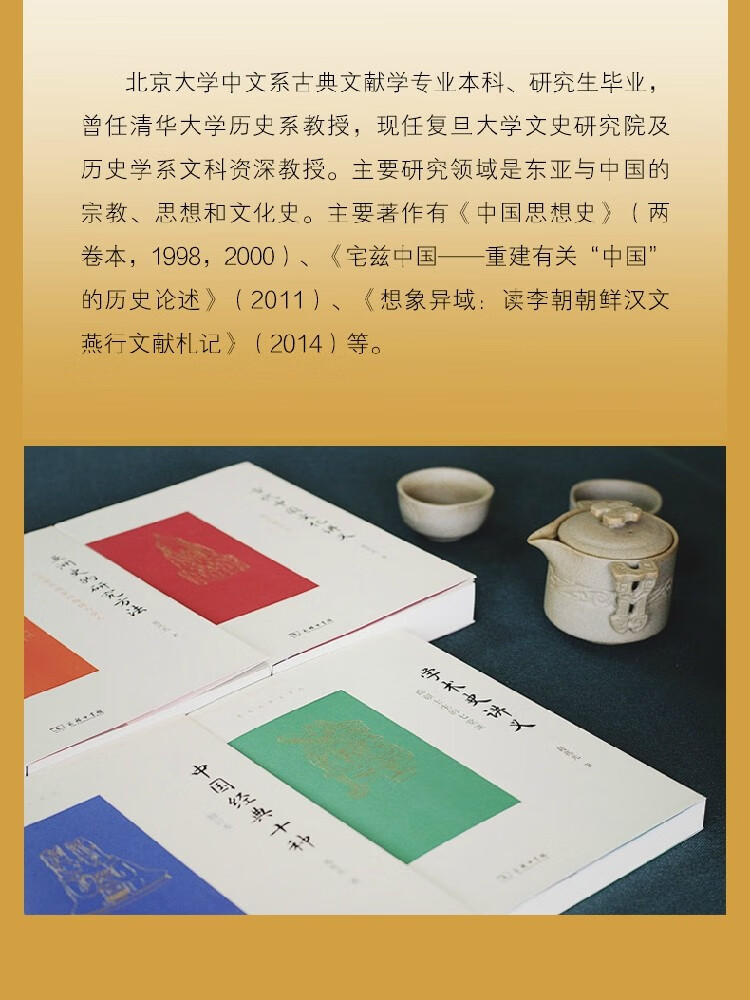 葛兆光,北京大学中文系古典文献学专业本科、研究生毕业,曾任清华大学历史系教授,现任复旦大学文史研究院及历史学系文科资深教授。主要研究领域是东亚与中国的宗教、思想和文化史。主要著作有《中国思想史》(两卷本,1998,2000)、《宅兹中国——重建有关“中国”的历史论述》(2011)、《想象异域:读李朝朝鲜汉文燕行文献札记》(2014)等。