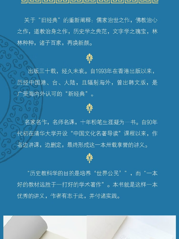 古人云:经,常也;典,大册也。一般认为,经典乃万世不易之作;甚至不少人将“中国经典”狭隘地解释为儒家圣贤之作。然葛兆光先生指出,中国经典,当不限于儒家治世之作,还应涵括佛教治心之作、道教治身之作,且如历史学之典范,文字学之瑰宝,林林种种,诸子百家,皆属中国之经典。