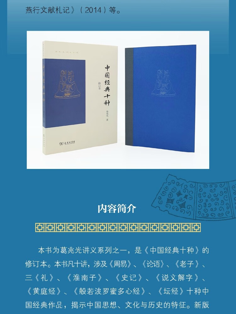 本书为葛兆光讲义系列之一,是《中国经典十种》的修订本。本书凡十讲,涉及《周易》、《论语》、《老子》、三《礼》、《淮南子》、《史记》、《说文解字》、《黄庭经》、《般若波罗蜜多心经》、《坛经》十种中国经典作品,揭示中国思想、文化与历史的特征。新版增加了“文献选读”一目,又于“参考书目”中增加了新近出版的参阅作品。本书定位为面对大学生的通俗浅近讲义,探讨何以正确阅读传统中国经典、什么才是中国经典、如何正确理解传统经典意义等重要问题。作者以诠释“旧经典”的方式,尝试为今天提供犹有裨益的“新经典”。