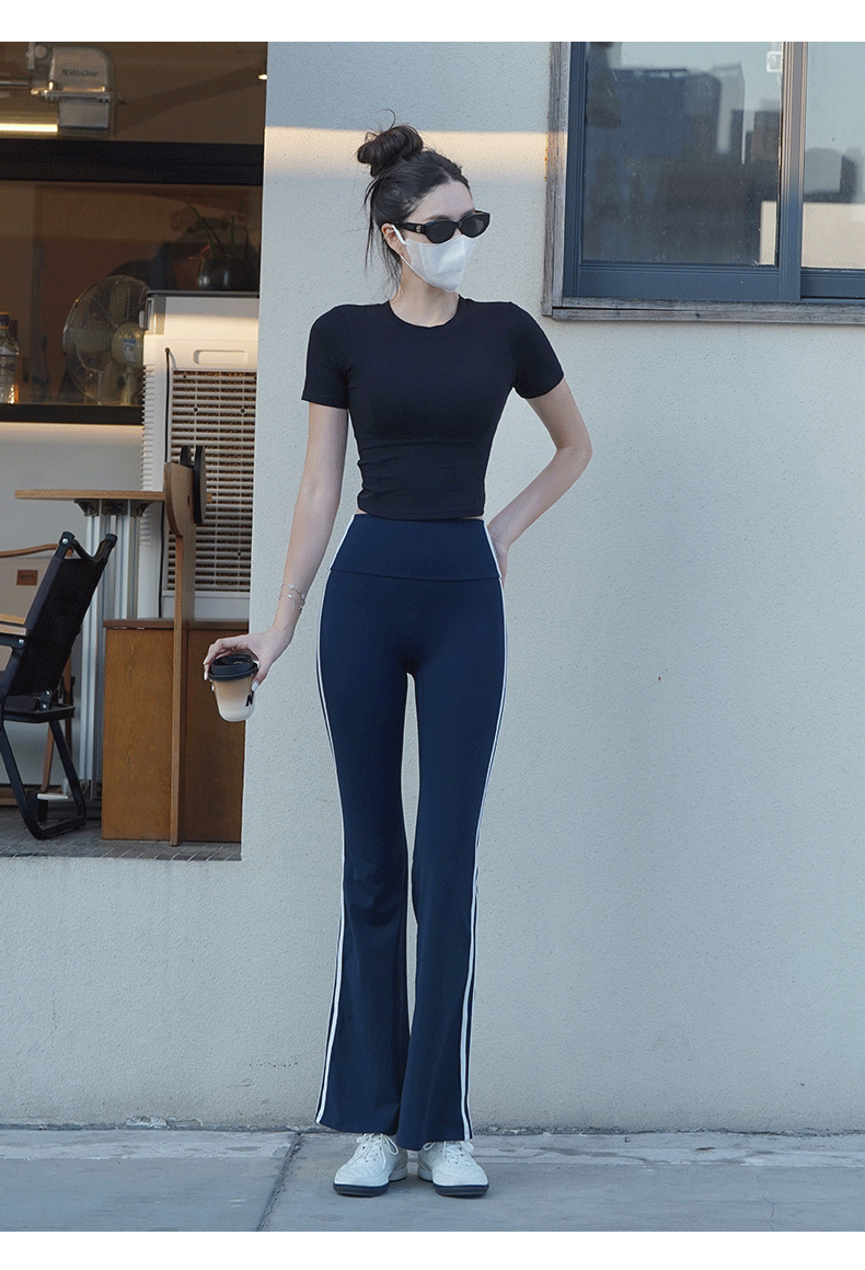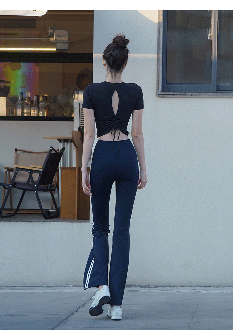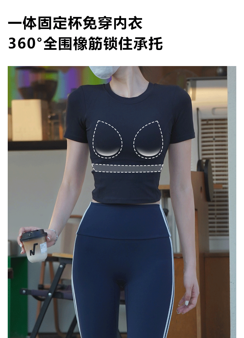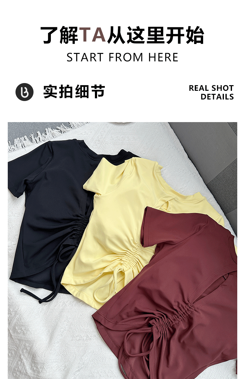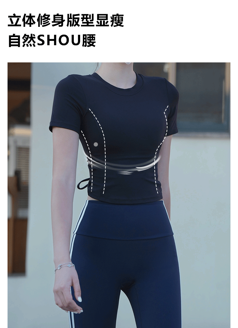 Beemen高弹裸感瑜伽服短袖 镂空美背设计抽绳收腰健身上衣 固定一体杯
