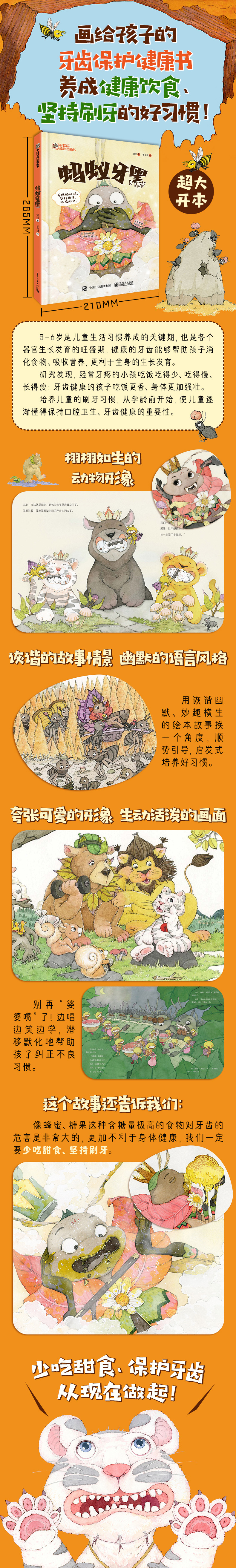 嗨,你好!我是牙牙,是你的好朋友。我会陪伴你成长,在这个过程中,你会经历一次换牙,我们会变得更加强大,来更好、更长久地保护你。虽然我十分坚固,能咬碎坚硬的食物,但我也有天敌!我*怕那些你都看不到的细菌了,它们会啃噬我的身体,让我生病,让我变黑变小!当然,如果我生病了,你也会像故事中的蚂蚁一样疼痛难忍,甚到还会影响你们正常吃饭、说话。所以牙牙在这里请你——少吃甜食、适时漱口、认真刷牙,只有这样,我才会一直陪伴你健康长大哦!