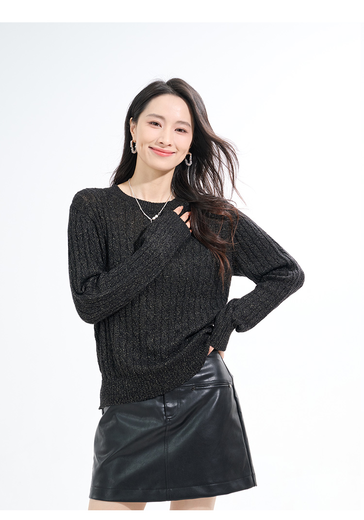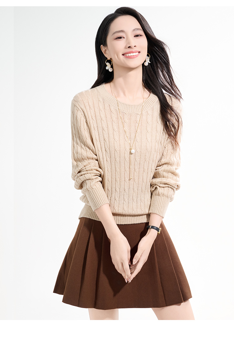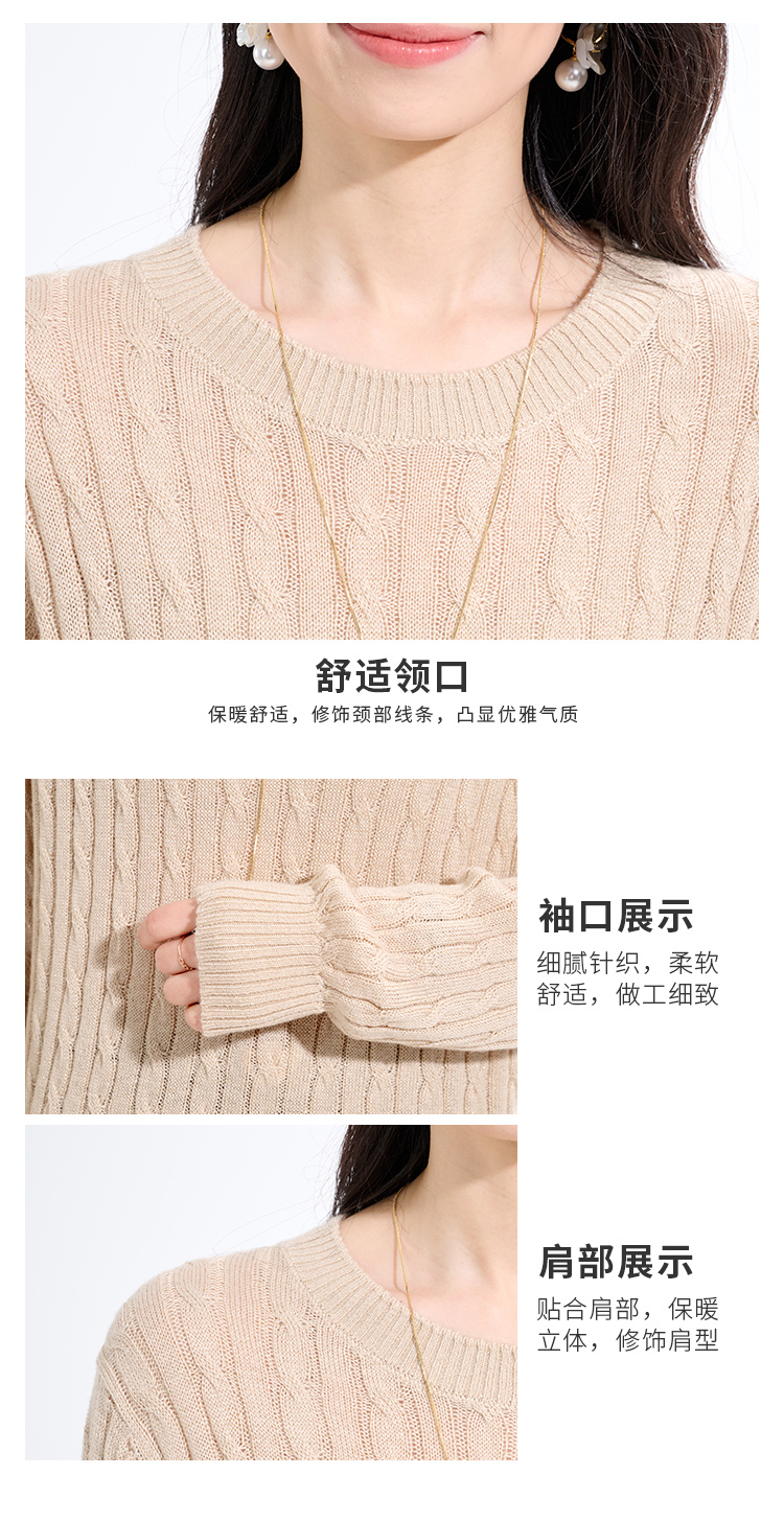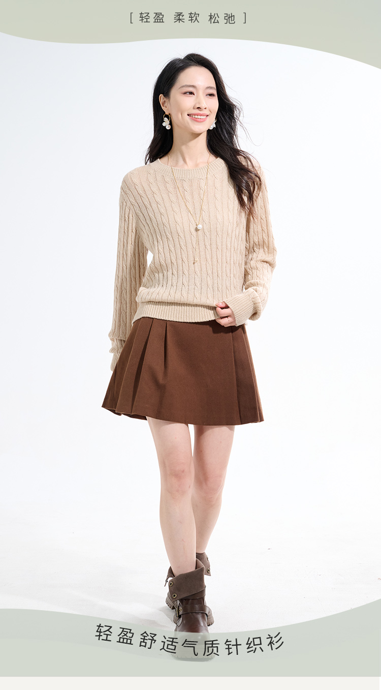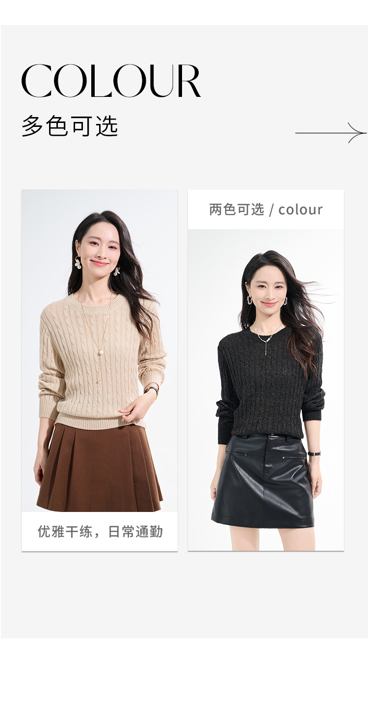 罗蒙针织衫秋冬女士简约复古麻花圆领设计打底衫含绵羊毛舒适上衣毛衣女