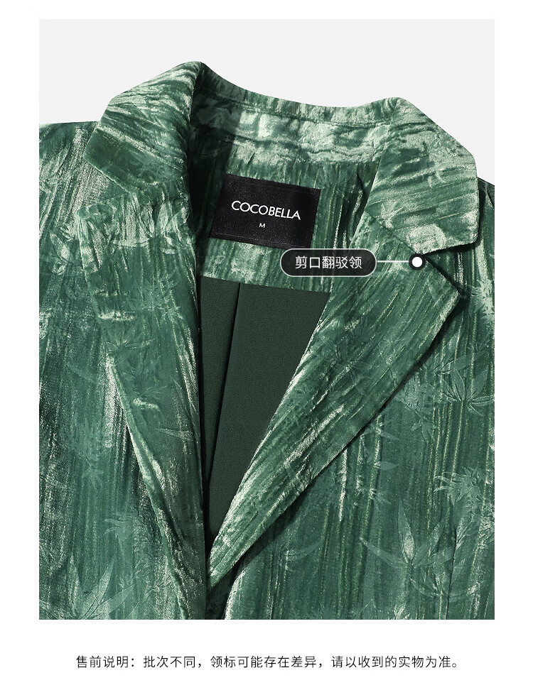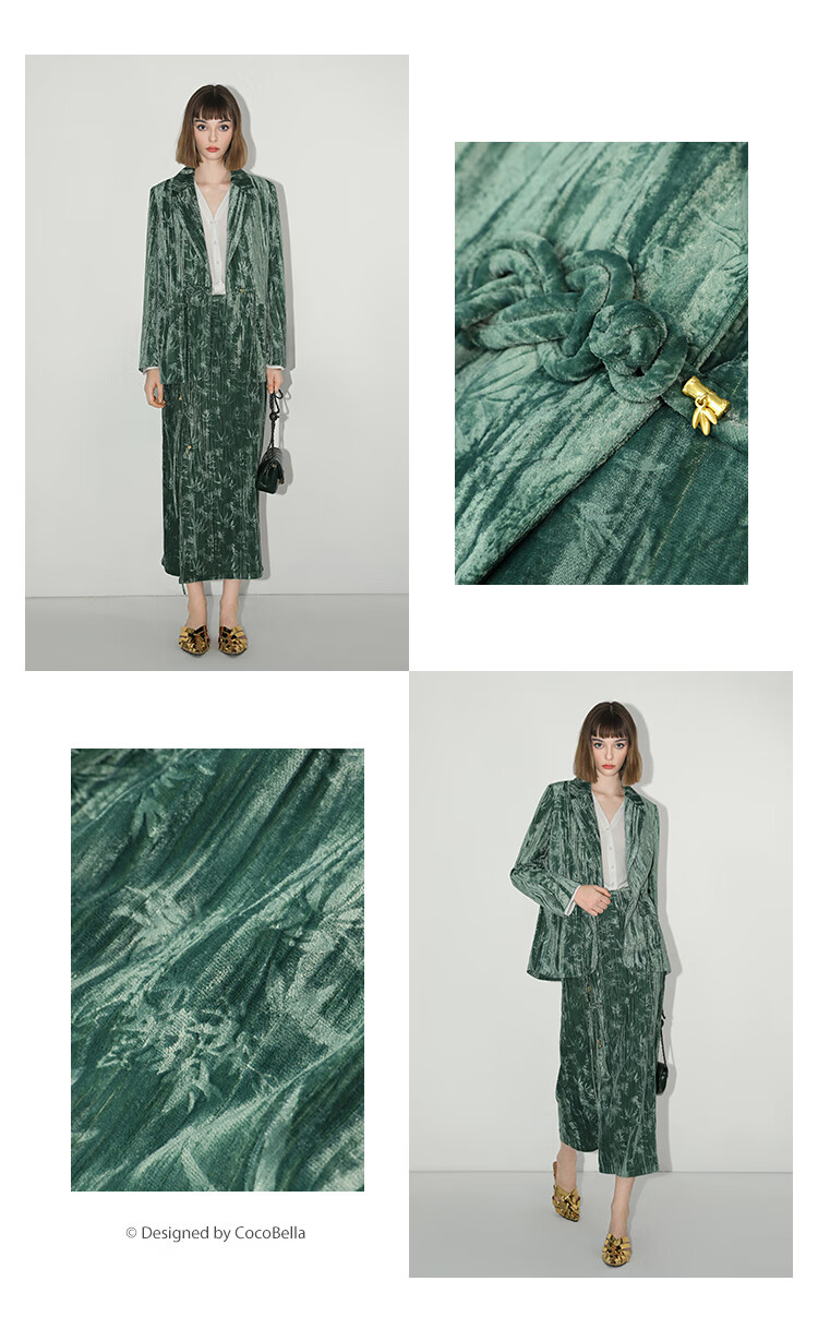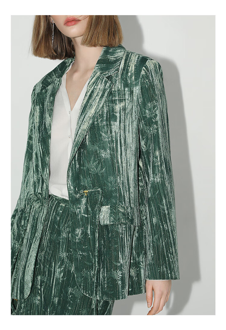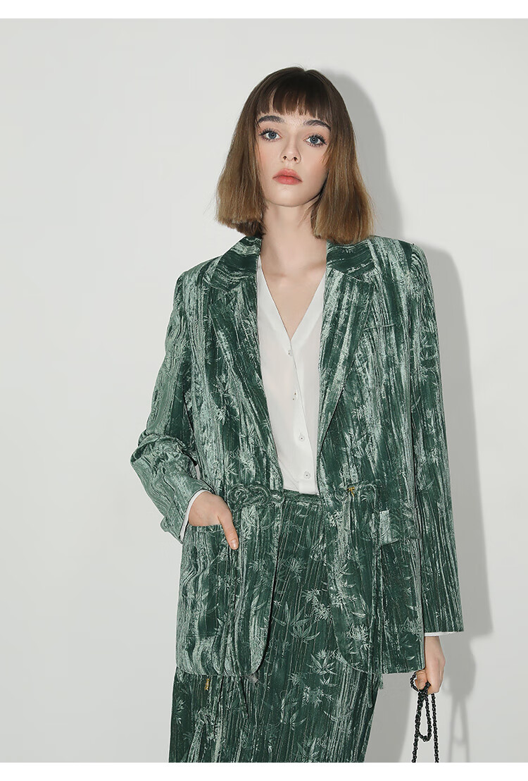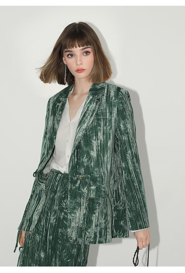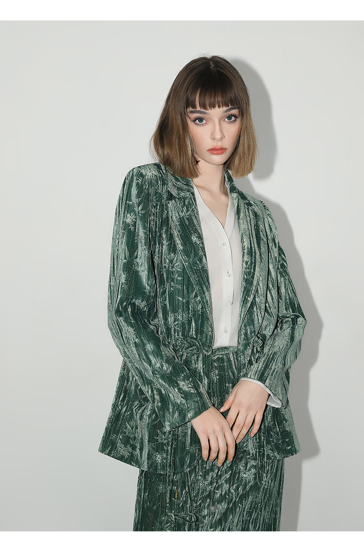【有赞】COCOBELLA新中式竹叶拓印压褶丝绒西装女国风盘扣外套SI3007