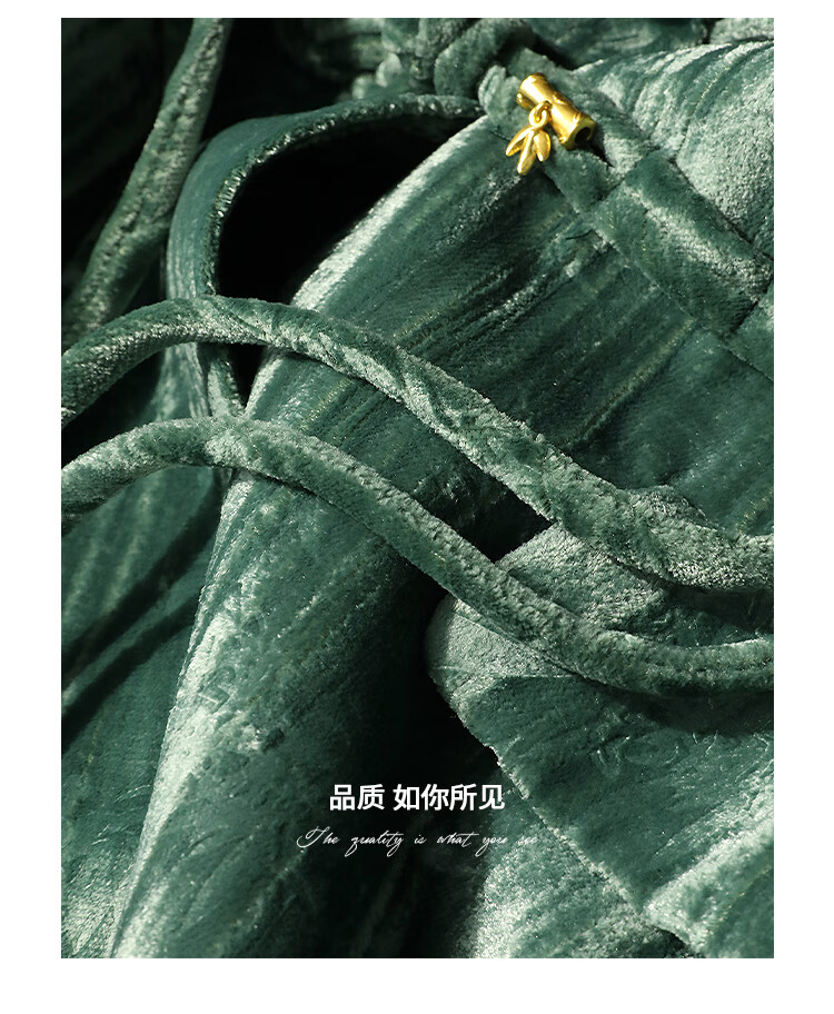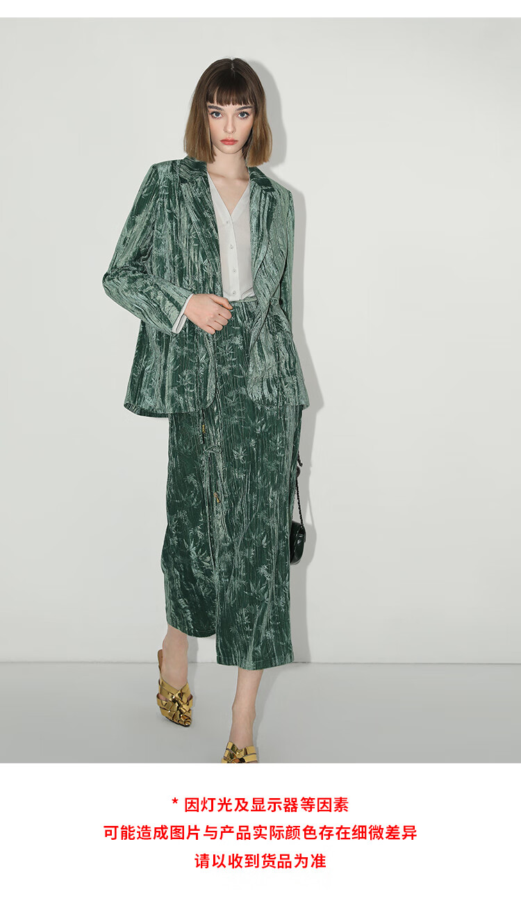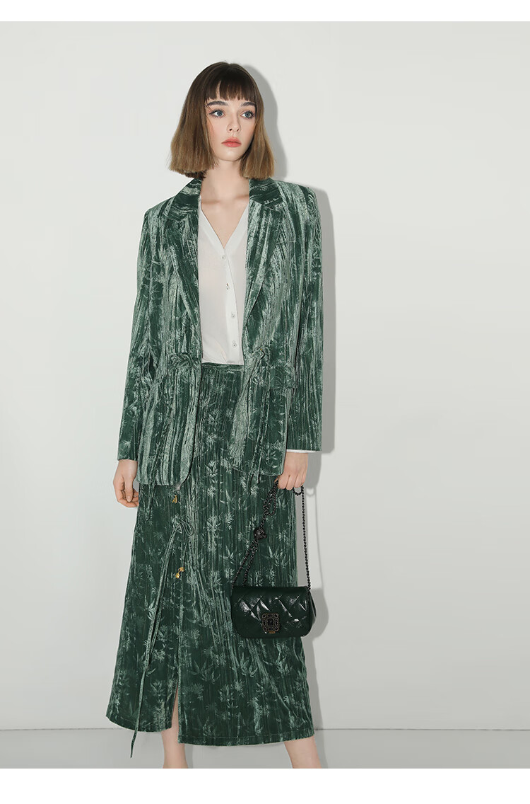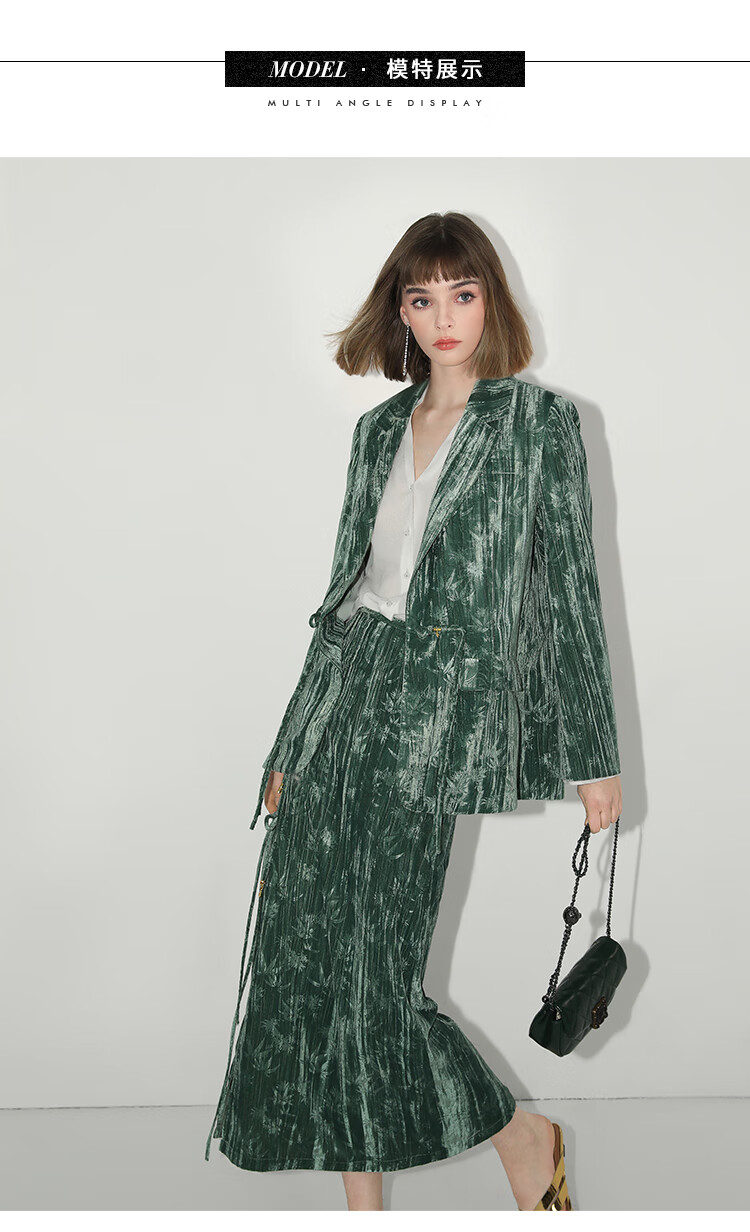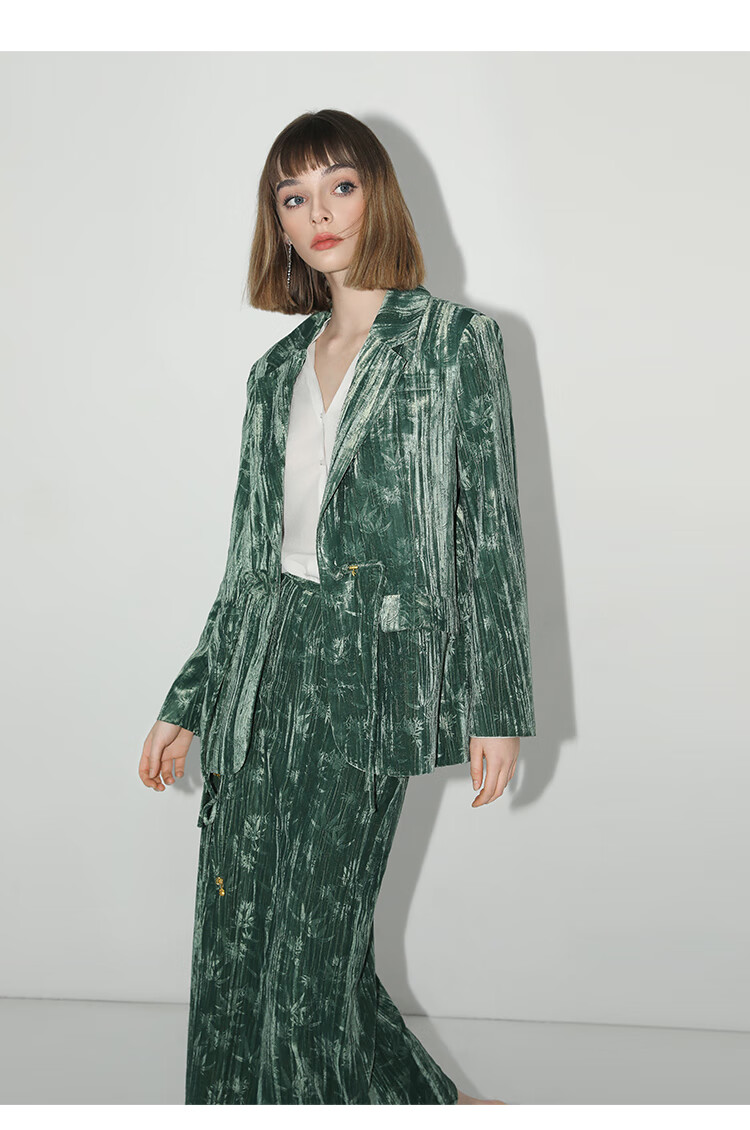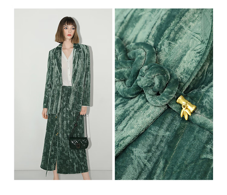 【有赞】COCOBELLA新中式竹叶拓印压褶丝绒西装女国风盘扣外套SI3007