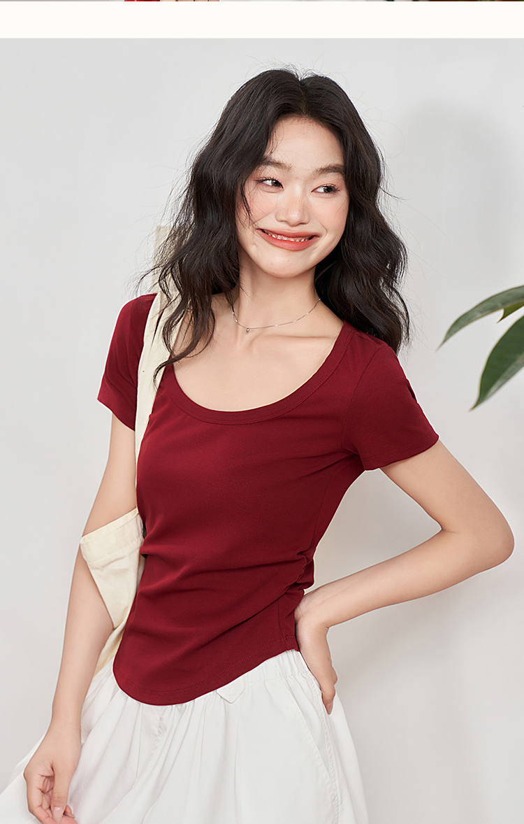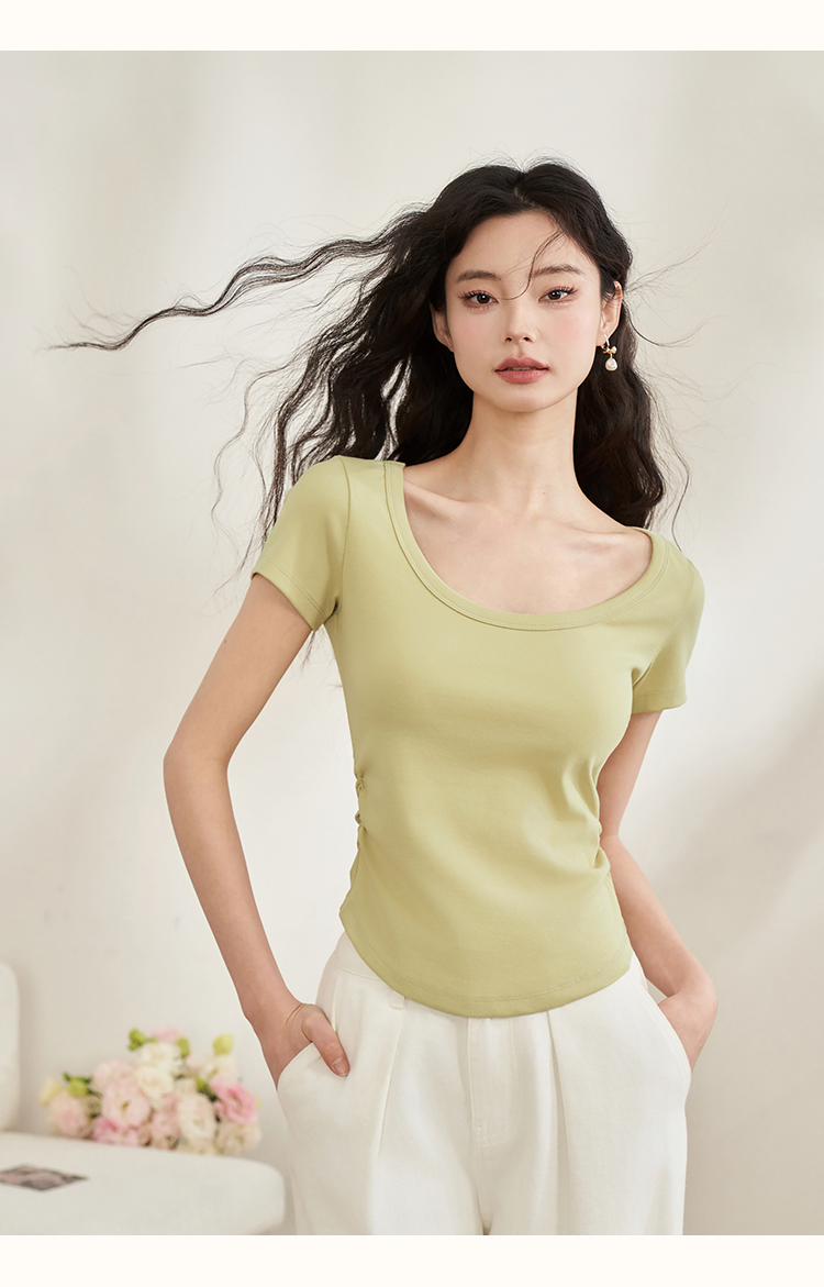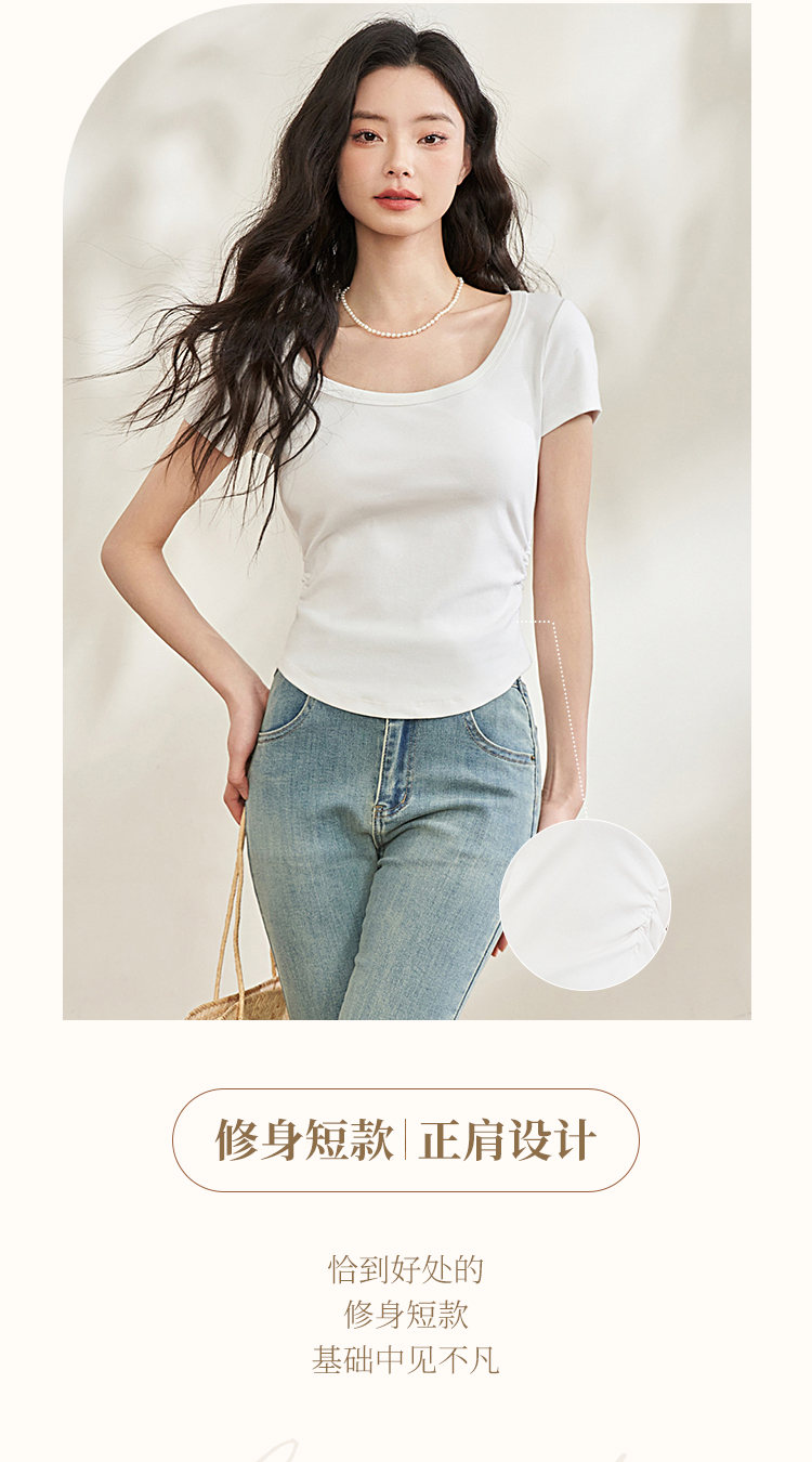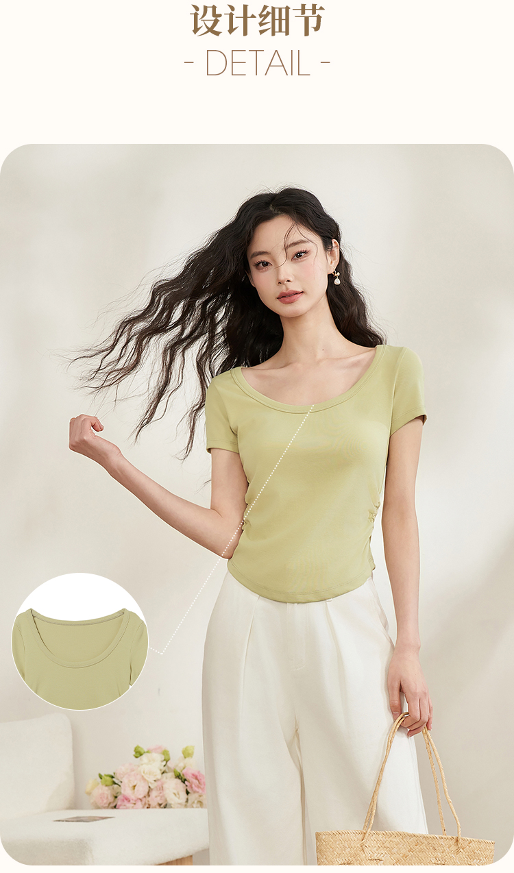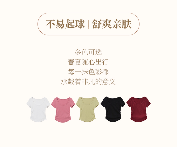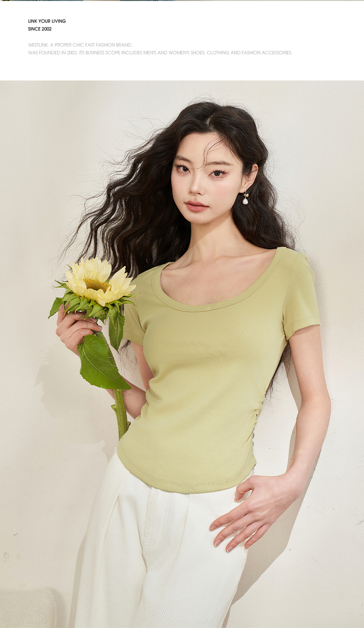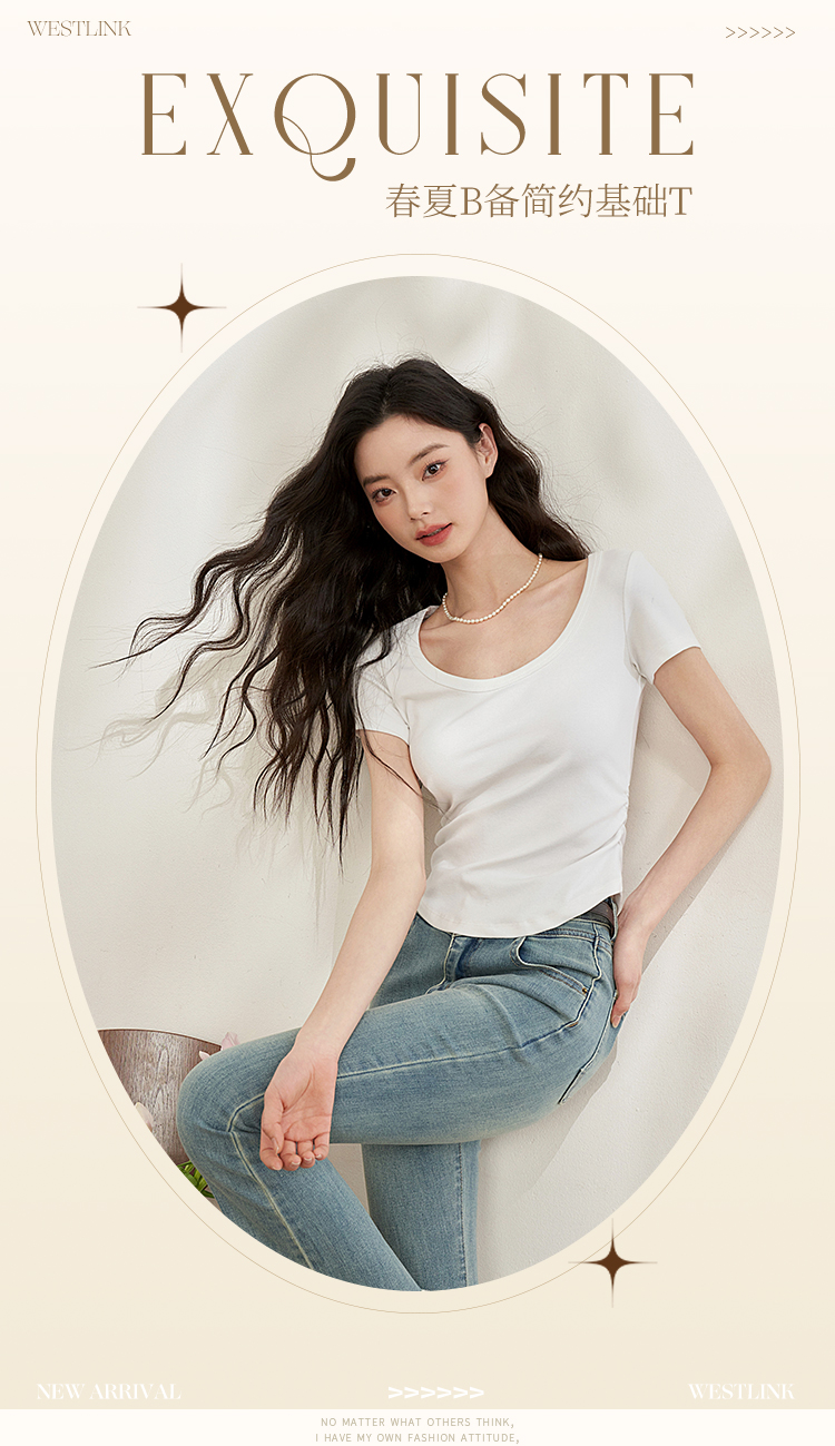 西遇白色U领正肩简约短袖女新款通勤基础修身T粉色绿色D0740371/V0050524