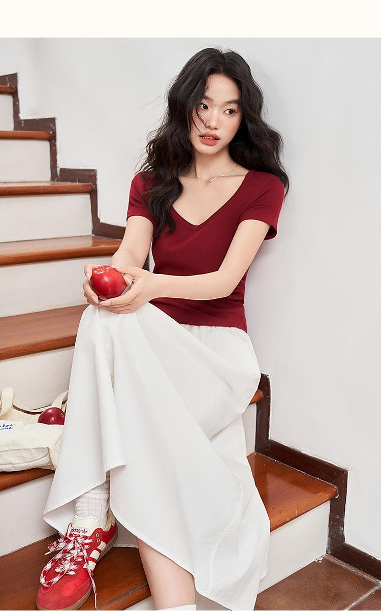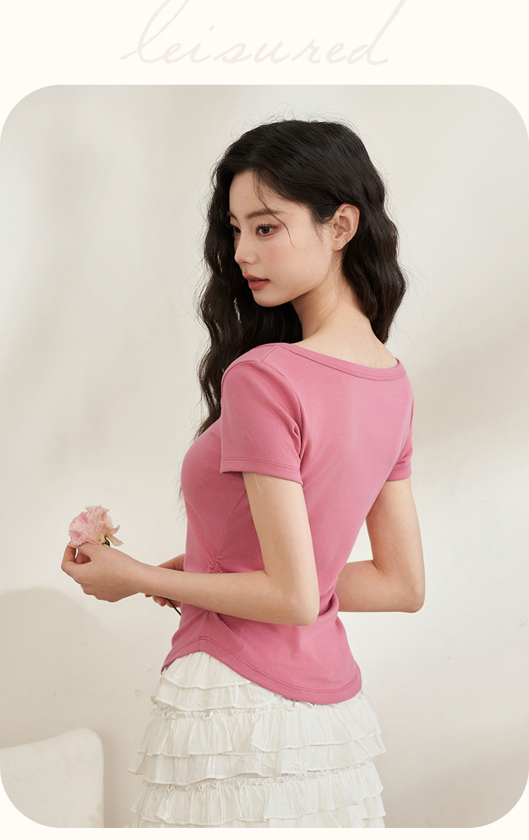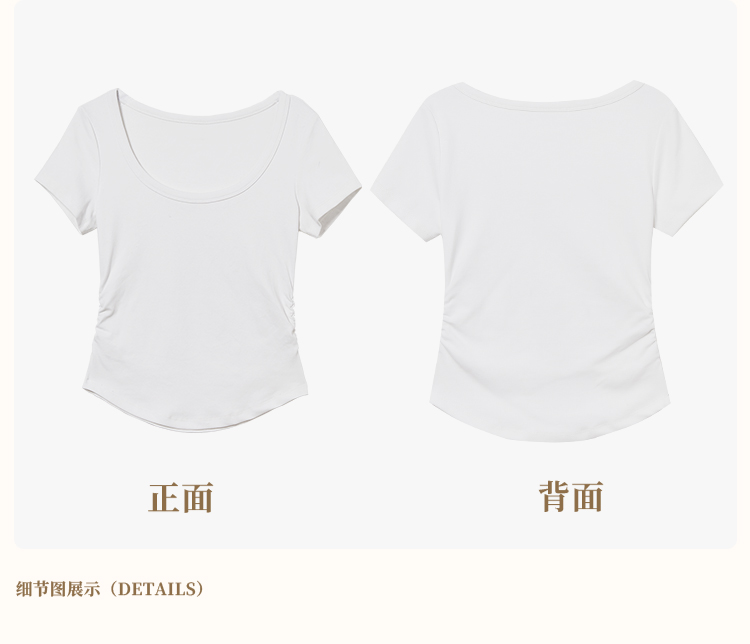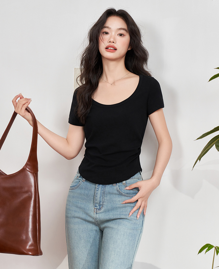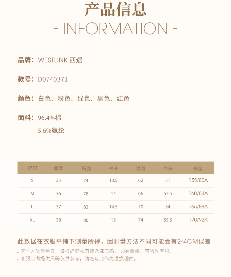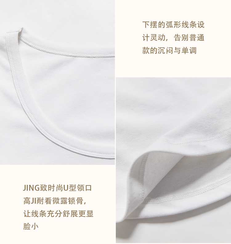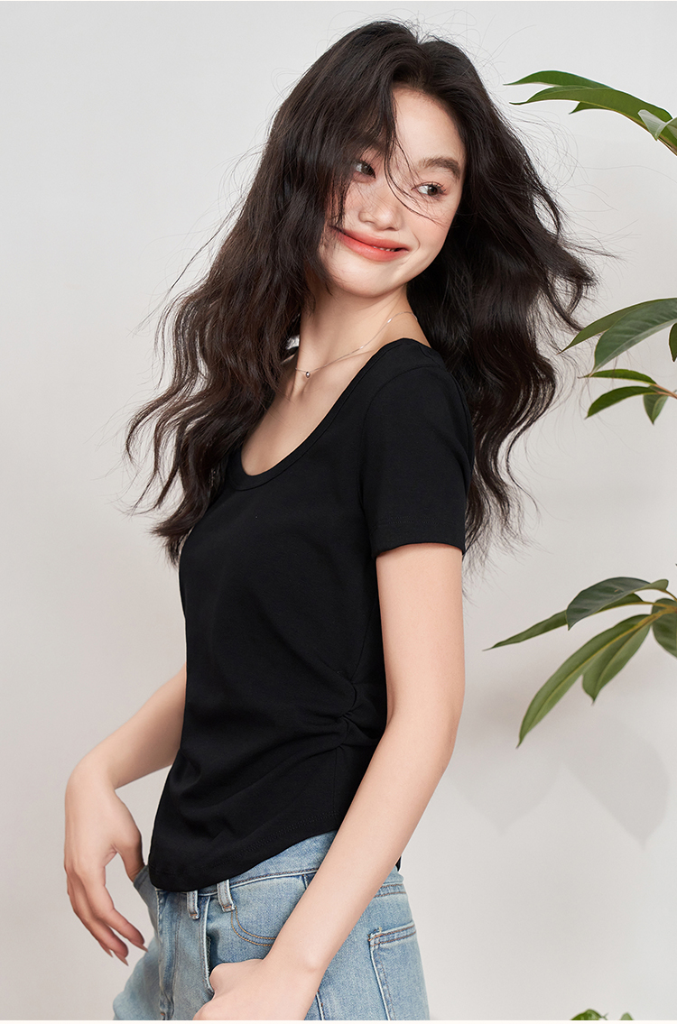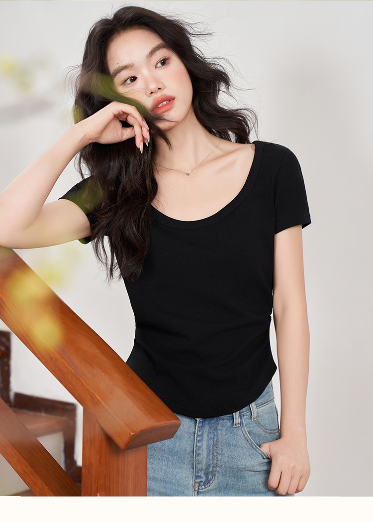 西遇白色U领正肩简约短袖女新款通勤基础修身T粉色绿色D0740371/V0050524