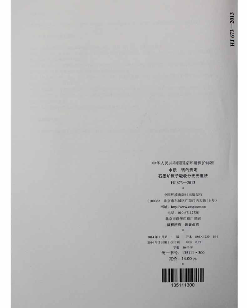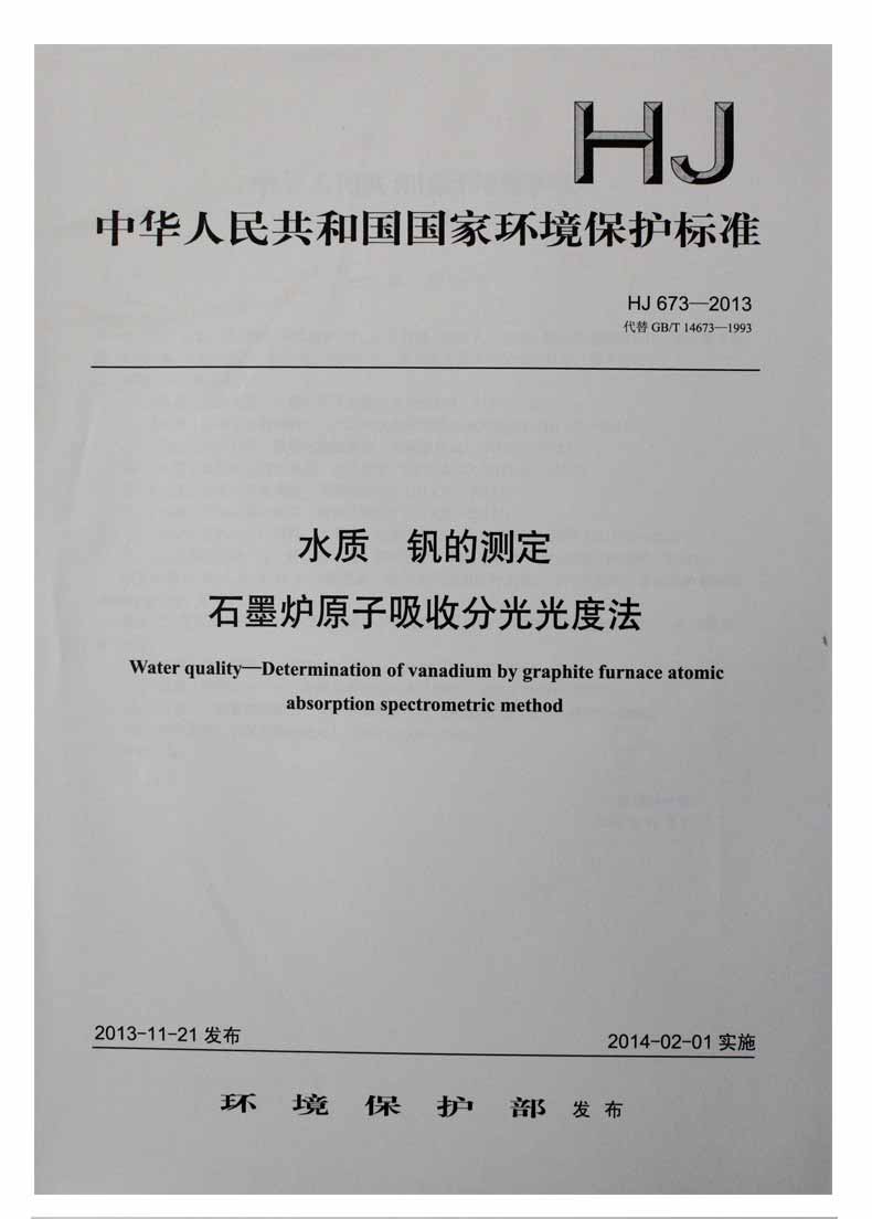 HJ 673-2013 代替 GB/T 14673-1993 水质 钒的测定 石墨炉原子吸收分光光度法 GB 环境保护中国环境出版社135111300