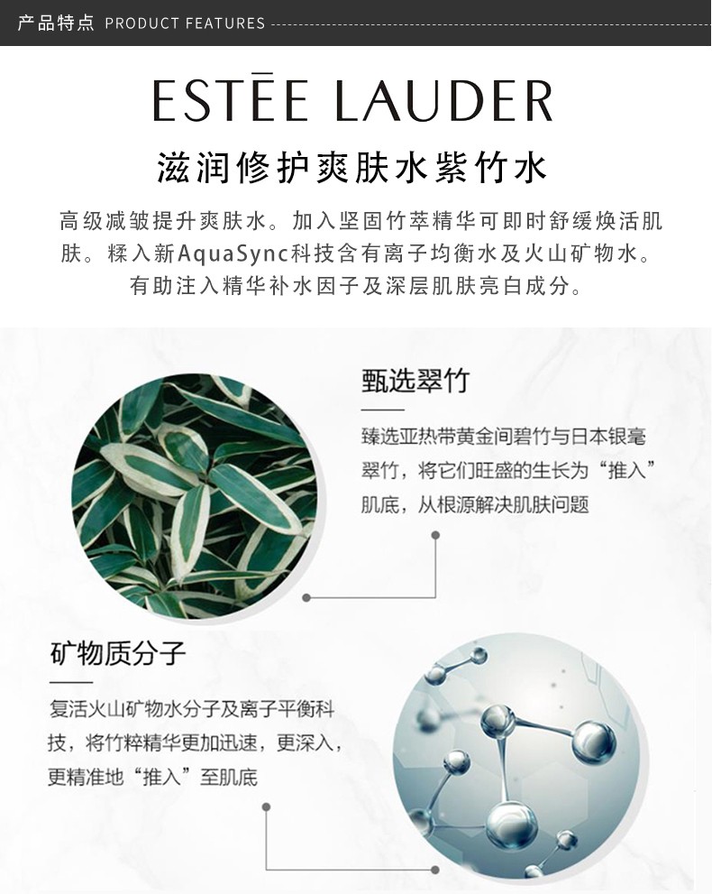 高级减皱提升爽肤水。加入坚固竹萃精华可即时舒缓焕活肌肤。糅入新AquaSync科技含有离子