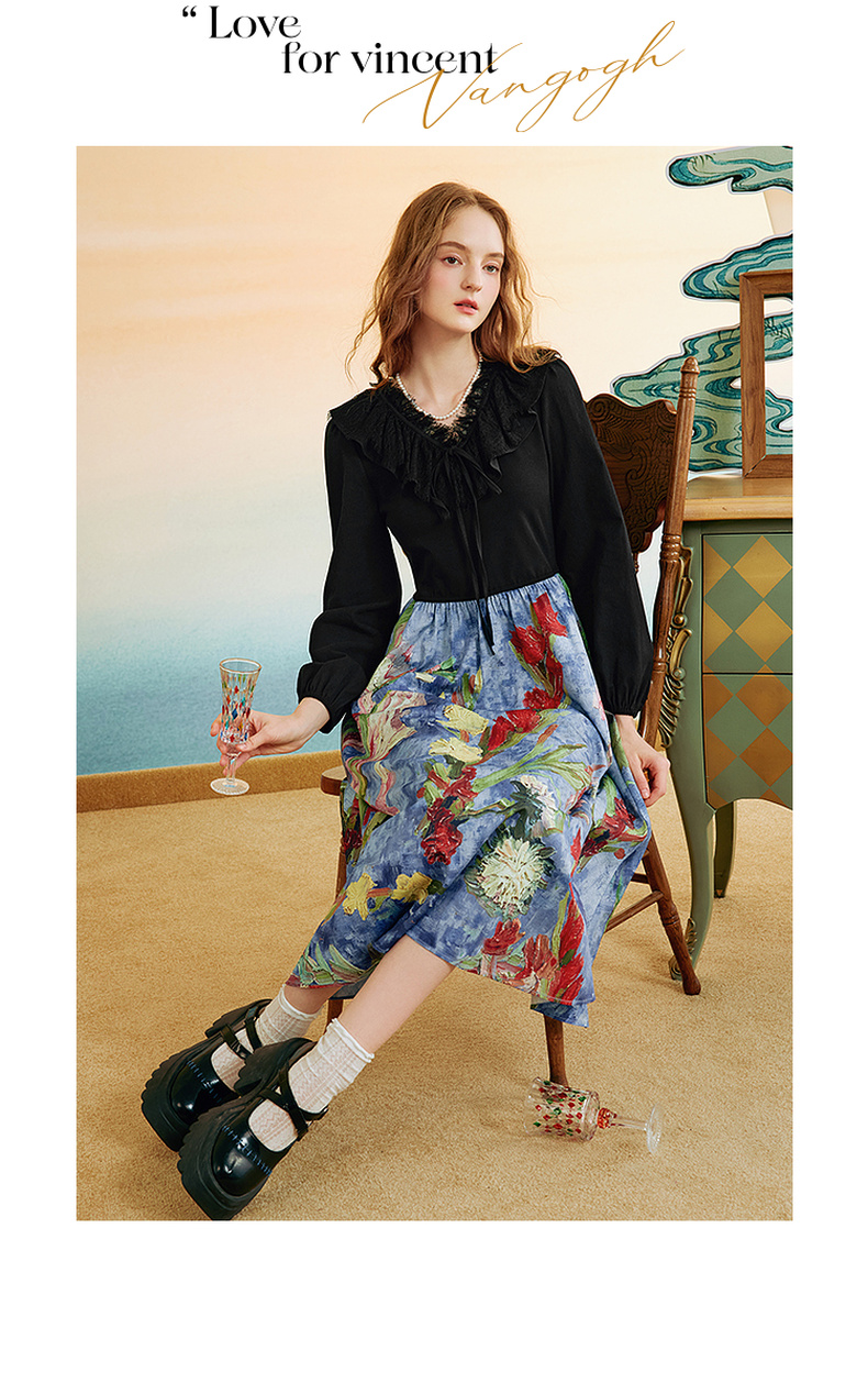 两三事梵高文艺花海浮游2025秋季新款印花裙摆蕾丝拼接v领连衣裙