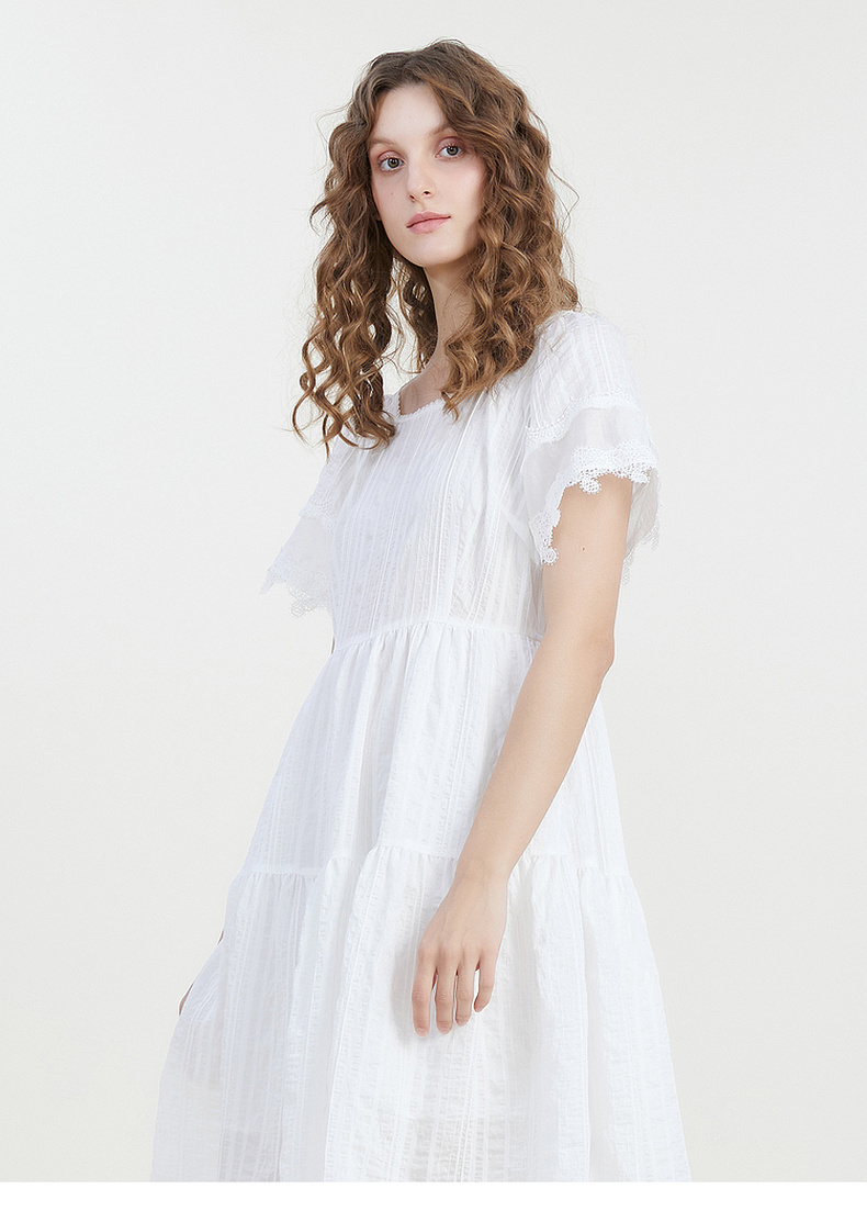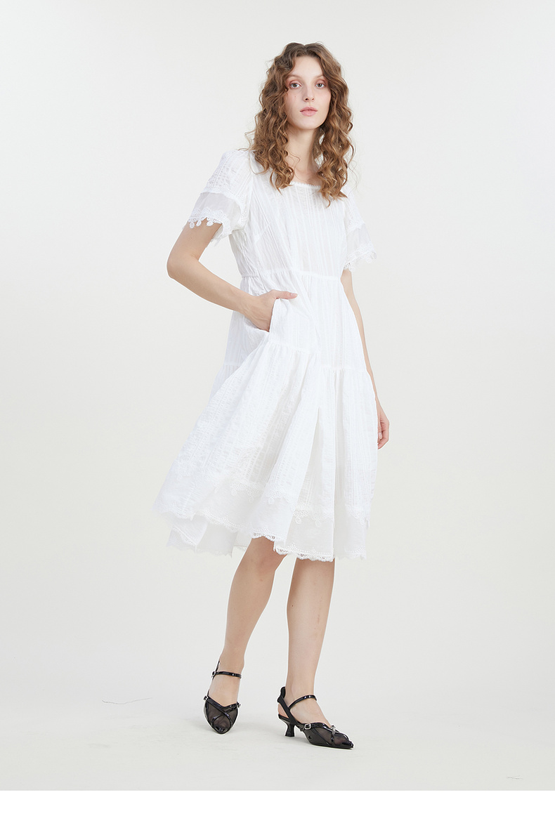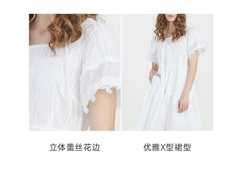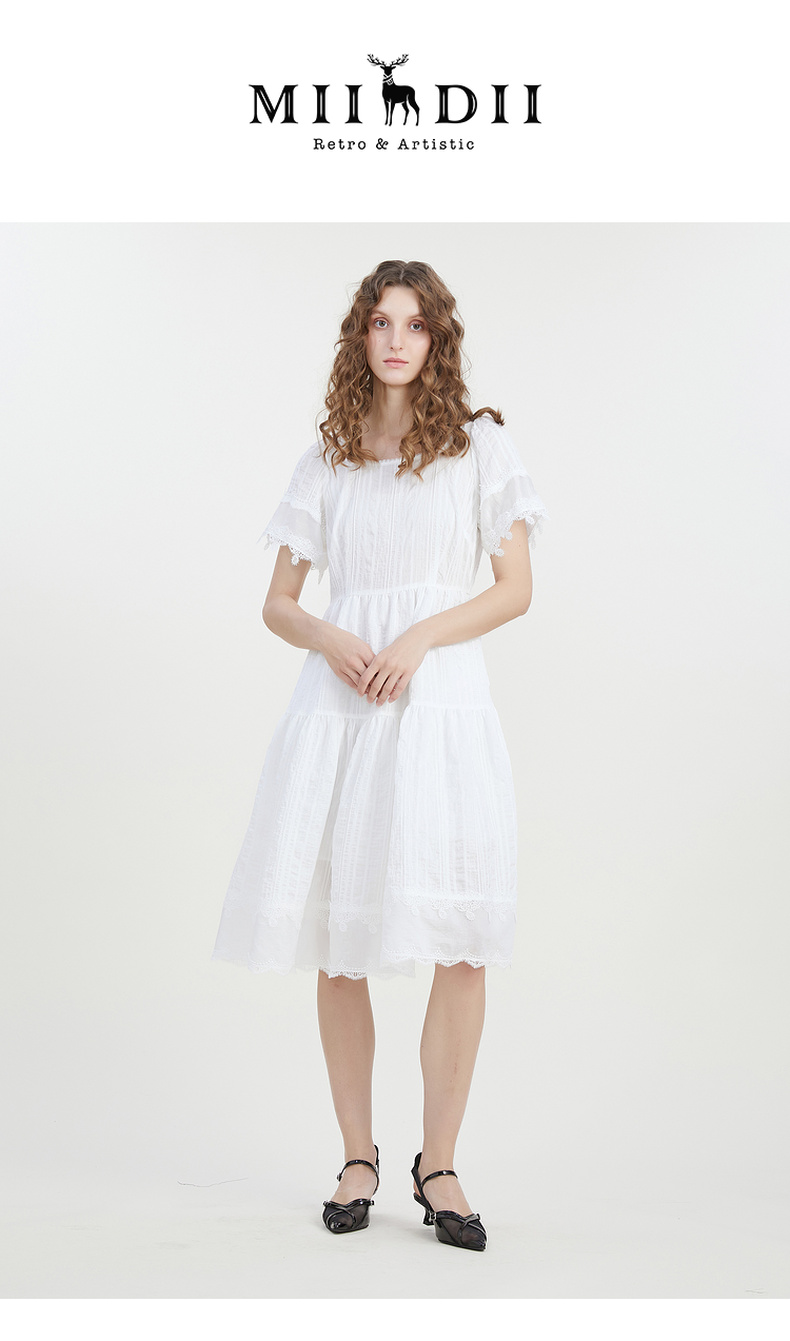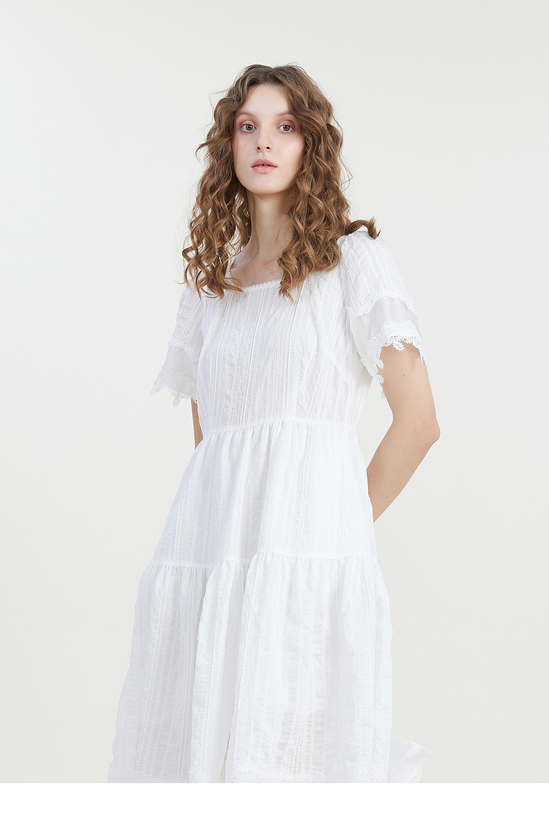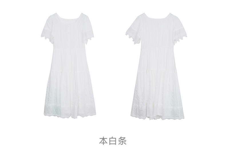 谜底方领连衣裙2023夏款小清新白色裙子收腰中长裙短袖232ML0699