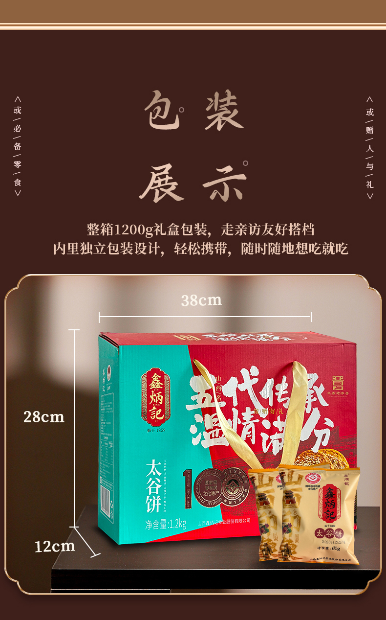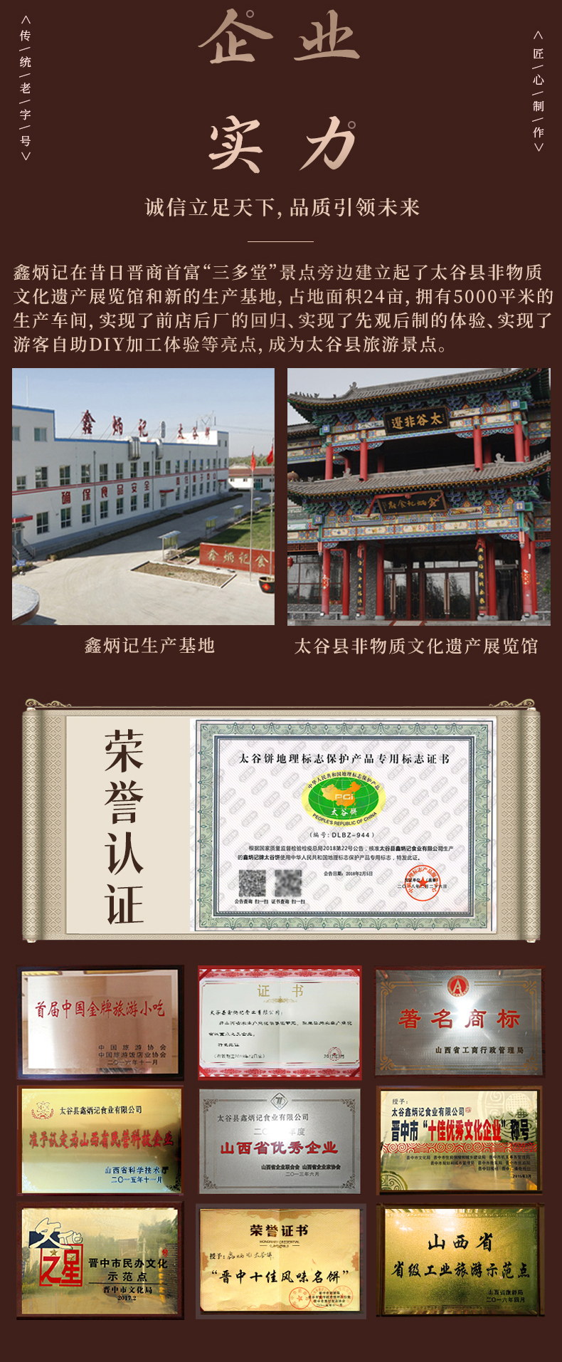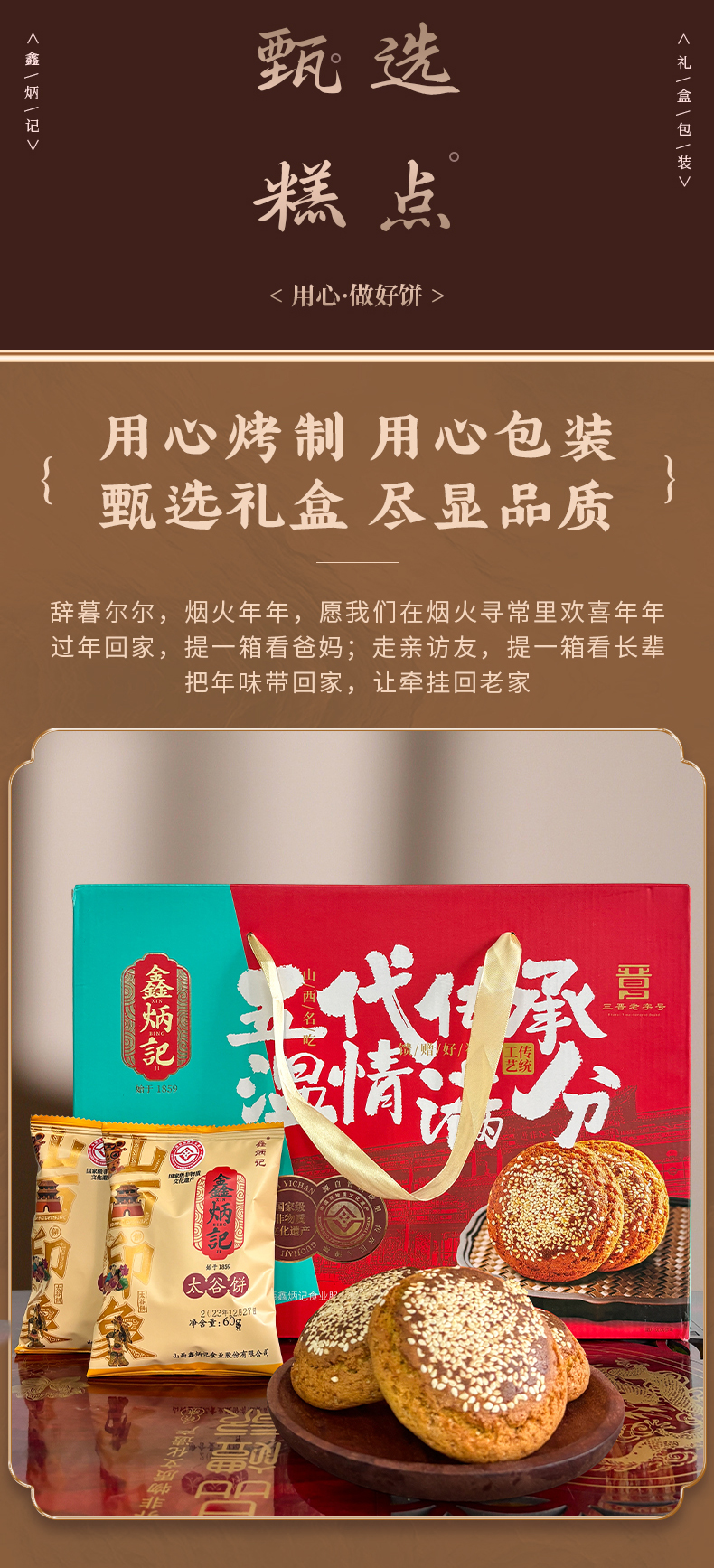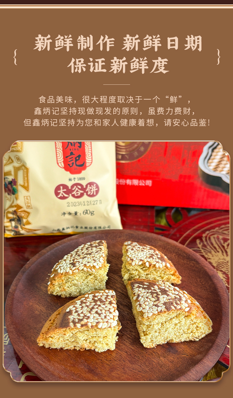 - 鑫炳记始于1859年,历经五代传承,传承百年工艺,从选取原料到烘烤出炉,都严格遵守祖传古方,让百年太谷饼焕发新的魅力。