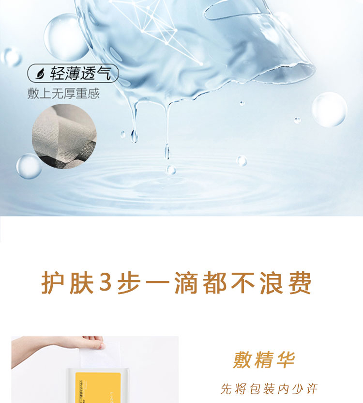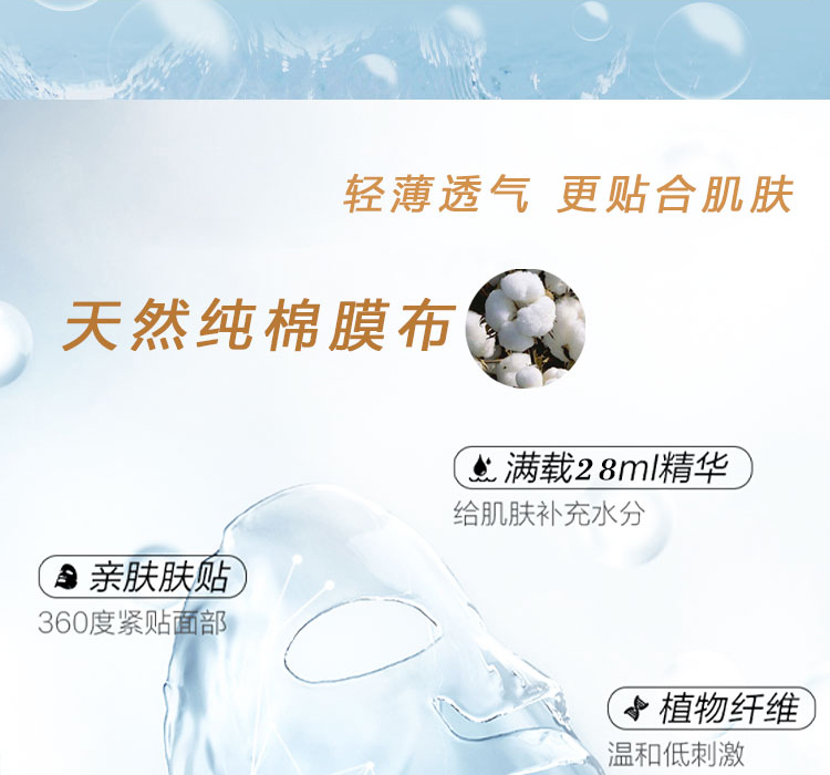 纤细合成纤维,帮助精华摄入,敷在脸上无闷压感,肌肤自由呼吸!轻薄又透气的膜布,贴合不伤肌,伸开也不容易变形,不用担心会闷痘!敷过之后肌肤的每一个毛孔都像被注满了水,一整天肌肤都水润润的