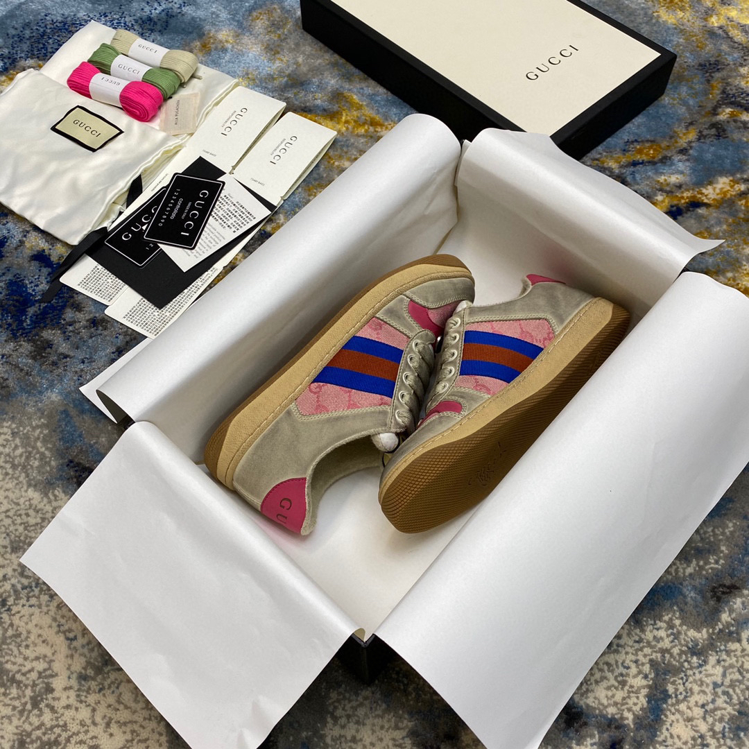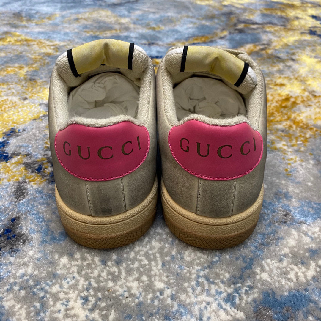 鞋面擦色牛皮拼接经典双G布面料,皮面切口全油边封口工艺,原版毛巾布里细腻柔软更舒适透气,垫脚乳胶注塑一体,私模钢印双色原版TPU大底(下层宽,上层窄)
