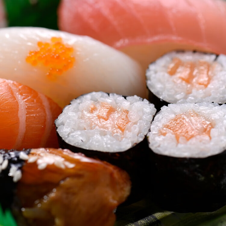 6贯寿司拼盘B约150g 原料生长地:【非海产品】越光米-辽宁丹东;【海产品】三文鱼-挪威;虾-泰国;鳗鱼-福建;鱿鱼-山东;海苔-江苏