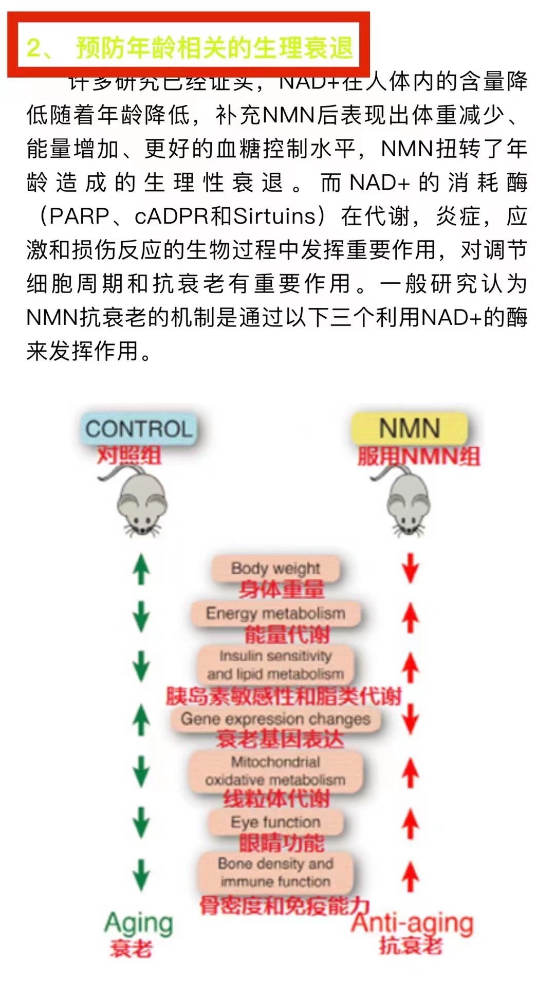 1、支持NAD+产生、延缓衰老;激活Sirtuins长寿蛋白、提升受损细胞DNA修复能力;改善免疫功能、保护大脑健康、保护心脏健康。