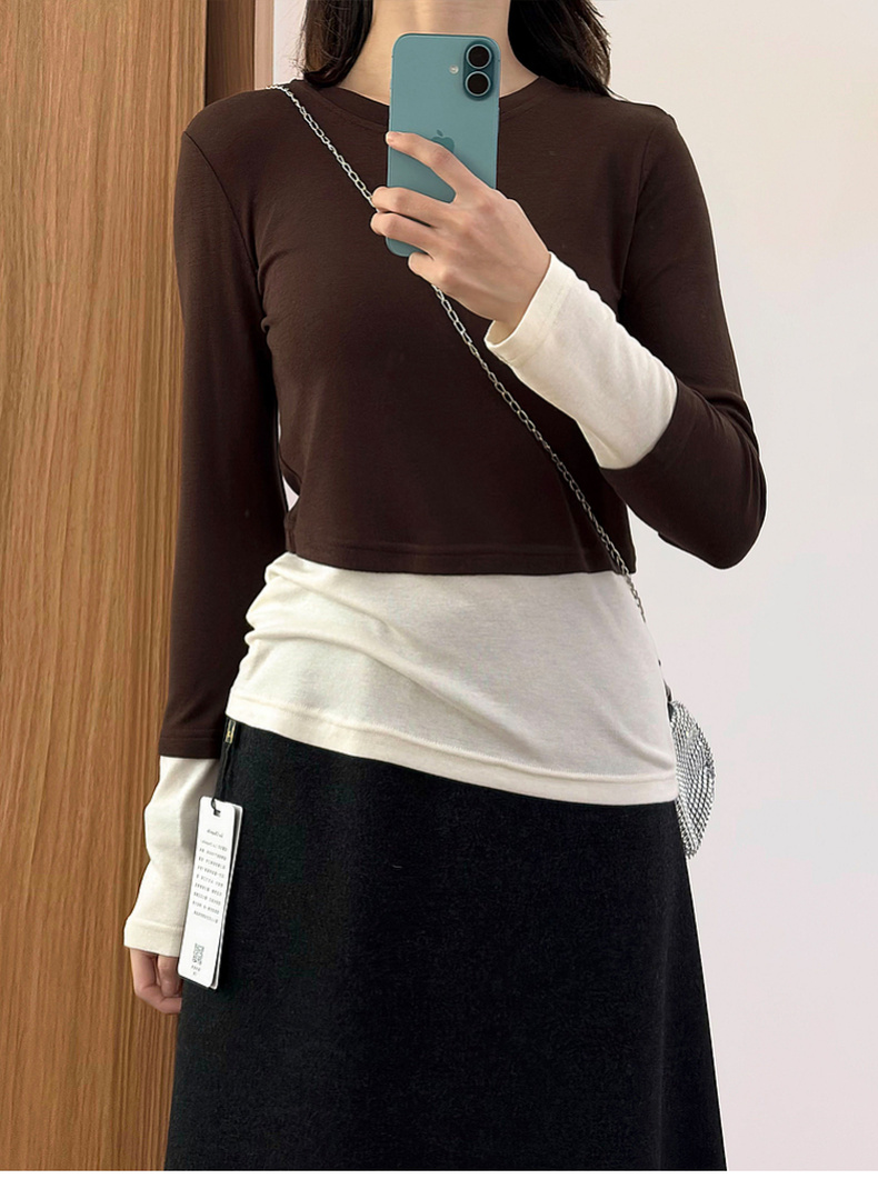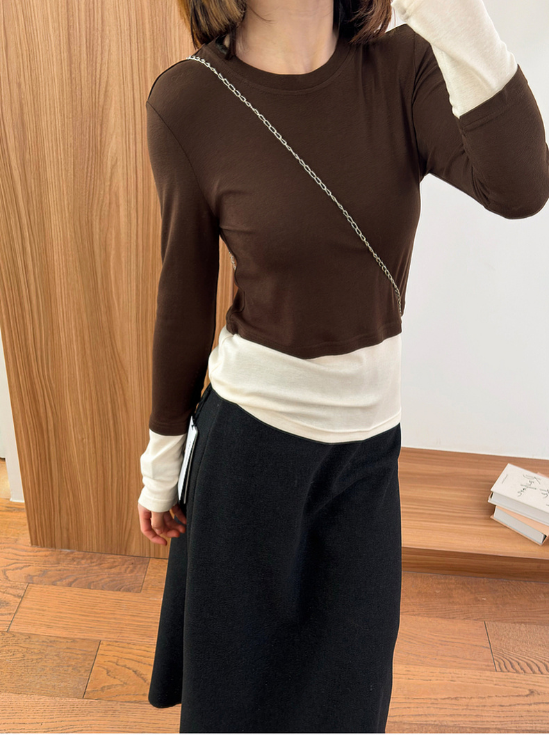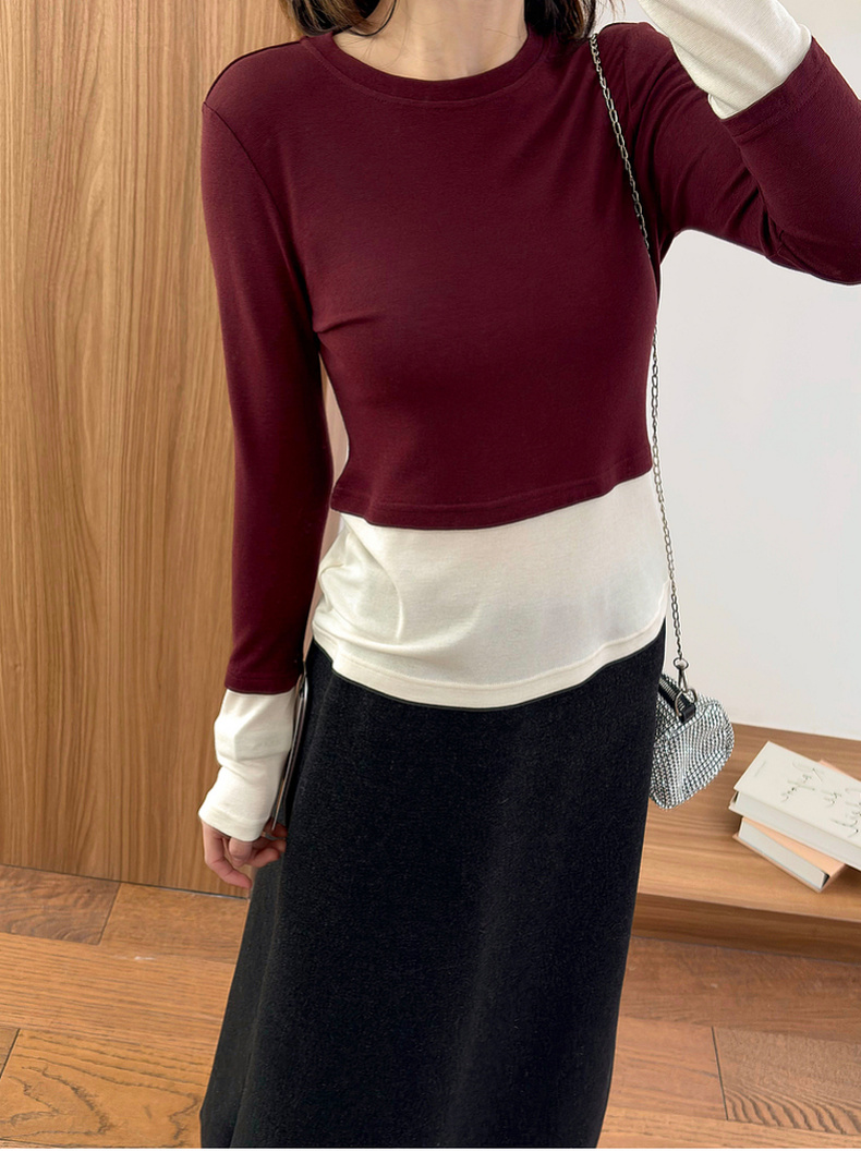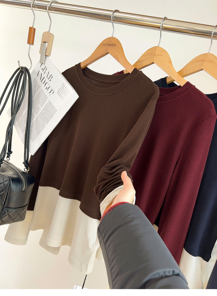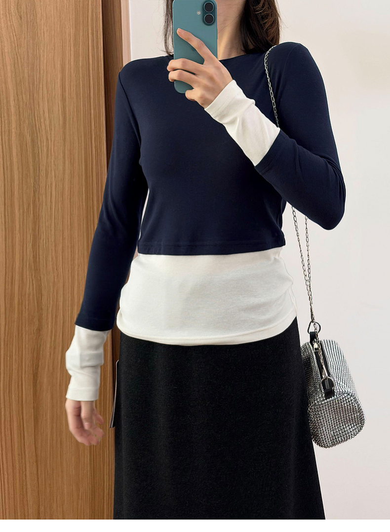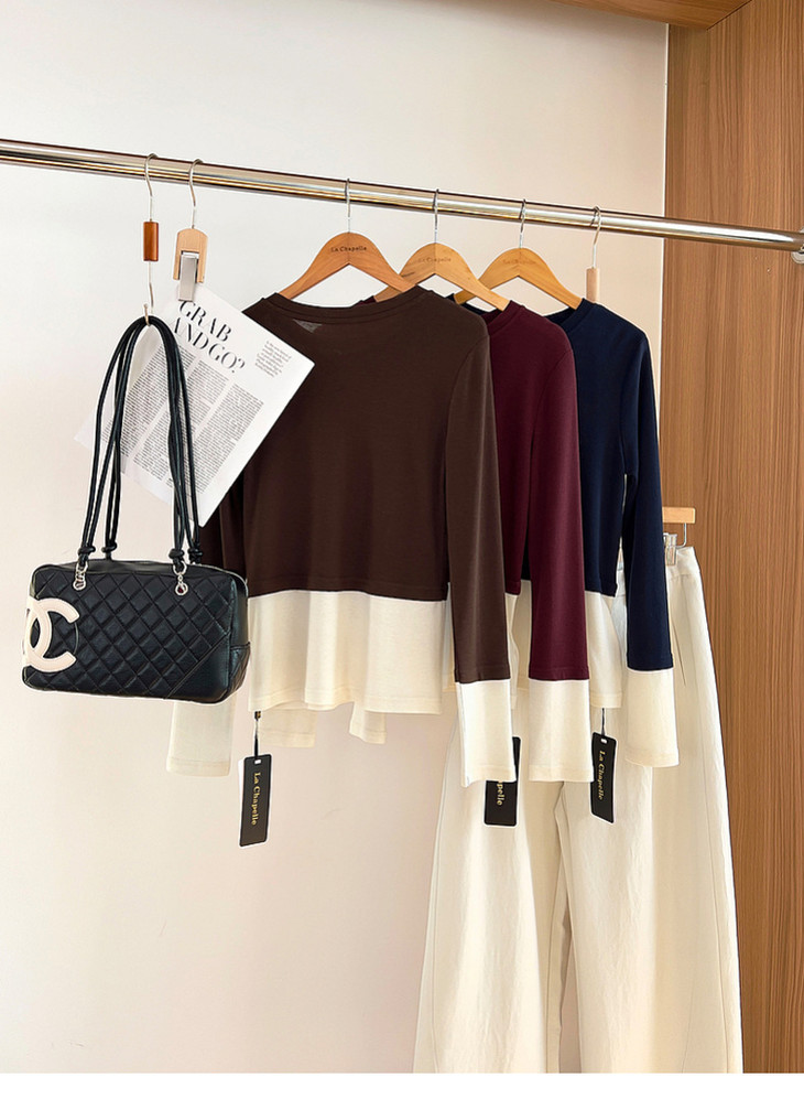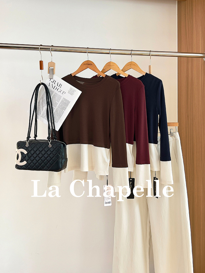 拉夏贝尔/La Chapelle撞色拼接假两件tee弹力修身显瘦长袖打底上衣