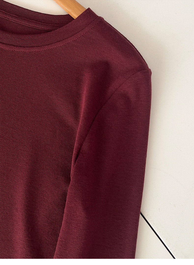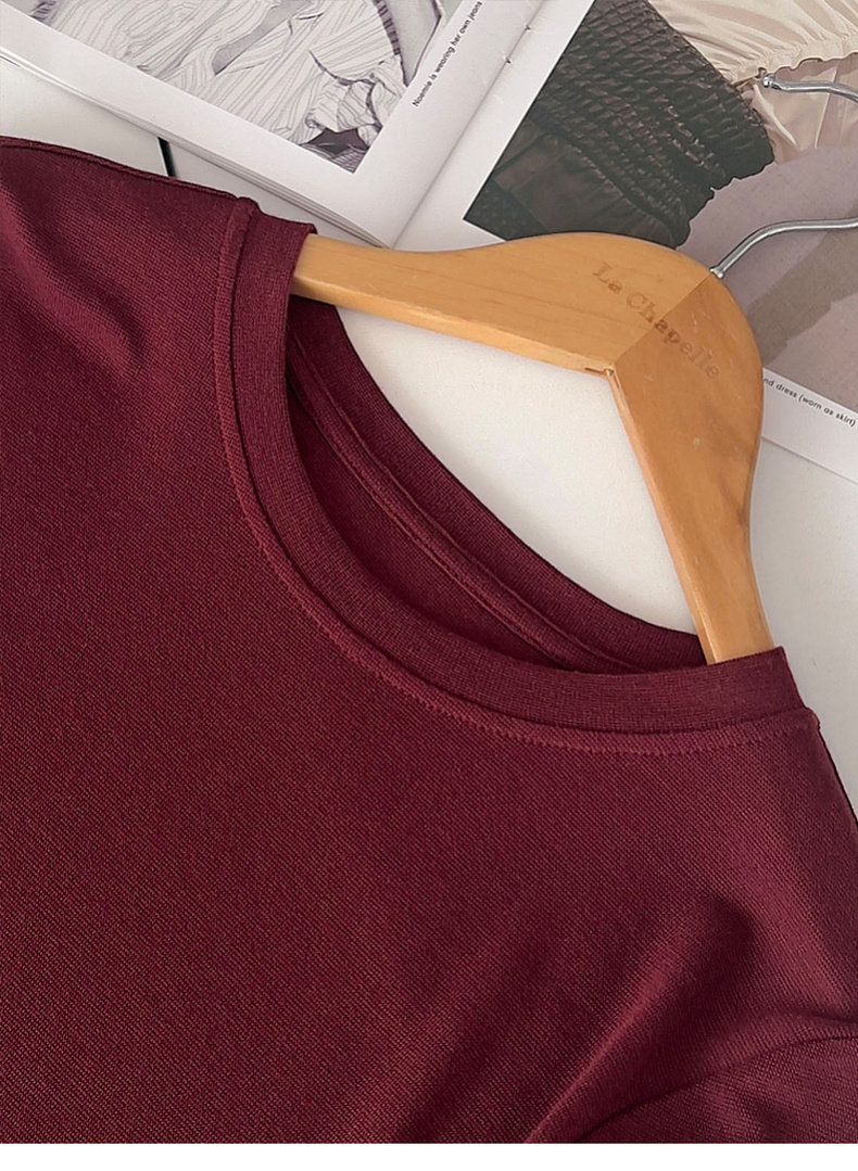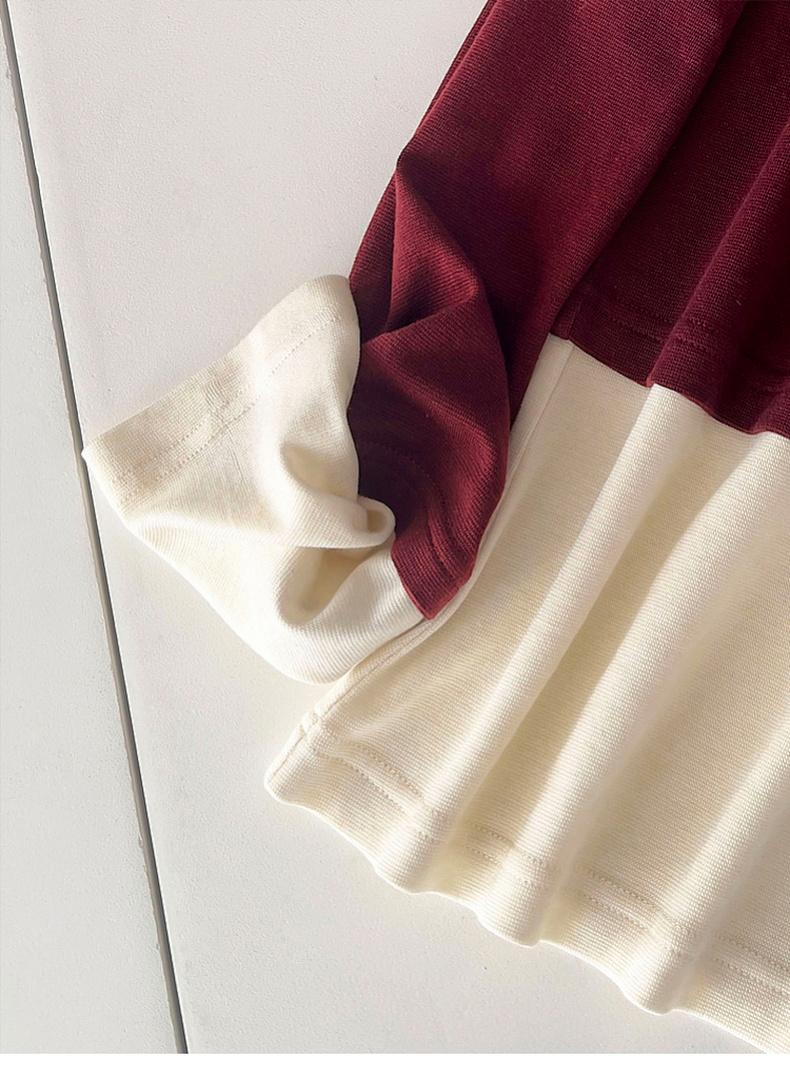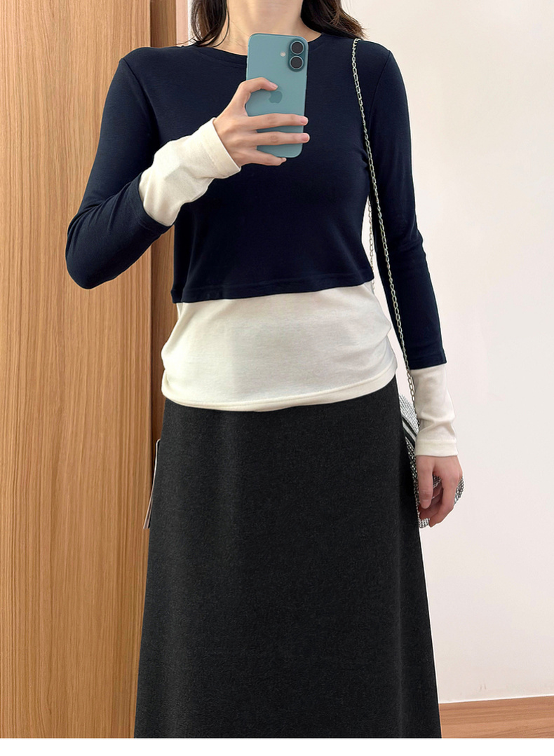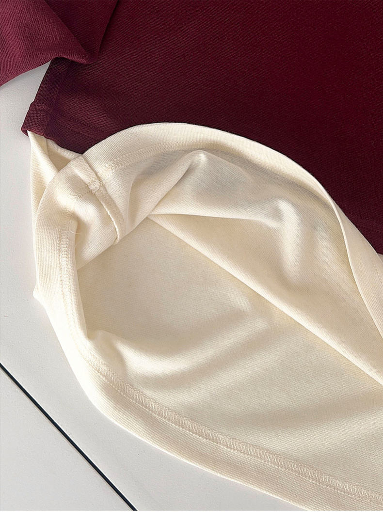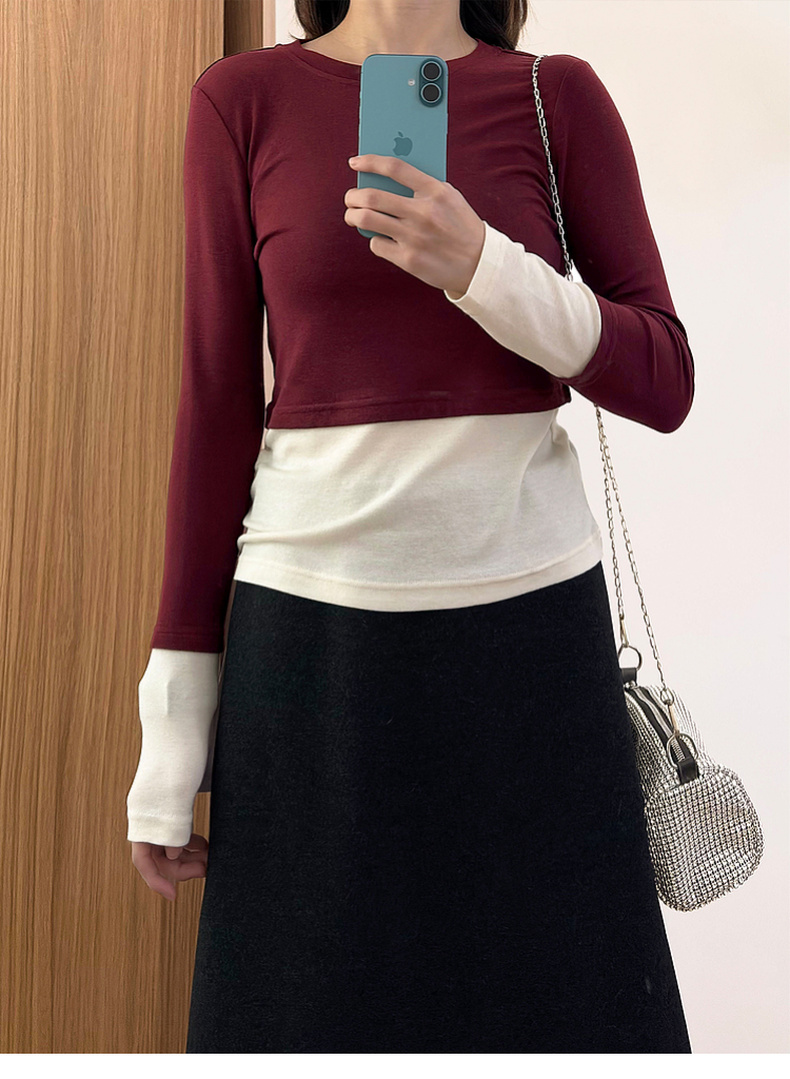 拉夏贝尔/La Chapelle撞色拼接假两件tee弹力修身显瘦长袖打底上衣