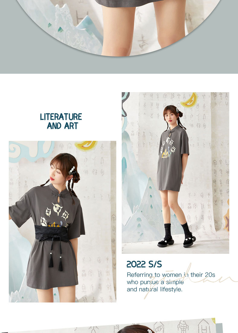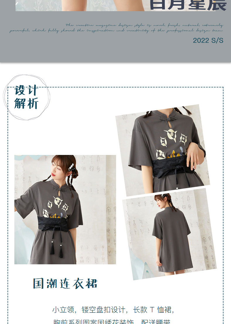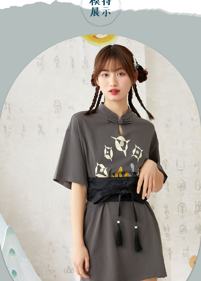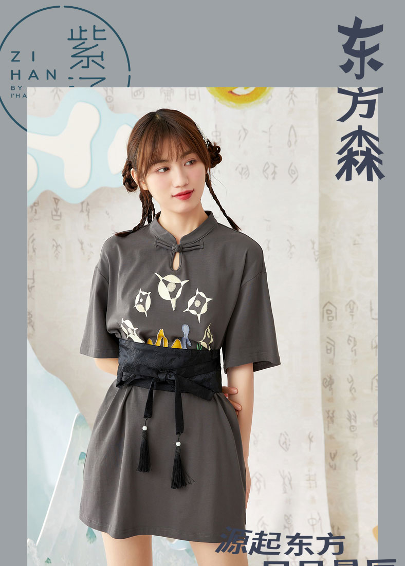 ZIHAN紫涵国风改良T恤裙女2022夏新款立领印花休闲大码裙子附腰封日系Z2Z03DS012