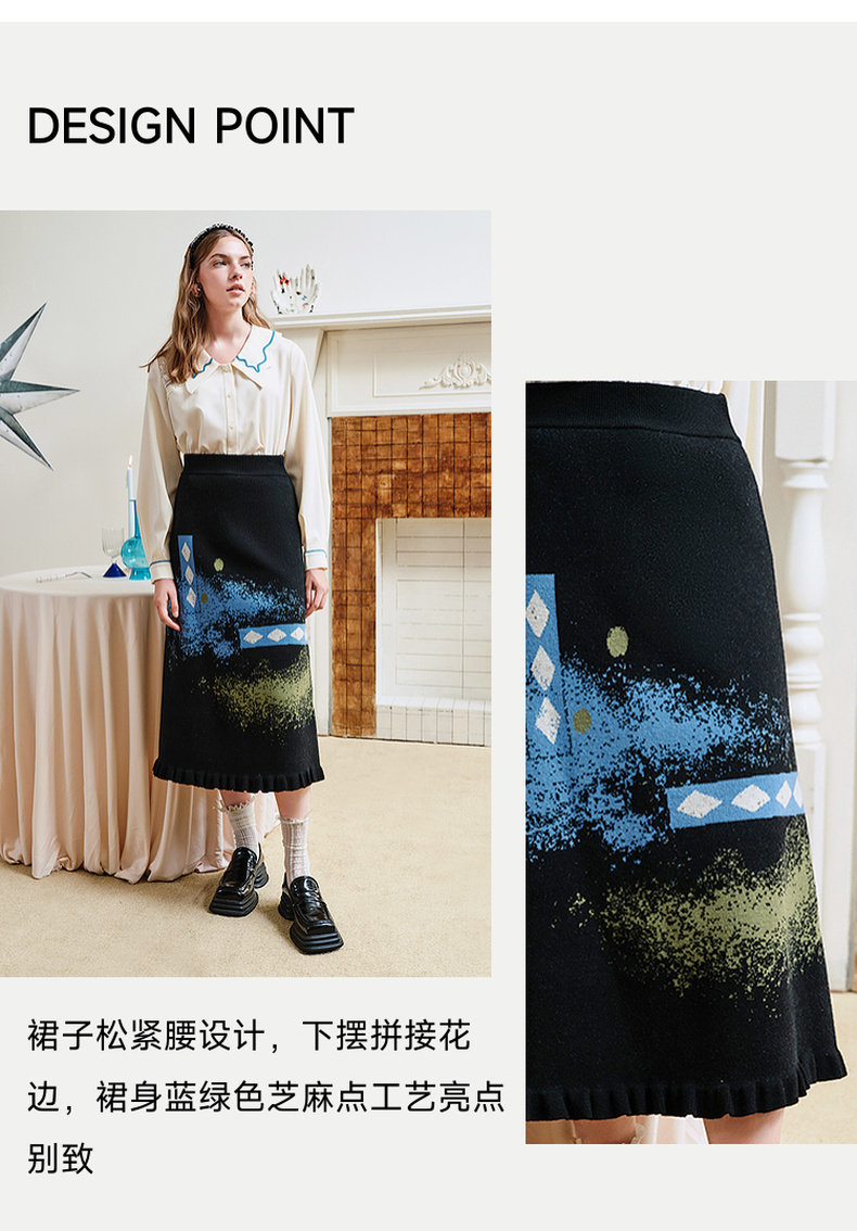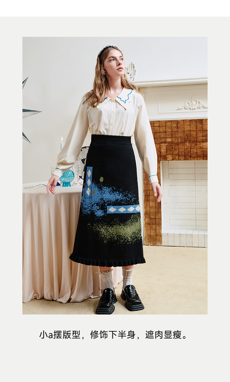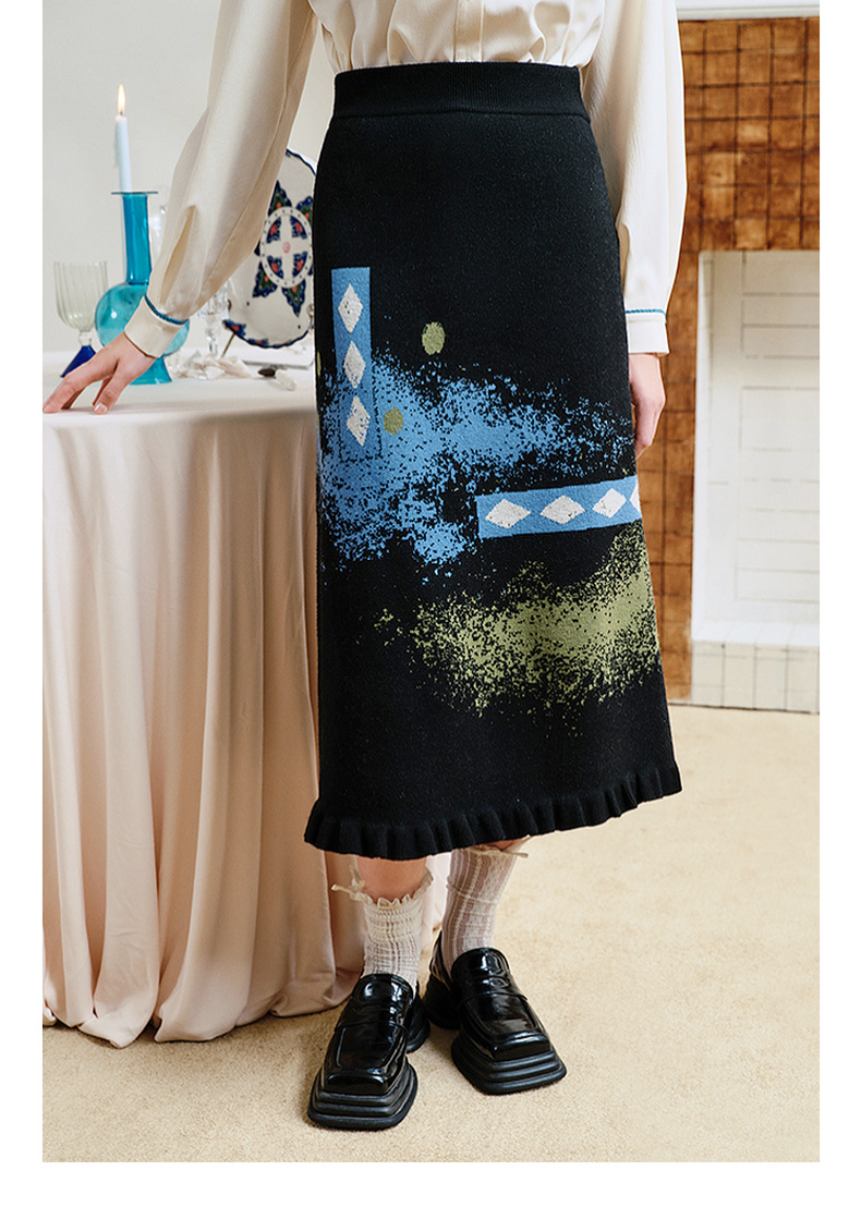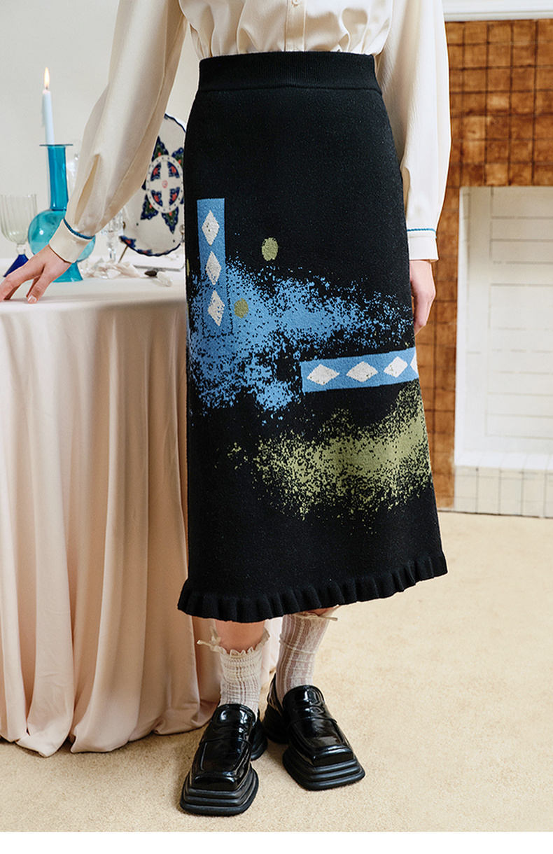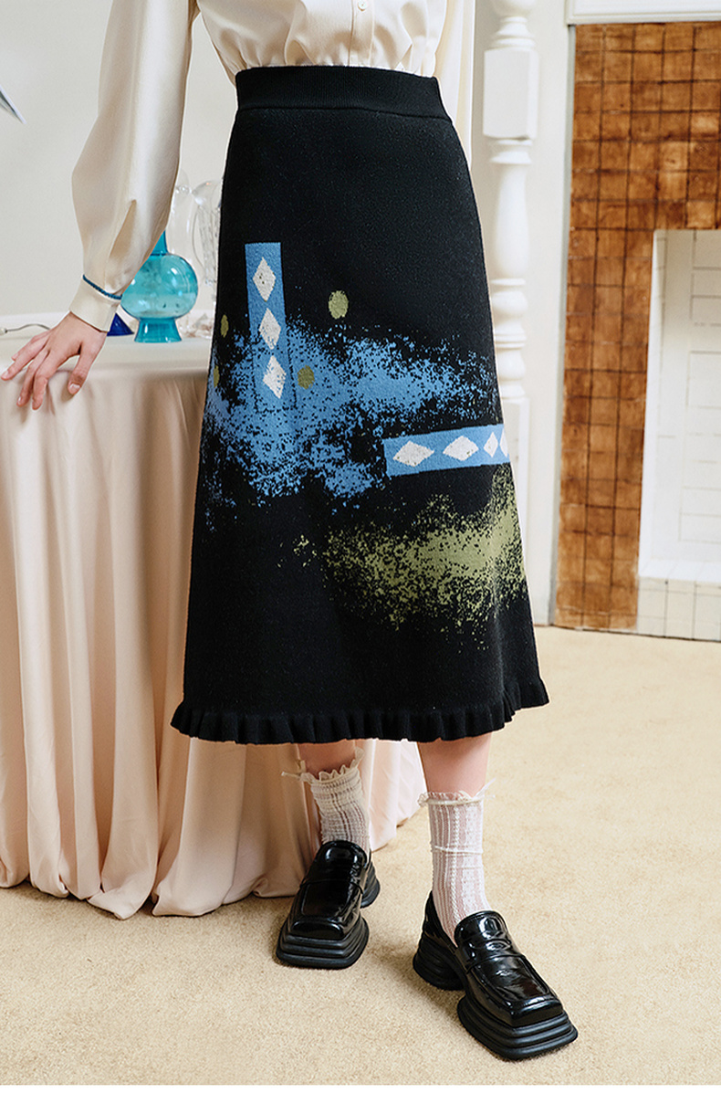 两三事失序派对2024秋季新款复古荷叶边裙摆花色亮点毛织半身裙