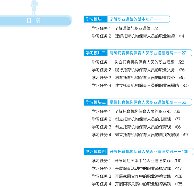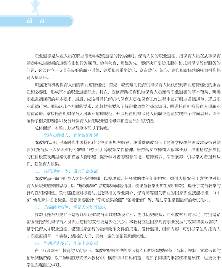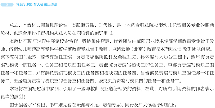 0-3岁是儿童身心发展的关键时期。随着“全面二孩政策”的推进以及国家对早期教育重要性的日益关注与重视,我国儿童早期发展工作迎来难得的战略机遇期。本套丛书依据教育部相关专业教学标准以及相关证书考核标准编写,旨在培养有理想信念、有道德情操、有扎实学识、有仁爱之心,身心健康、具有良好的早期教育专业知识和技能,能够从事0-3岁婴幼儿保育与教育工作的师资。全套教材包括专业基础课、专业核心课、专业拓展课三大类,重点突出医教融合、课证融通的特色。《托育机构保育人员职业道德》着重围绕职业道德概述、托育机构保育人员职业道德范畴、托育机构保育人员职业道德规范、托育机构保育人员职业道德实践四部分展开论述,每部分论述注重理实一体、体现职业特色,让学生在学习职业道德基本理论的同时,能结合案例导入、职业场景思考及运用,实现从理论到感悟到实践的成长。
