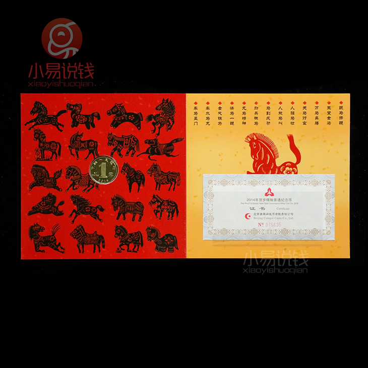 “2014马年贺岁精制币卡册”。中国人民银行授权康银阁装帧,装帧量180000套。