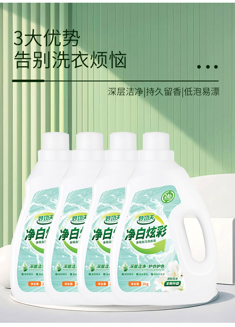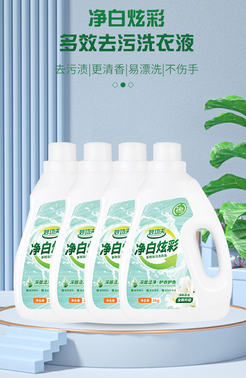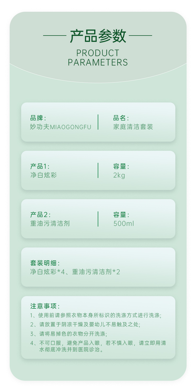 【自营】妙功夫 家清组合(净白炫彩多效去污洗衣液2kg*4+重油污清洗剂500ml*2)