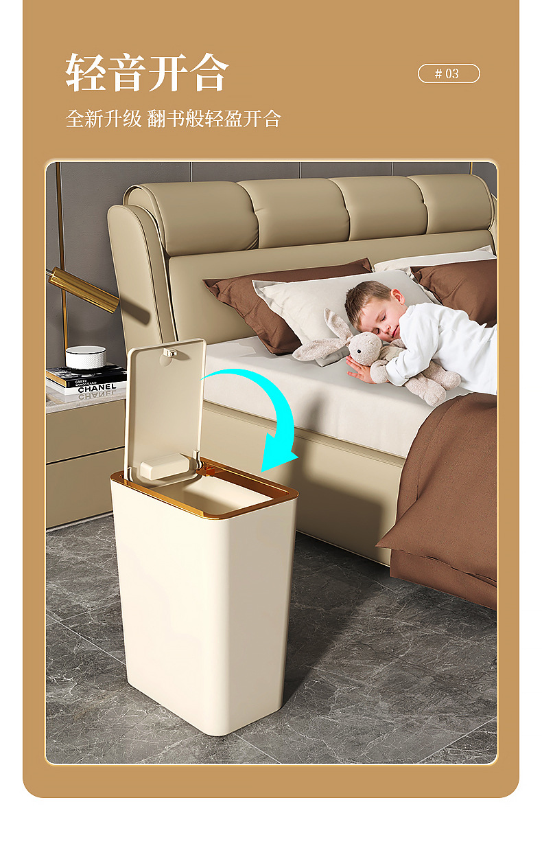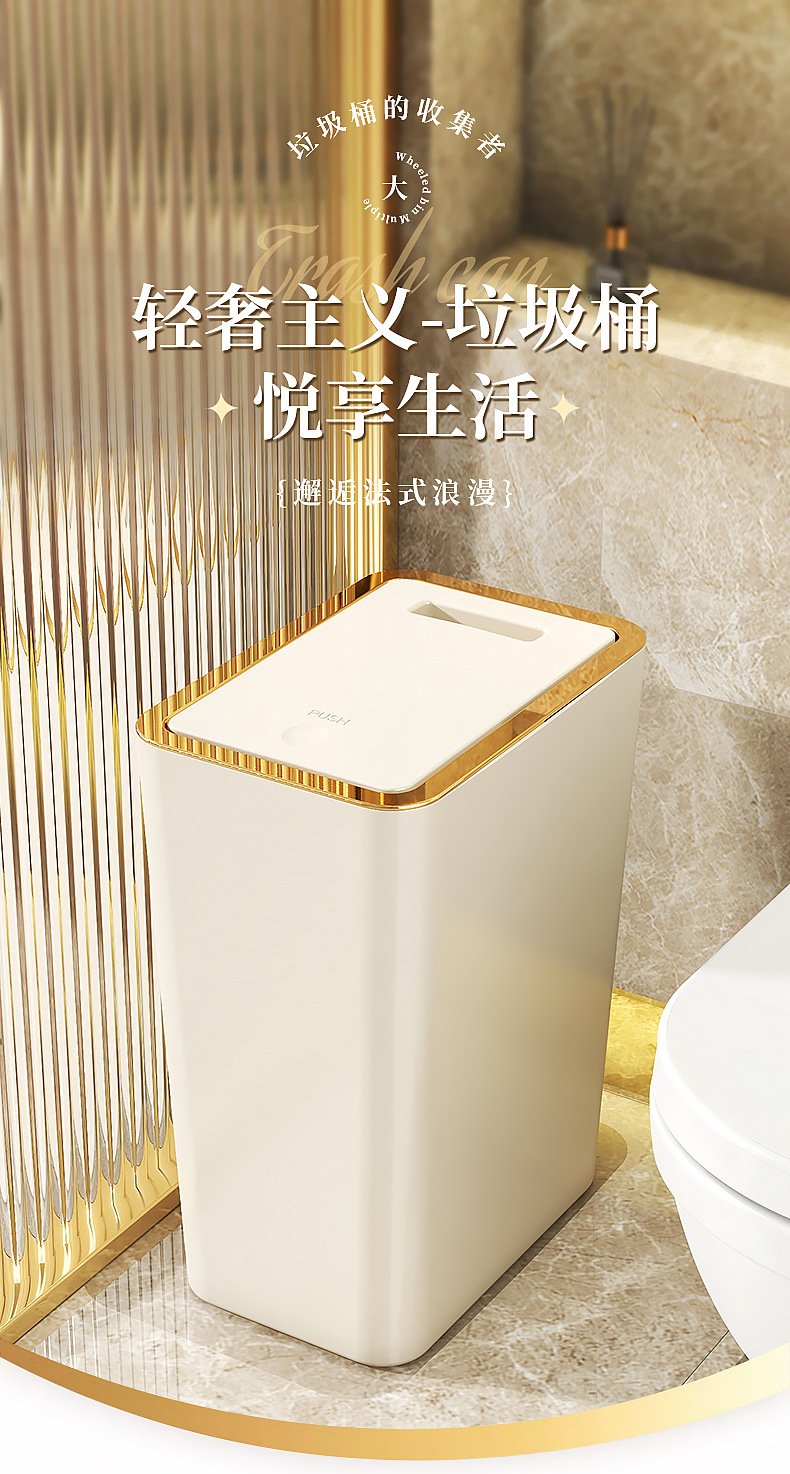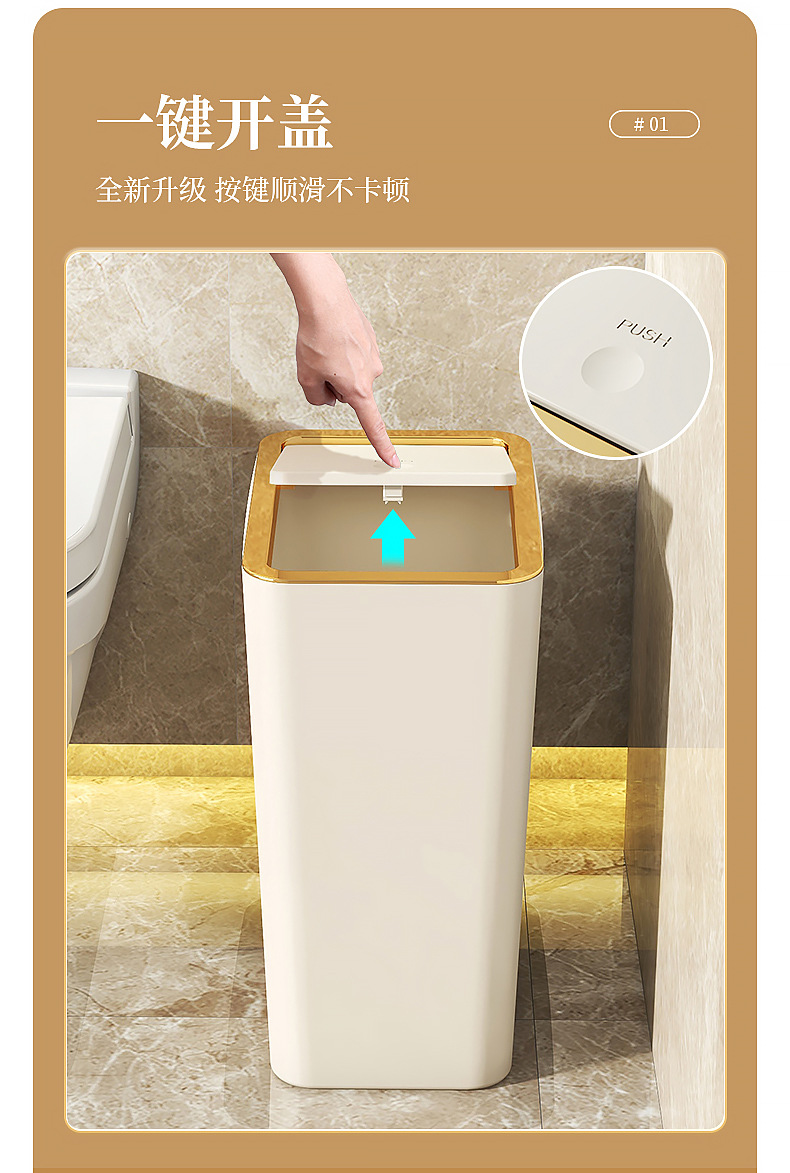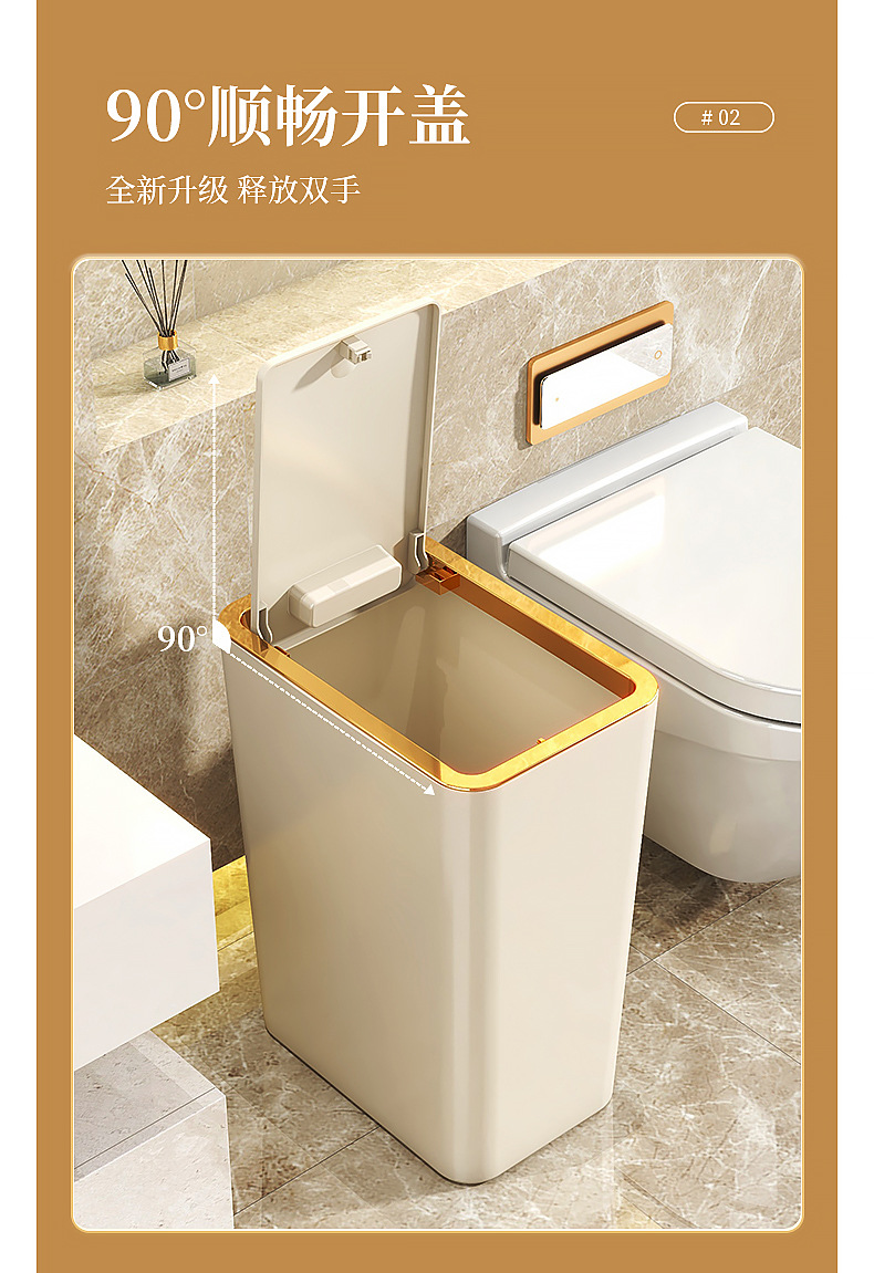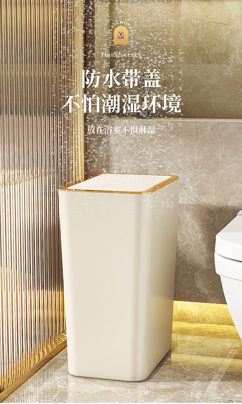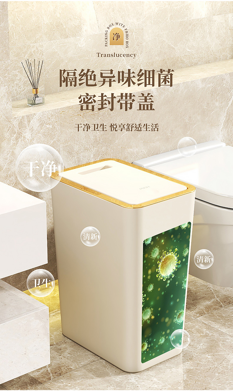「释放双手,开启清新生活。」高颜值大号盖密封垃圾桶,90°顺畅开盖,静音为你排忧解难,不只是卫生间的好帮手,更是生活中的精致小物!