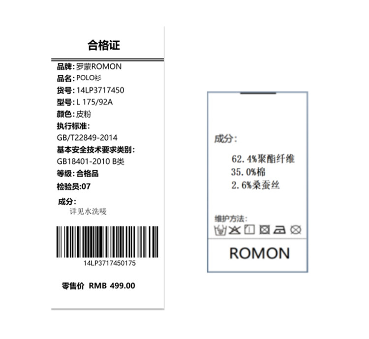 面料:62.4%聚酯纤维 35.0%棉 2.6%桑蚕丝