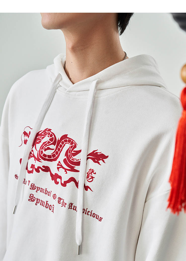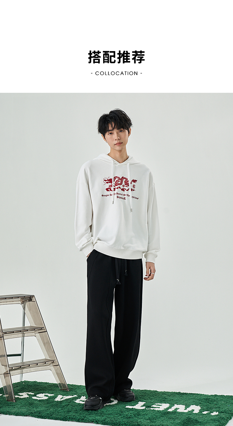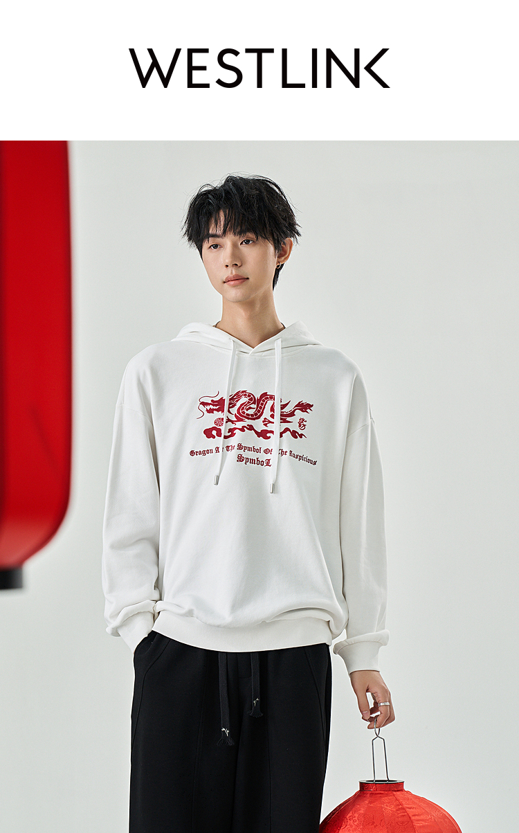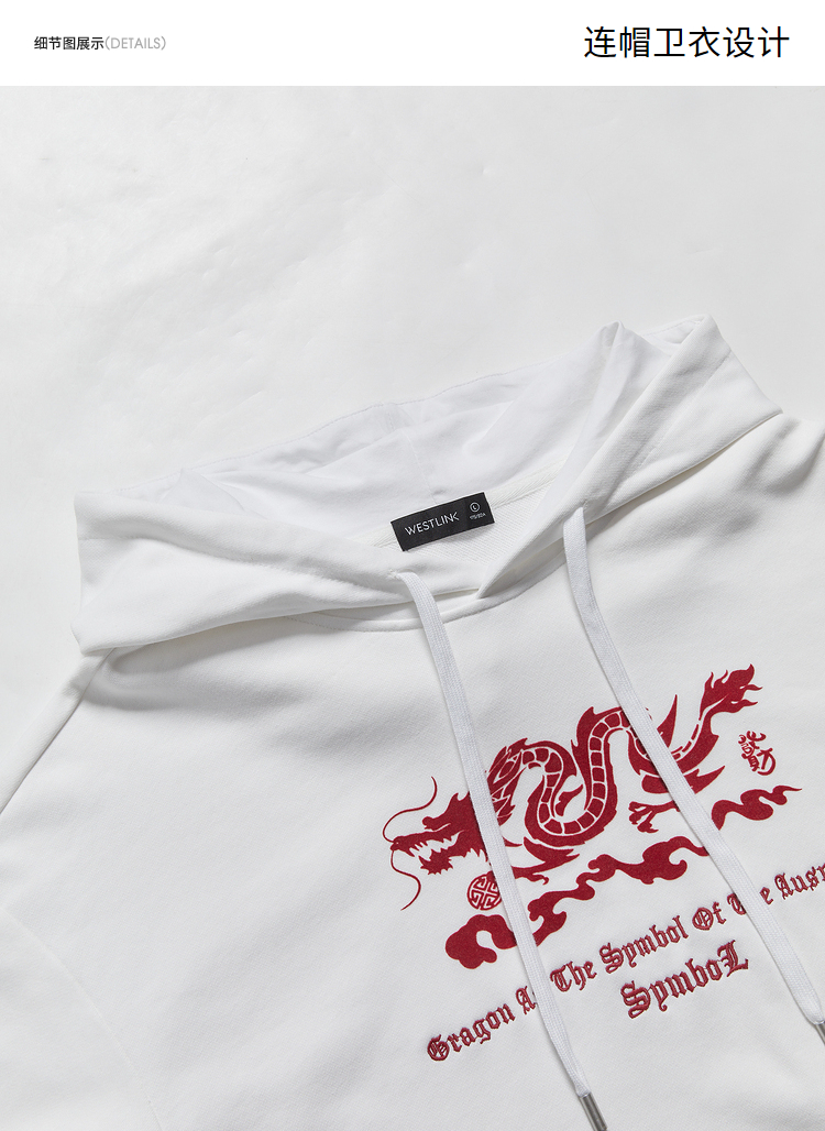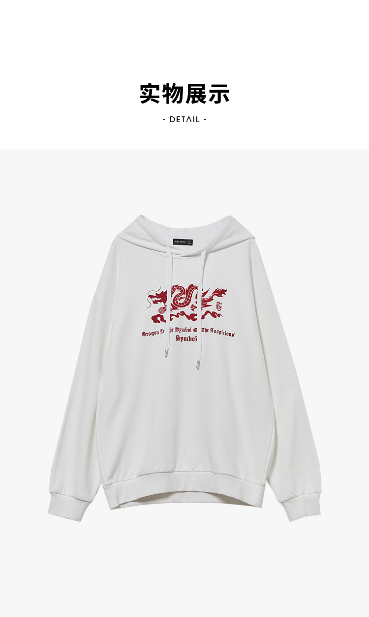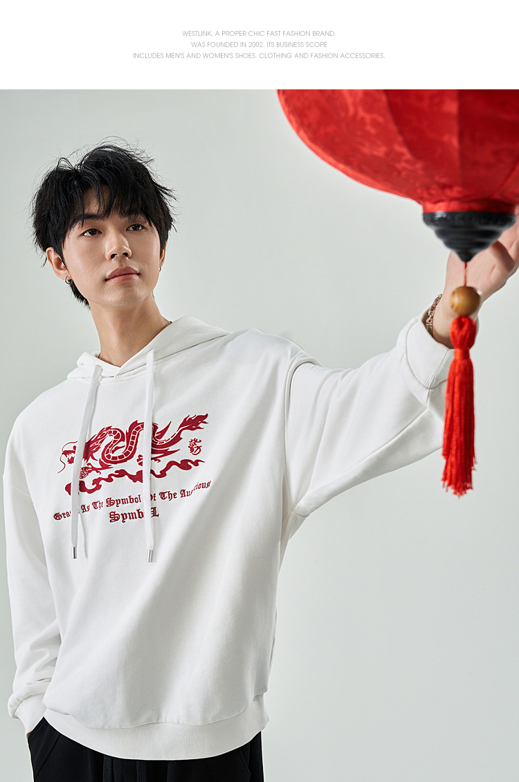 西遇白色连帽国潮宽松卫衣男新款绣花图案长袖基础款上衣10345704