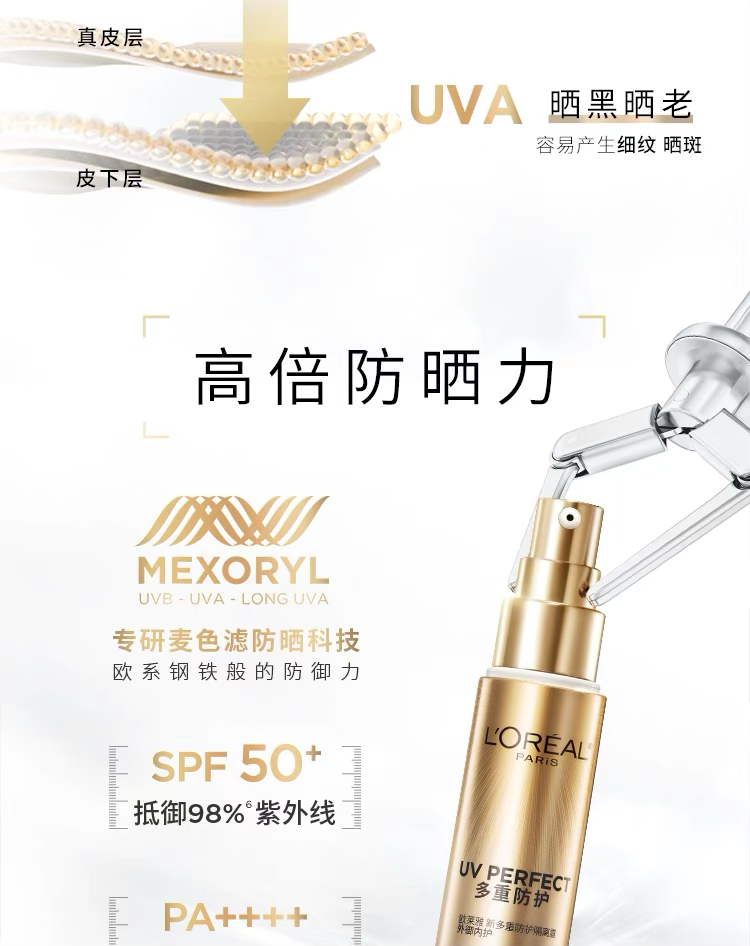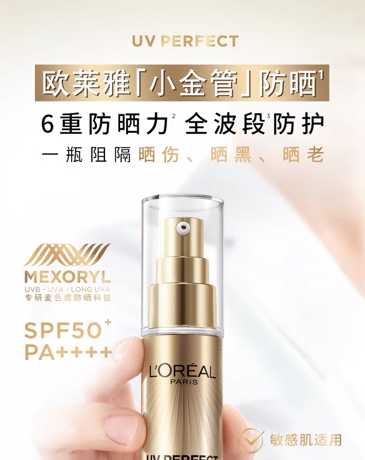 欧莱雅小金管外御内护30ml容量SPF50+PA++++防晒隔离霜防晒乳