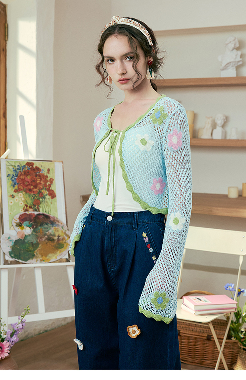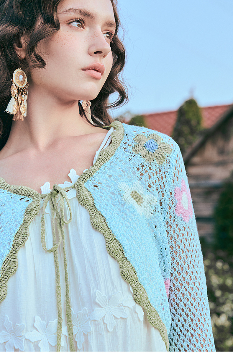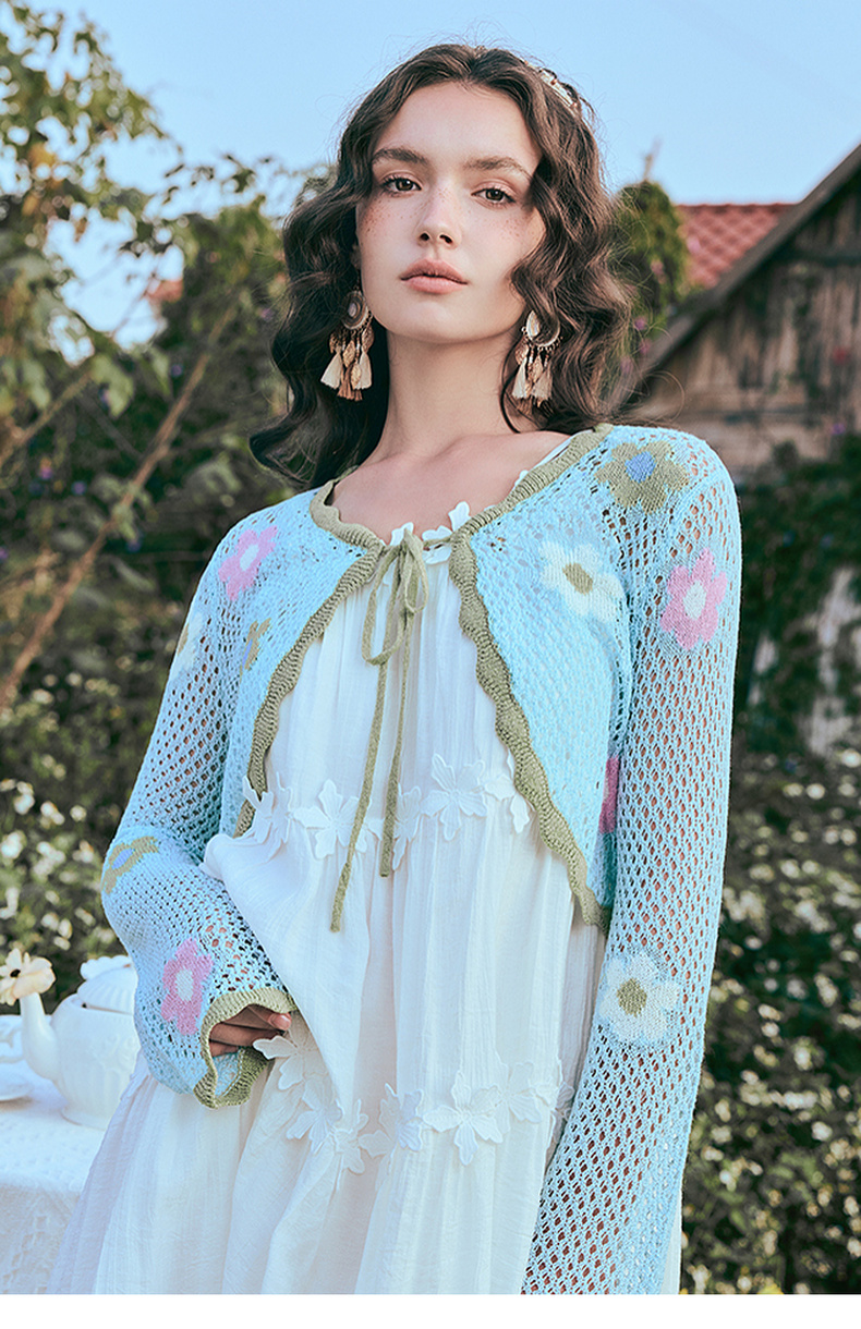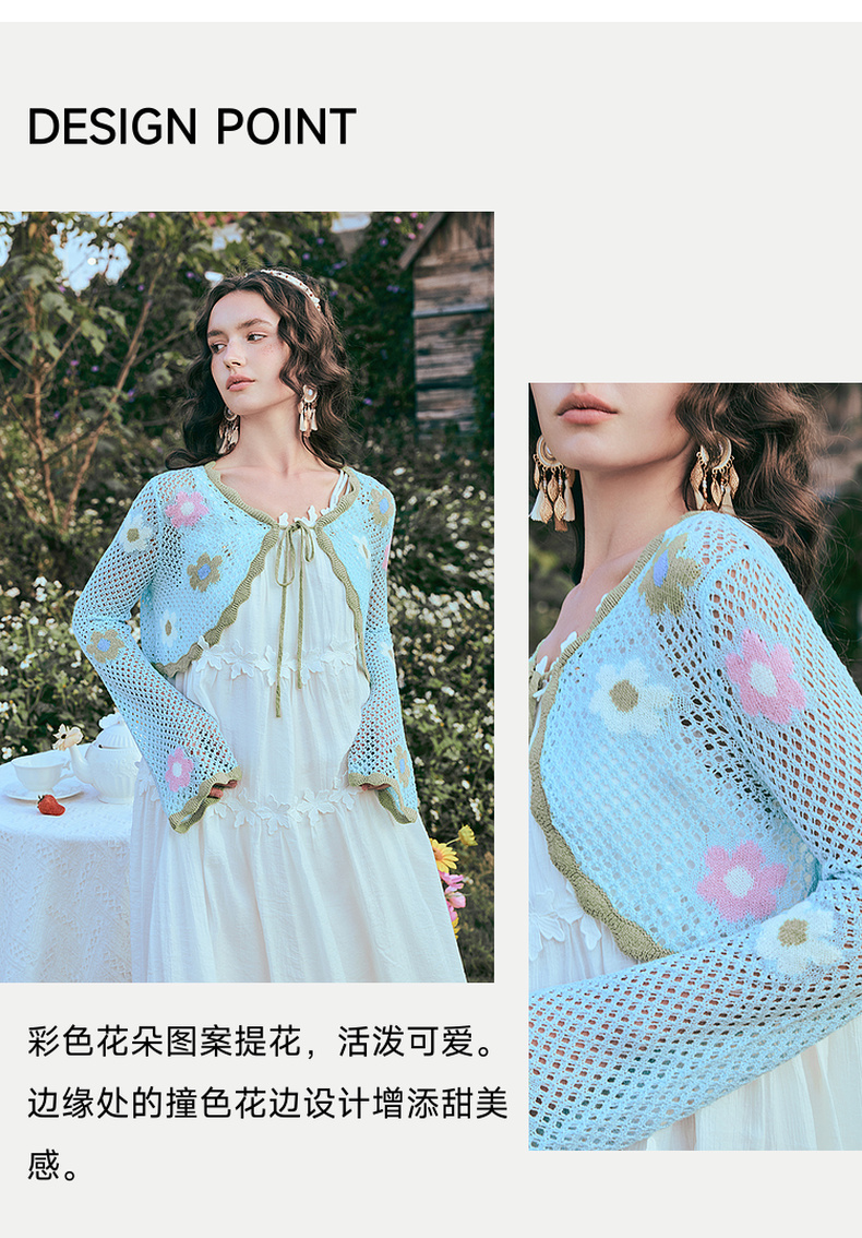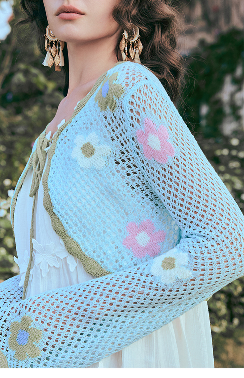 两三事 春花明媚 2025春季新款小清新花朵图案绑带镂空针织开衫女