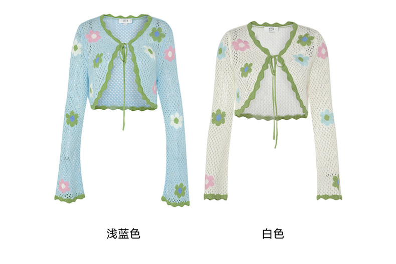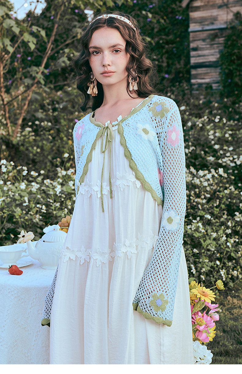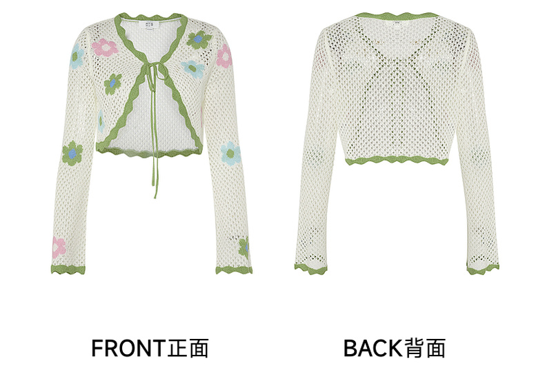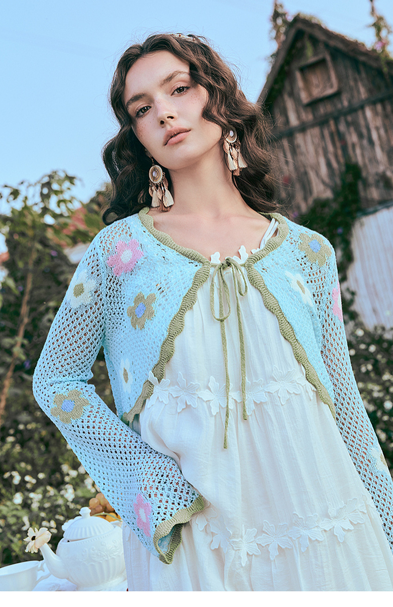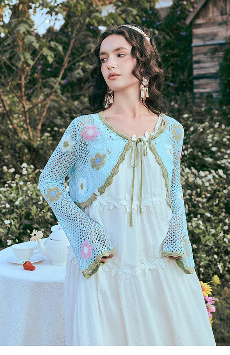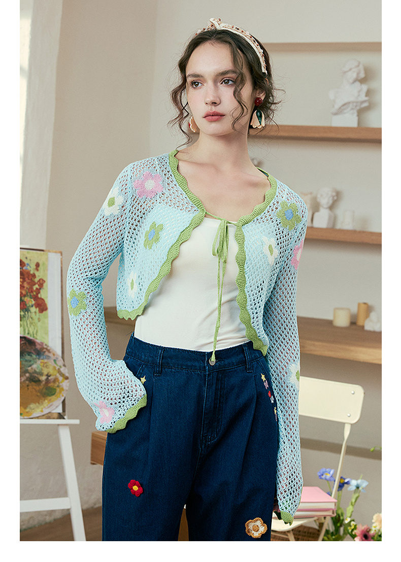 两三事 春花明媚 2025春季新款小清新花朵图案绑带镂空针织开衫女
