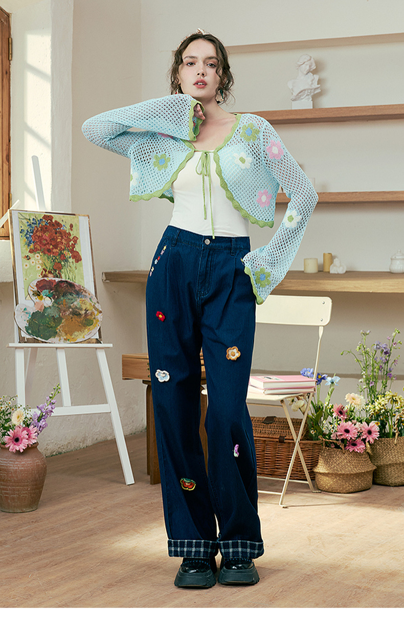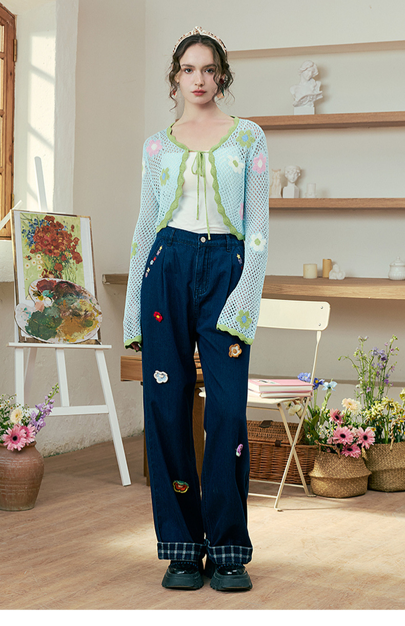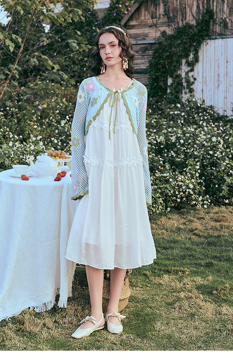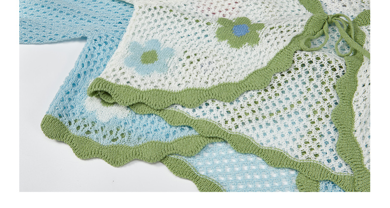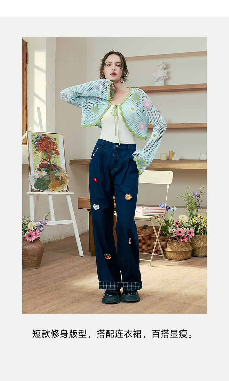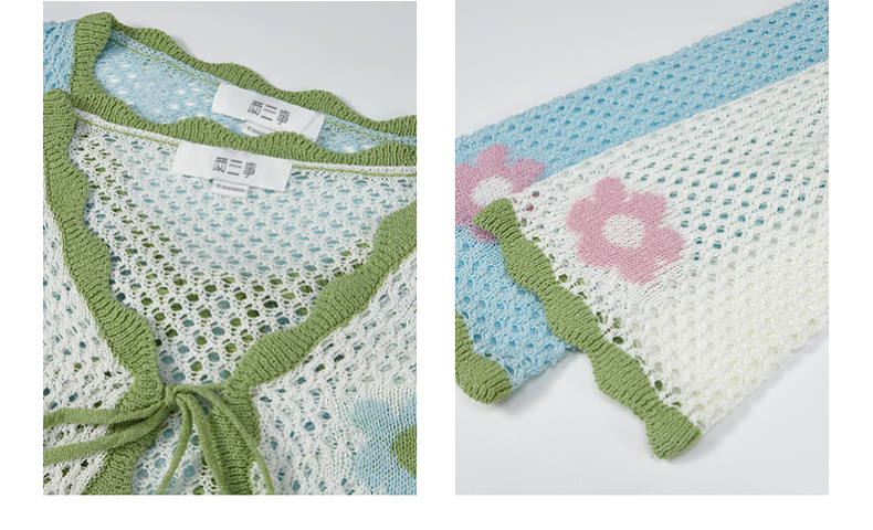 两三事 春花明媚 2025春季新款小清新花朵图案绑带镂空针织开衫女