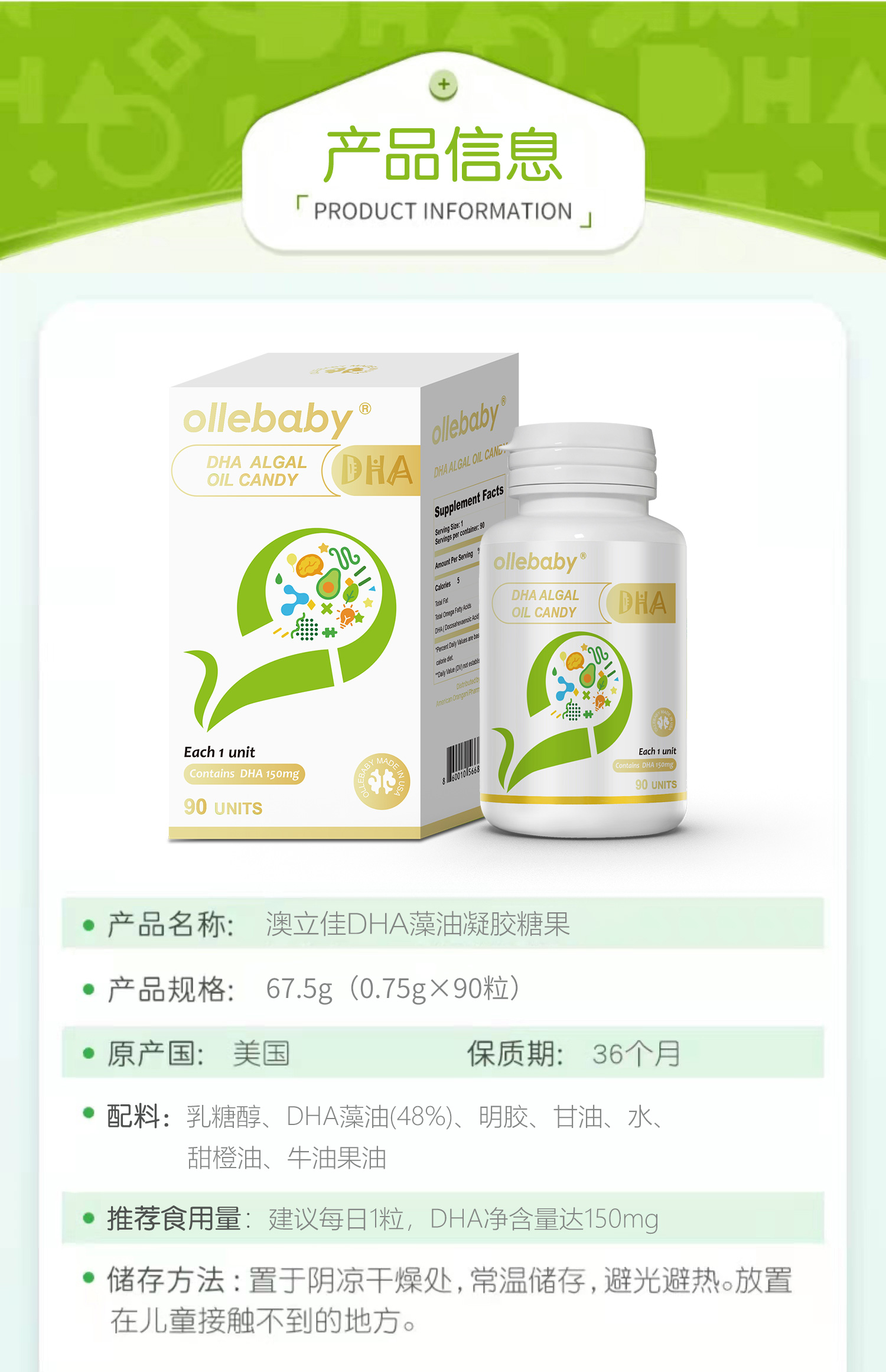 澳立佳DHA婴幼儿海藻油美国原装进口150mg 90粒