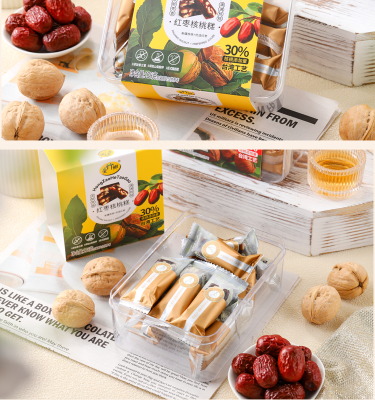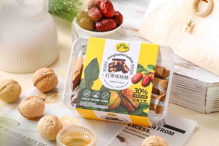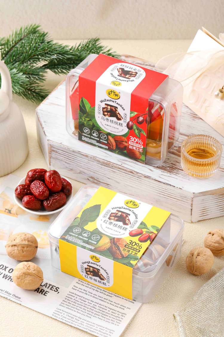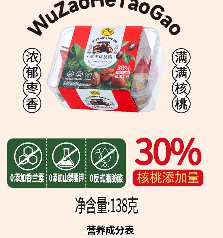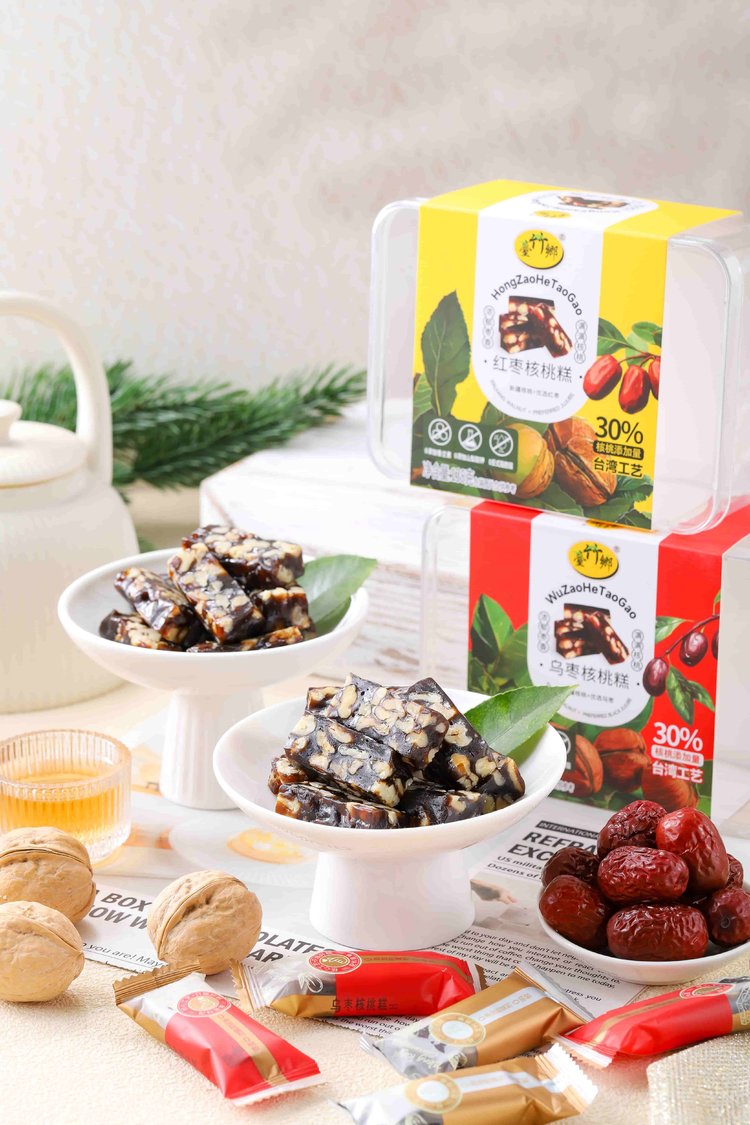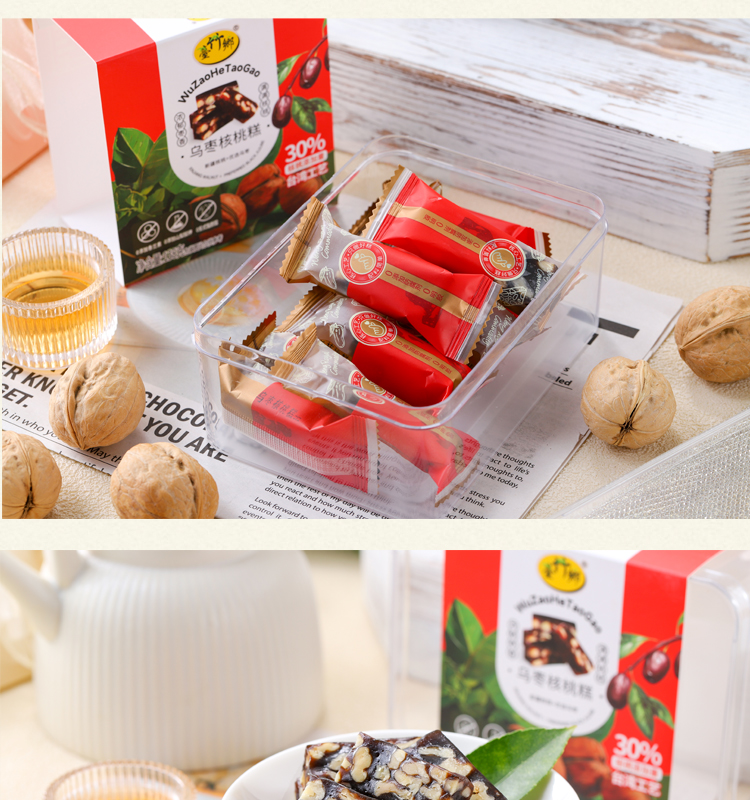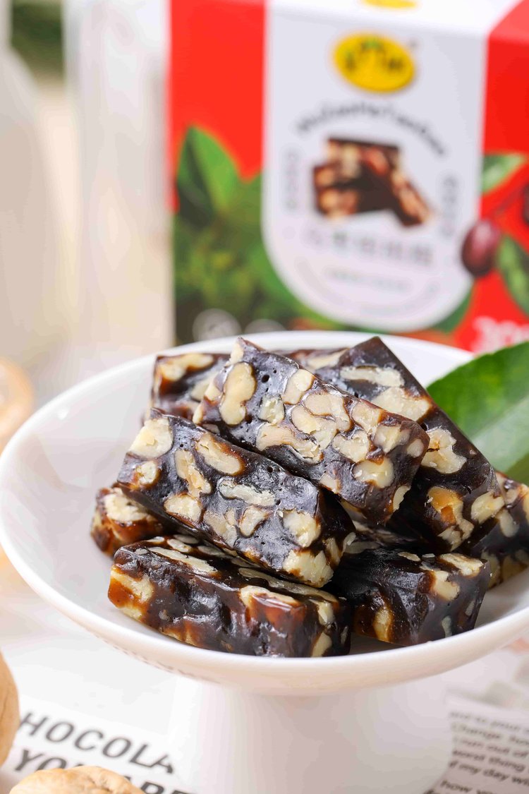 乌枣核桃糕:麦芽浆、核桃仁(30%),乌枣泥(30%),海藻糖、食用淀粉、水