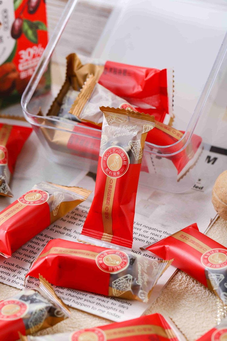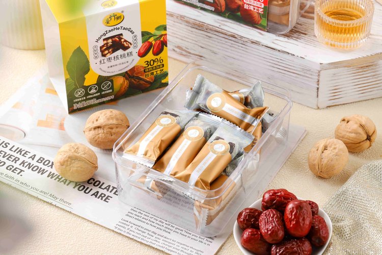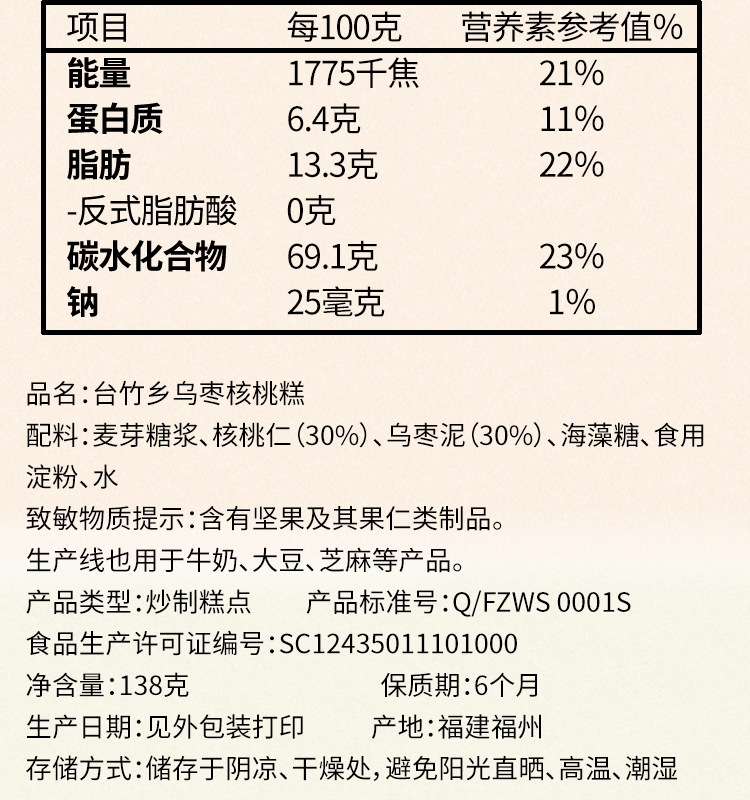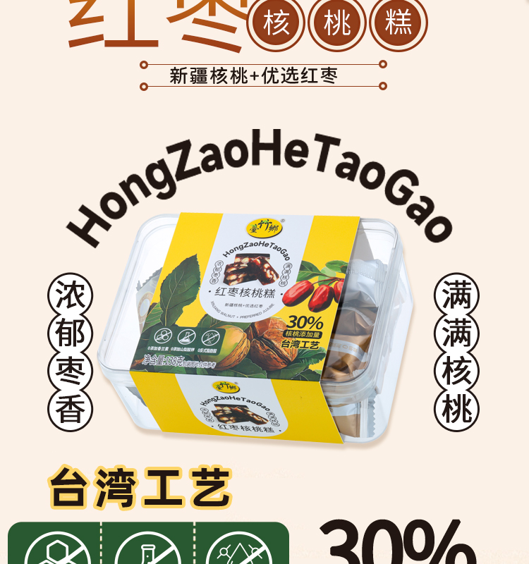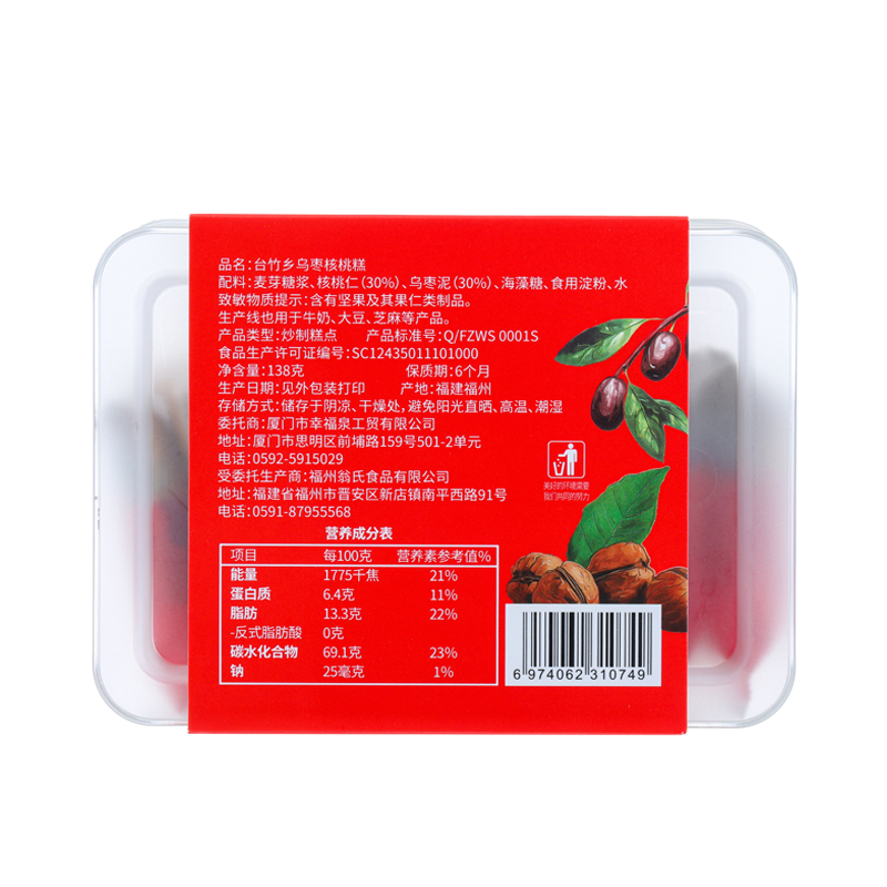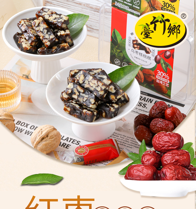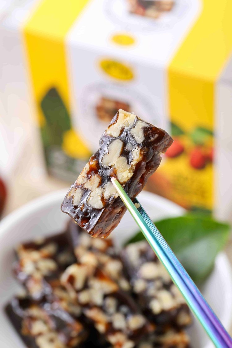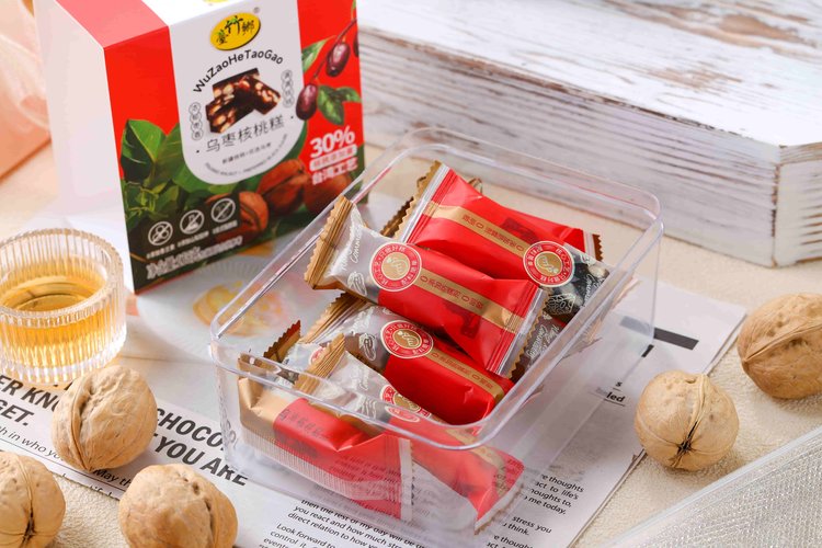 乌枣核桃糕:麦芽浆、核桃仁(30%),乌枣泥(30%),海藻糖、食用淀粉、水