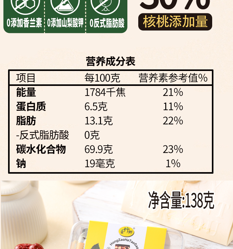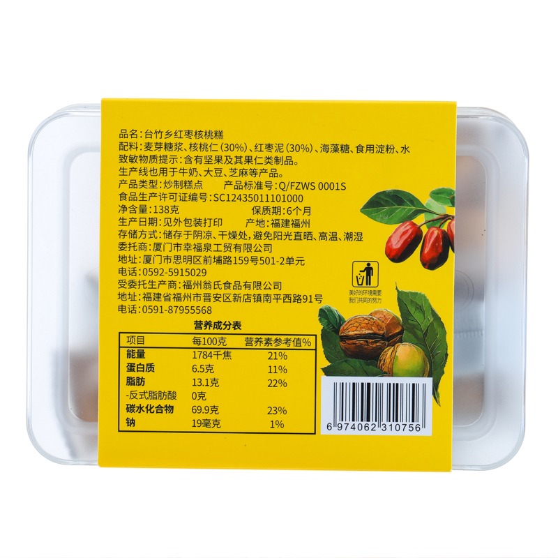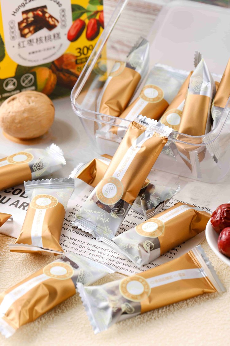 配料表 :红枣核桃糕:麦芽精浆、核桃仁(30%)、红枣泥(30%)、海藻糖、食用淀粉、水